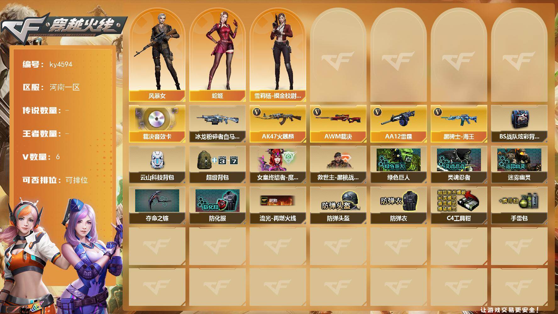 [16100170]河南一区-6V-0王者-0炫金 【传说角色】:传说星骇 【音效卡】:AWM-裁决音效卡 【角色】:风暴女,蛇姬,雪莉杨-摸金校尉 【挑战大师】:冰龙粉碎者-白马银枪 【英雄级武器】:AK47-火麒麟,黑骑士-海王,AWM-裁决,AA-12-雷霆 【道具】:BS战队炫彩背包,云山科技背包,超级背包,女皇终结者-魔龙之吻,救世主-黑桃战神,绿色巨人,灵魂忍者,迷雾幽灵,夺命之镰,防化服*3,流光-再燃火线,防弹头盔*3,防弹衣*3,C4工具钳*3,手雷包*3 【特殊枪械】:
