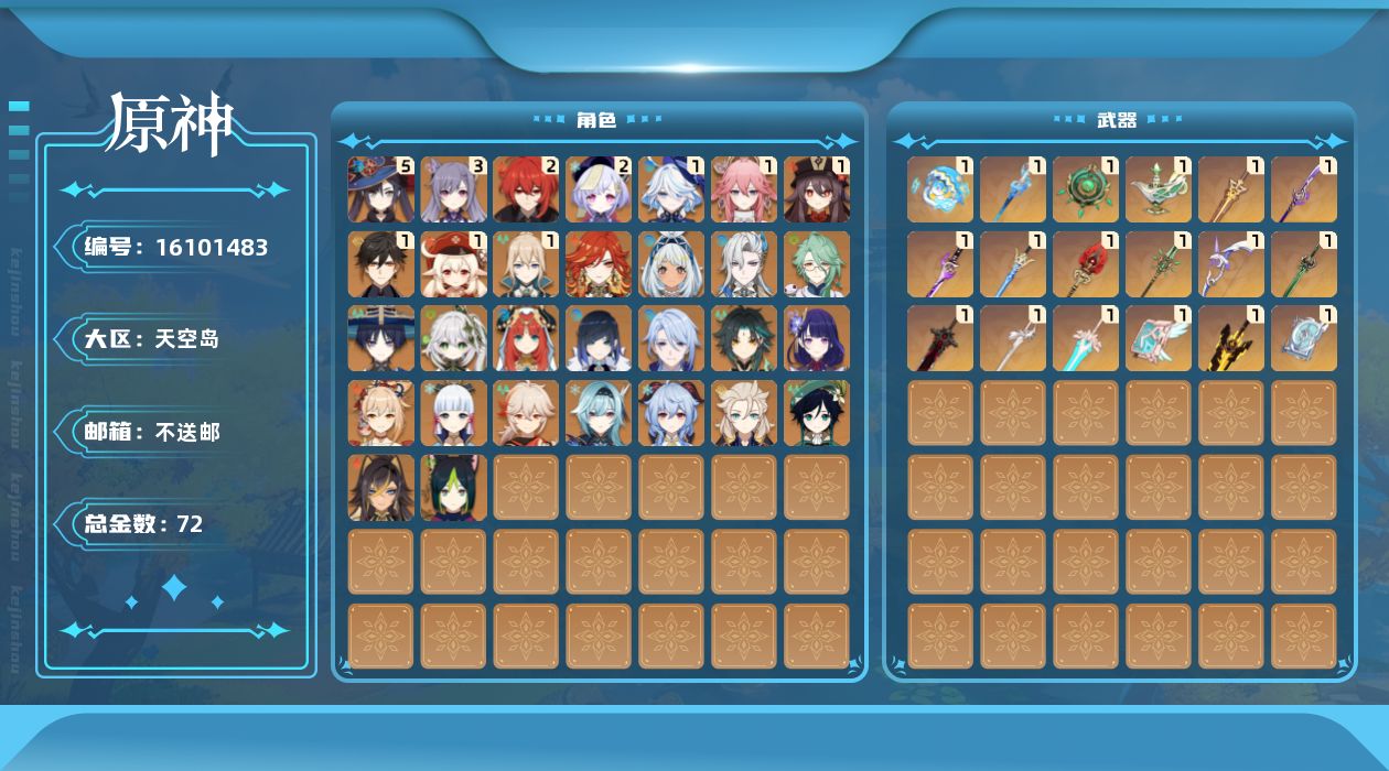 1命芙宁娜,0命那维莱特,0命白术,0命迪希雅,0命流浪者,0命纳西妲,0命妮露,0命提纳里,0命夜兰,0命神里绫人,1命八重神子,0命优菈,0命雷电将军,0命枫原万叶,0命神里绫华,1命钟离,1命胡桃,0命甘雨,0命魈,0命宵宫,0命温迪,1命可莉,0命阿贝多,3命刻晴,2命七七,1命琴,5命莫娜,2命迪卢克,0命玛拉妮,0命玛薇卡,精1静水流涌之辉,精1碧落之珑,精1千夜浮梦,精1圣显之钥,精1薙草之稻光,精1雾切之回光,精1苍古自由之誓,精1无工之剑,精1护摩之杖,精1磐岩结绿,精1四风原典,精1和璞鸢,精1阿莫斯之弓,精1天空之卷,精1风鹰剑,精1狼的末路,精1天空之傲,精1冲浪时光