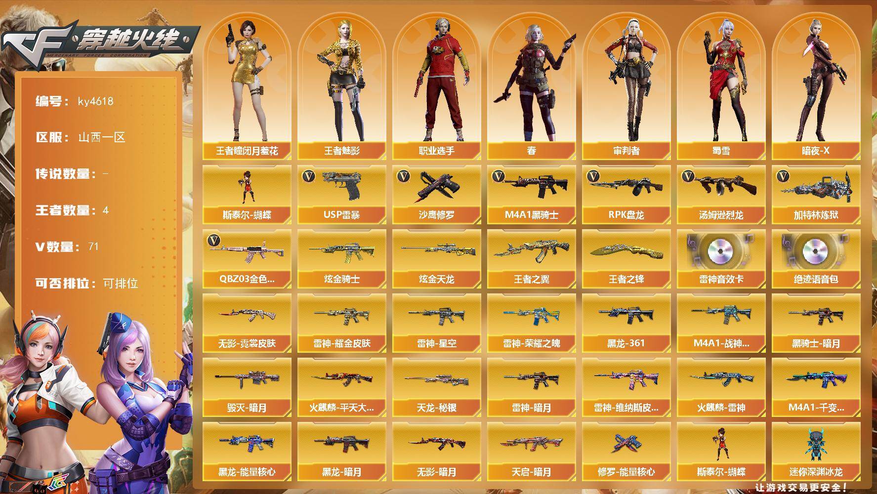 [16101969]山西一区-71V-4王者-4炫金 【热门武器】:QBZ03-金色蔷薇,M4A1-黑骑士,汤姆逊-烈龙*2,RPK-盘龙*5,加特林-炼狱,斯泰尔-蝴蝶,USP-雷暴,沙鹰-修罗*2 【王者炫金武器】:王者之翼,王者之锋,炫金骑士*2,炫金天龙*2 【音效卡】:M4A1-雷神音效卡,绝迹语音包 【皮肤】:雷神-暗月,雷神-荣耀之魄,雷神-星空,雷神-耀金皮肤,M4A1-战神赵云,雷神-维纳斯皮肤,火麒麟-雷神,火麒麟-平天大圣,毁灭-暗月,M4A1-千变-孔明皮肤,黑龙-能量核心,黑龙-暗月*2,M4A1-黑龙-361,黑骑士-暗月,无影-暗月,无影-霓裳皮肤,天启-暗月*2,天龙-秘银,修罗-能量核心 【角色】:春,审判者,王者-瞳-闭月羞花,王者-魅影,暗夜-X,初恋灵狐,芳心审判者,风暴女,虎妞,灵狐者-X,灵狐者-黄金海岸,麻雀,曼陀罗-礼服,潜龙队-X,邱刚敖,蜀雪,兔囡囡,新娜塔莎,雪莉杨,影武者-X,职业选手 【人偶武器】:火麒麟-灵狐,斯泰尔-蝴蝶,COP-旗袍,迷你深渊冰龙,迷你牛魔王,夺魂,迷你牛牛,迷你生化手雷,生化手雷-机甲核心,深渊终结者手雷,迷你艾比,迷你巨石泰坦-魔花研究所 【暴走生化】:超级对讲机 【挑战大师】:神圣爆裂者III,激光毁灭者III 【英雄级武器】:M4A1-千变,AK47-火麒麟,M4A1-黑龙,M4A1-雷神*2,M4A1-黑骑士,AK47-无影,AK47-黑武士,AK47-机械迷城,AK47-黑鲨,AK47-雷暴,M4A1-玫瑰精灵,QBZ03-金色蔷薇,王者之魄-觉醒版,AK-47-猩红传说,黑骑士-海王,AWM-天龙,Barrett-毁灭*4,Barrett-极光,王者之怒-觉醒版,RPK-盘龙*5,加特林-炼狱,汤姆逊-烈龙*2,沙鹰-修罗*2,USP-雷暴,柯尔特-电竞装甲,屠龙*3,龙啸,擎天,麒麟刺,斩神刀-雷暴,高爆手雷-雷暴*7,闪光弹-雷暴*7,烟雾弹-雷暴*7 【道具】:CFS限定背包,XROCK炫彩背包,超级背包,变异宝贝,夺命之镰*2,防化服,星辰流光-枪王排位,枪王排位28赛季金色流光,C4-红龙,防弹头盔*4,防弹衣*3,C4工具钳*2,手雷包 【特殊枪械】:蝴蝶斯泰尔+2烈龙,1黑骑士,2烈龙,5盘龙,1炼狱,1蝴蝶斯泰尔