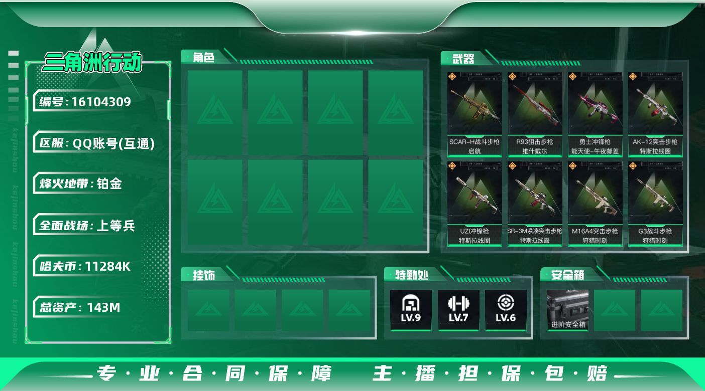 [16104309]143m总资产-11284k哈伏币-60烽火等级-铂金-50战场等级-上等兵 【近战皮肤】:近战-黑鹰 【传说外观】:M4A1突击步枪-阿米娅,M16A4突击步枪-狩猎时刻,AK-12突击步枪-特斯拉线圈,SCAR-H战斗步枪-启航,G3战斗步枪-狩猎时刻,CAR-15突击步枪-阿米娅,Vector冲锋枪-狩猎时刻,UZI冲锋枪-特斯拉线圈,SR-3M紧凑突击步枪-特斯拉线圈,勇士冲锋枪-能天使-午夜邮差,R93狙击步枪-维什戴尔,复合弓-黑·天际线 【史诗外观】:MP7冲锋枪-原型机,AKM突击步枪-林中猎手,M16A4突击步枪-竞赛选手,AUG突击步枪-蝮蛇,SG552突击步枪-深海恐惧,MP5冲锋枪-深海恐惧,MP5冲锋枪-战术竞备,MP5冲锋枪-竞技风,勇士冲锋枪-深海恐惧,勇士冲锋枪-工业狂潮,M1014霰弹枪-林中猎手,PKM通用机枪-蝮蛇,SV-98狙击步枪-林中猎手,SV-98狙击步枪-囚徒,R93狙击步枪-竞赛选手,M700狙击步枪-竞技风,沙漠之鹰-曙光 【稀有外观】:M14射手步枪-天际线,M4A1突击步枪-零点,AKM突击步枪-前沿科技,AKM突击步枪-肃杀,QBZ95-1突击步枪-公平竞技,K416突击步枪-碳纤维,M16A4突击步枪-街头涂鸦,AUG突击步枪-全金属外壳,M7战斗步枪-捣蛋鬼,AK-12突击步枪-零点,AK-12突击步枪-前沿科技,SCAR-H战斗步枪-荣耀列队,PTR-32突击步枪-天网,AS Val突击步枪-哈夫克科技,MP5冲锋枪-弄臣,MP5冲锋枪-虎啸,P90冲锋枪-医疗协议,Vector冲锋枪-先锋,SMG-45-行动开启,SMG-45冲锋枪-幻影结构,SMG-45冲锋枪-天网,MP7冲锋枪-幻影结构,M1014霰弹枪-幻影结构,M1014霰弹枪-童趣,M249轻机枪-战损,M250通用机枪-前沿科技,M250通用机枪-天网,Mini-14射手步枪-荣耀列队,SVD狙击步枪-战术行动,M14射手步枪-出厂配置,SKS射手步枪-弄臣,SR-25射手步枪-开拓,SR-9射手步枪-街头涂鸦,SV-98狙击步枪-星链科技,SV-98狙击步枪-哈夫克航天,SV-98狙击步枪-精英联盟 【普通外观】:CAR-15突击步枪-监察,M4A1突击步枪-粉色涂装,M4A1突击步枪-高雅黑,M4A1突击步枪-海色,QBZ95-1突