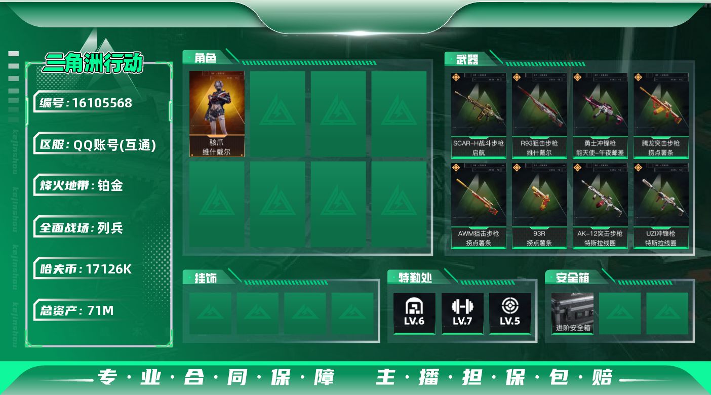 [16105568]【特价出售/店主推荐】71m总资产-17126k哈伏币-60烽火等级-铂金-9战场等级-列兵 【干员外观】:骇爪-维什戴尔 【近战皮肤】:近战-黑鹰 【传说外观】:M4A1突击步枪-阿米娅,AK-12突击步枪-特斯拉线圈,SCAR-H战斗步枪-水墨云图,SCAR-H战斗步枪-启航,CAR-15突击步枪-阿米娅,腾龙突击步枪-捞点薯条,UZI冲锋枪-特斯拉线圈,SR-3M紧凑突击步枪-特斯拉线圈,勇士冲锋枪-能天使-午夜邮差,R93狙击步枪-维什戴尔,AWM狙击步枪-捞点薯条,93R-捞点薯条 【史诗外观】:M16A4突击步枪-竞赛选手,SCAR-H战斗步枪-囚徒,MP5冲锋枪-深海恐惧,SR-3M紧凑突击步枪-战术竞备,勇士冲锋枪-工业狂潮,M250通用机枪-囚徒,SV-98狙击步枪-林中猎手,SV-98狙击步枪-囚徒 【稀有外观】:M4A1突击步枪-战术行动,QBZ95-1突击步枪-公平竞技,M7战斗步枪-捣蛋鬼,AK-12突击步枪-烈焰狂潮,腾龙突击步枪-冰天雪地,MP5冲锋枪-虎啸,Vector冲锋枪-先锋,UZI冲锋枪-亚特兰蒂斯,SMG-45-行动开启,SMG-45冲锋枪-幻影结构,Mini-14射手步枪-荣耀列队,SR-25射手步枪-开拓,SR-9射手步枪-街头涂鸦,SV-98狙击步枪-星链科技,SV-98狙击步枪-哈夫克航天,SV-98狙击步枪-精英联盟,G18-星链科技,G18-哈夫克航天 【普通外观】:M4A1突击步枪-粉色涂装,M4A1突击步枪-高雅黑,QBZ95-1突击步枪-海浪,QBZ95-1突击步枪-三角洲力量,QBZ95-1突击步枪-海色,QBZ191突击步枪-三角洲力量,K416突击步枪-几何迷彩,K416突击步枪-高雅黑,M16A4突击步枪-三角洲力量,M16A4突击步枪-山林猎人,AUG突击步枪-浅蓝涂装,M7战斗步枪-红色涂装,SG552突击步枪-浅蓝涂装,SCAR-H战斗步枪-数码迷彩,G3战斗步枪-高雅黑,PTR-32突击步枪-黄蜂,MP5冲锋枪-黄蜂,P90冲锋枪-三角洲力量,Vector冲锋枪-几何迷彩,UZI冲锋枪-海色,SR-3M紧凑突击步枪-三角洲力量,M1014霰弹枪-高雅黑,M1014霰弹枪-海浪,PKM通用机枪-彩墨喷涂,M249轻机枪-黄蜂,QJB201轻机枪-三角洲力量,沙漠之鹰-海浪 【载具外观】:轮式