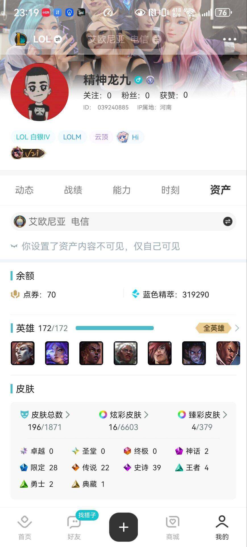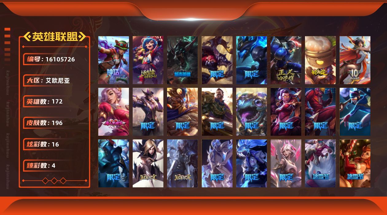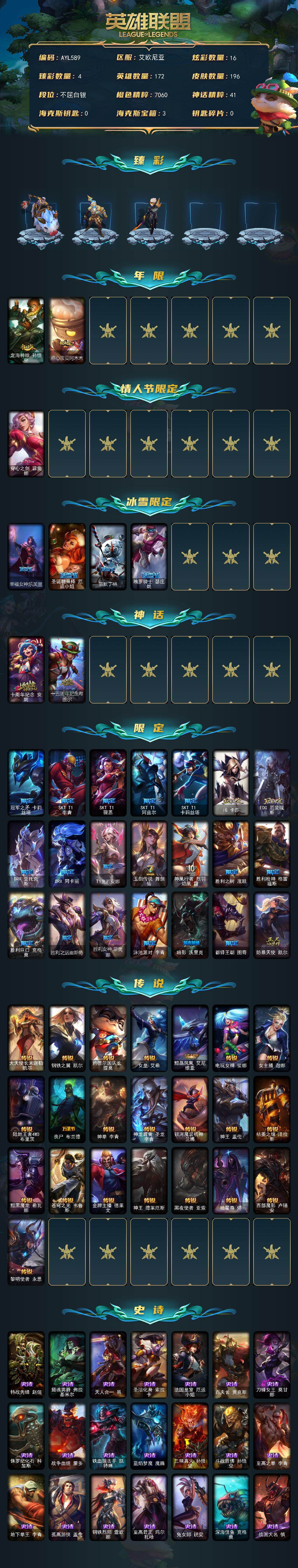 [16105726]可二次【特价出售/店主推荐】白银段位-172英雄-196皮肤-16炫彩-0终极-2神话-28限定-22传说-39史诗