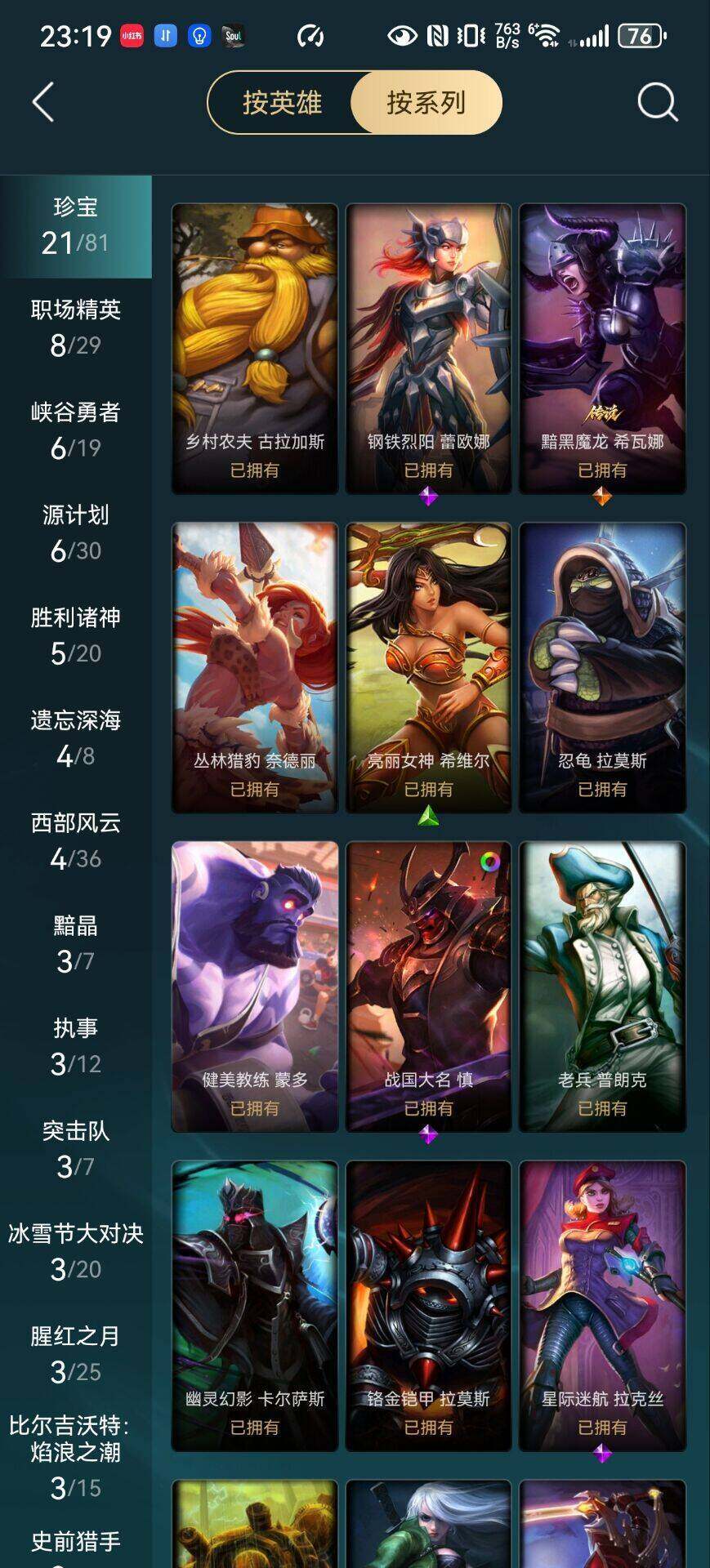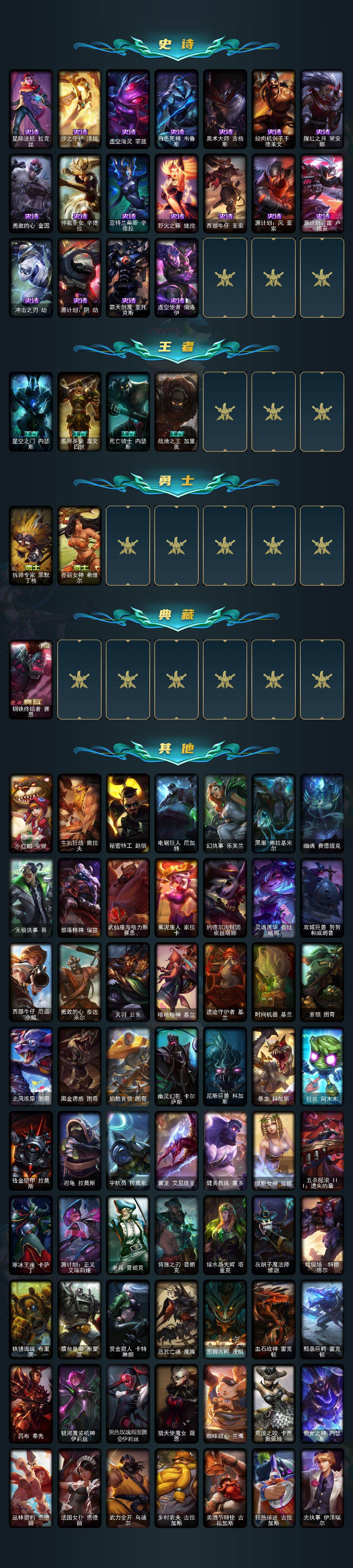 【史诗皮肤】:特战先锋赵信,摄魂男爵弗拉基米尔,天人合一易,圣洁化身索拉卡,法国皇室厄运小姐,百夫长贾克斯,刀锋女王莫甘娜,侏罗纪化石科加斯,战争血统蒙多,铁血狙击手凯特琳,蓝焰梦魔魔腾,三昧真火孙悟空,斗战胜佛孙悟空,至高之拳李青,地下拳王李青,孤高游侠盖伦,钢铁烈阳蕾欧娜,至高君王玛尔扎哈,兔女郎锐雯,深海怪鱼克格莫,战国大名慎,星际迷航拉克丝,沙之守护泽拉斯,虚空海灵菲兹,白色死神韦鲁斯,奥术大师吉格斯,绞肉机刽子手德莱文,腥红之月黛安娜,勇敢的心奎因,仲裁圣女辛德拉,亚特兰蒂斯辛德拉,野火之藤婕拉,西部牛仔亚索,源计划风亚索,源计划雷卢锡安,冲击之刃劫,源计划阴劫,霸天剑魔亚托克斯,虚空使者俄洛伊