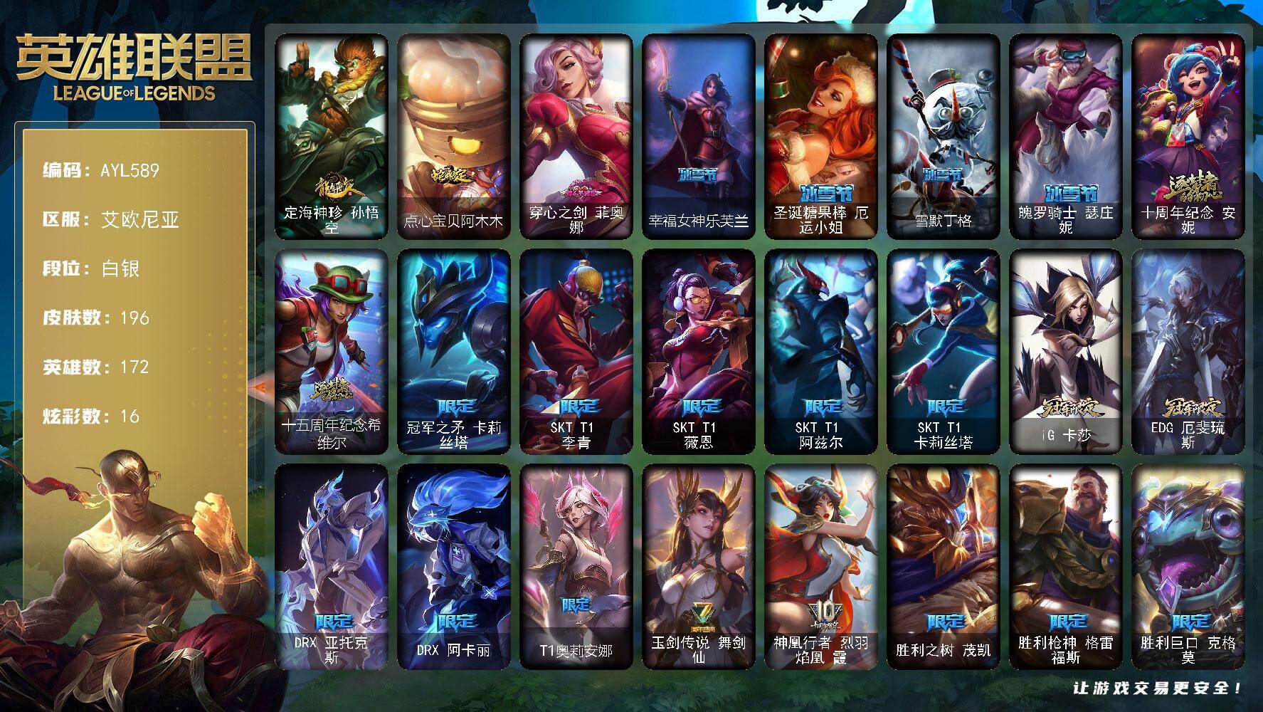[16105726]可二次【特价出售/店主推荐】白银段位-172英雄-196皮肤-16炫彩-0终极-2神话-28限定-22传说-39史诗 【臻彩皮肤】:无畏骑士瑟庄妮赤子初心,冠军之志瑞兹凯旋圣装,源计划火菲奥娜惩戒,魔女阿卡丽虚荣 【年限皮肤】:定海神珍孙悟空,点心宝贝阿木木 【情人节限定】:穿心之剑菲奥娜 【冰雪限定】:幸福女神乐芙兰,圣诞糖果棒厄运小姐,雪默丁格,魄罗骑士瑟庄妮 【神话皮肤】:十周年纪念安妮,十五周年纪念希维尔 【限定皮肤】:冠军之矛卡莉丝塔,SKTT1李青,SKTT1薇恩,SKTT1阿兹尔,SKTT1卡莉丝塔,iG卡莎,EDG厄斐琉斯,DRX亚托克斯,DRX阿卡丽,T1奥莉安娜,玉剑传说舞剑仙,神凰行者烈羽焰凰霞,胜利之树茂凯,胜利枪神格雷福斯,胜利巨口克格莫,胜利之运崔斯特,胜利女神菲奥娜,泳池派对李青,暗影沃里克,都铎王朝图奇,防暴天使凯尔 【传说皮肤】:大天使长米迦勒凯尔,钢铁之翼凯尔,约德尔国队长提莫,女皇艾希,黯晶凤凰艾尼维亚,电玩女神娑娜,女主播迦娜,陆地王者4WD布里茨,丧尸布兰德,神拳李青,神龙尊者圣龙李青,银河魔装机神兰博,神王盖伦,枯萎之壤泽拉斯,黯黑魔龙希瓦娜,苍穹之光韦鲁斯,金牌主播德莱文,神王德莱厄斯,黑夜使者亚索,暗星尊烬,西部魔影卢锡安,黎明使者永恩 【史诗皮肤】:特战先锋赵信,摄魂男爵弗拉基米尔,天人合一易,圣洁化身索拉卡,法国皇室厄运小姐,百夫长贾克斯,刀锋女王莫甘娜,侏罗纪化石科加斯,战争血统蒙多,铁血狙击手凯特琳,蓝焰梦魔魔腾,三昧真火孙悟空,斗战胜佛孙悟空,至高之拳李青,地下拳王李青,孤高游侠盖伦,钢铁烈阳蕾欧娜,至高君王玛尔扎哈,兔女郎锐雯,深海怪鱼克格莫,战国大名慎,星际迷航拉克丝,沙之守护泽拉斯,虚空海灵菲兹,白色死神韦鲁斯,奥术大师吉格斯,绞肉机刽子手德莱文,腥红之月黛安娜,勇敢的心奎因,仲裁圣女辛德拉,亚特兰蒂斯辛德拉,野火之藤婕拉,西部牛仔亚索,源计划风亚索,源计划雷卢锡安,冲击之刃劫,源计划阴劫,霸天剑魔亚托克斯,虚空使者俄洛伊 【王者皮肤】:星空之门内瑟斯,孤胆英豪嘉文四世,死亡骑士内瑟斯,战地之王加里奥 【勇士皮肤】:拆弹专家黑默丁格,亮丽女神希维尔 【典藏皮肤】:钢铁终结者赛恩 【其他皮肤1】:小红帽安妮,牛扒狂战奥拉夫,秘密特工赵信,电锯狂人厄加特,幻执事乐芙兰,黑潮弗拉基米尔,幽魂费德提克,无极执