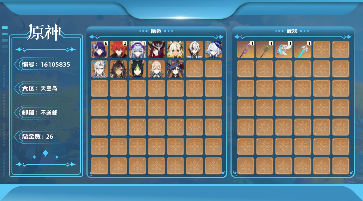 - [15194638]60级/41黄/女主/21个五星角色/10个五星武器 0命闲云,0命娜维娅,0命那维莱特,0命迪希雅,0命纳西妲,0命妮露,1命提纳里,0命夜兰,0命雷电将军,1命枫原万叶,0命神里绫华,0命钟离,1命胡桃,0命魈,0命达达利亚,0命刻晴,2命七七,1命琴,2命莫娜,2命迪卢克,0命玛拉妮,精1千夜浮梦,精1圣显之钥,精1若水,精1护摩之杖,精1磐岩结绿,精1和璞鸢,精1天空之翼,精1天空之卷,精1天空之傲