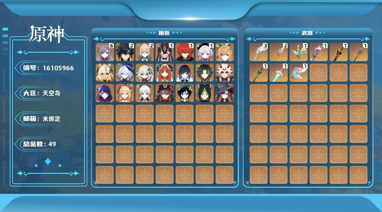 0命芙宁娜,0命纳西妲,0命妮露,1命赛诺,0命提纳里,0命夜兰,0命荒泷一斗,0命雷电将军,0命神里绫华,0命胡桃,0命魈,0命宵宫,0命温迪,满命刻晴,1命七七,2命琴,0命莫娜,1命迪卢克,2命基尼奇,0命希诺宁,0命爱可菲,0命丝柯克,0命菲林斯,0命杜林,精1千夜浮梦,精1若水,精1赤角石溃杵,精1磐岩结绿,精1和璞鸢,精2天空之脊,精3天空之翼,精1天空之卷,精1天空之傲