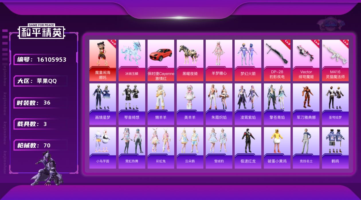 [16105953]【店主推荐捡漏号】苹果 手Q-1神装-2粉装-3特效枪-3载具-6粉色飞行器-26839热力值-3王牌印记-36套装-70枪皮【红色神装等级】:魔童闹海-哪吒(二级)【红色角色神装】:魔童闹海-哪吒【热门品类】:粉装-梦幻火箭,角色-军刀雅典娜【粉色套装】:粉装-梦幻火箭,角色-羊梦糖心【粉色枪皮等级】:M416-灵猫魔法师(三级),Vector-绯穹魔姬(四级),DP-28-豹影疾电(五级)【粉色载具】:保时捷Cayenne(激情红),黑曜夜骑,冰绡玉鳞【粉色枪皮】:M416-灵猫魔法师,Vector-绯穹魔姬,DP-28-豹影疾电