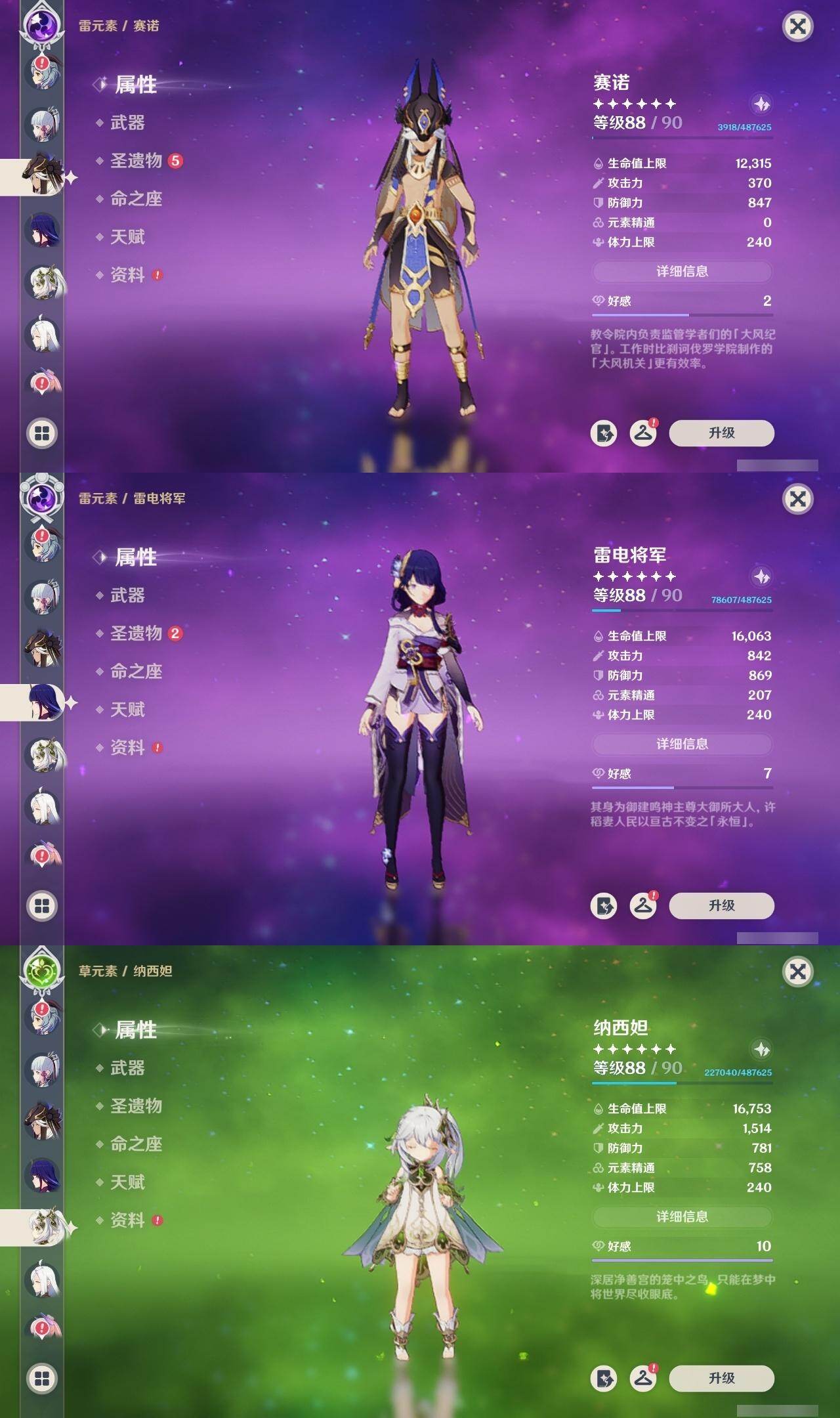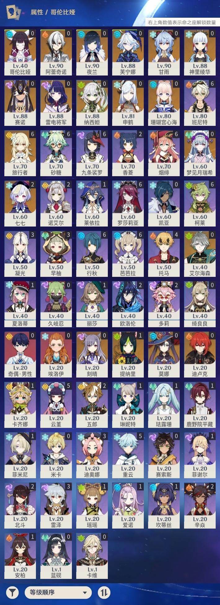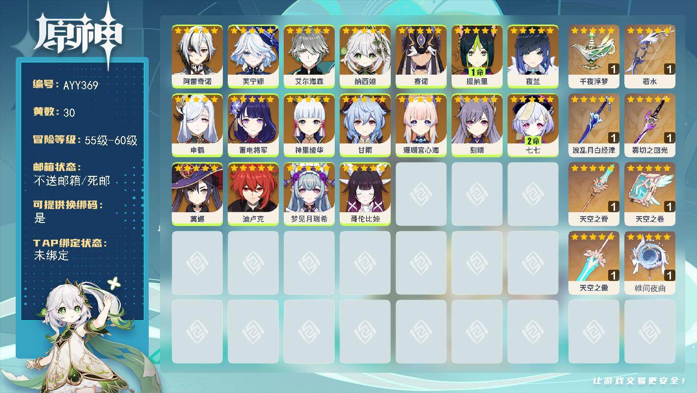 [16106013]57级/30黄/女主/18个五星角色/9个五星武器 0命阿蕾奇诺,0命芙宁娜,0命艾尔海森,0命纳西妲,0命赛诺,1命提纳里,0命夜兰,0命申鹤,0命雷电将军,0命神里绫华,0命甘雨,0命珊瑚宫心海,0命刻晴,2命七七,0命莫娜,0命迪卢克,0命梦见月瑞希,0命哥伦比娅,精1千夜浮梦,精1若水,精1波乱月白经津,精1雾切之回光,精1天空之脊,精1天空之卷,精1天空之傲,精1帷间夜曲