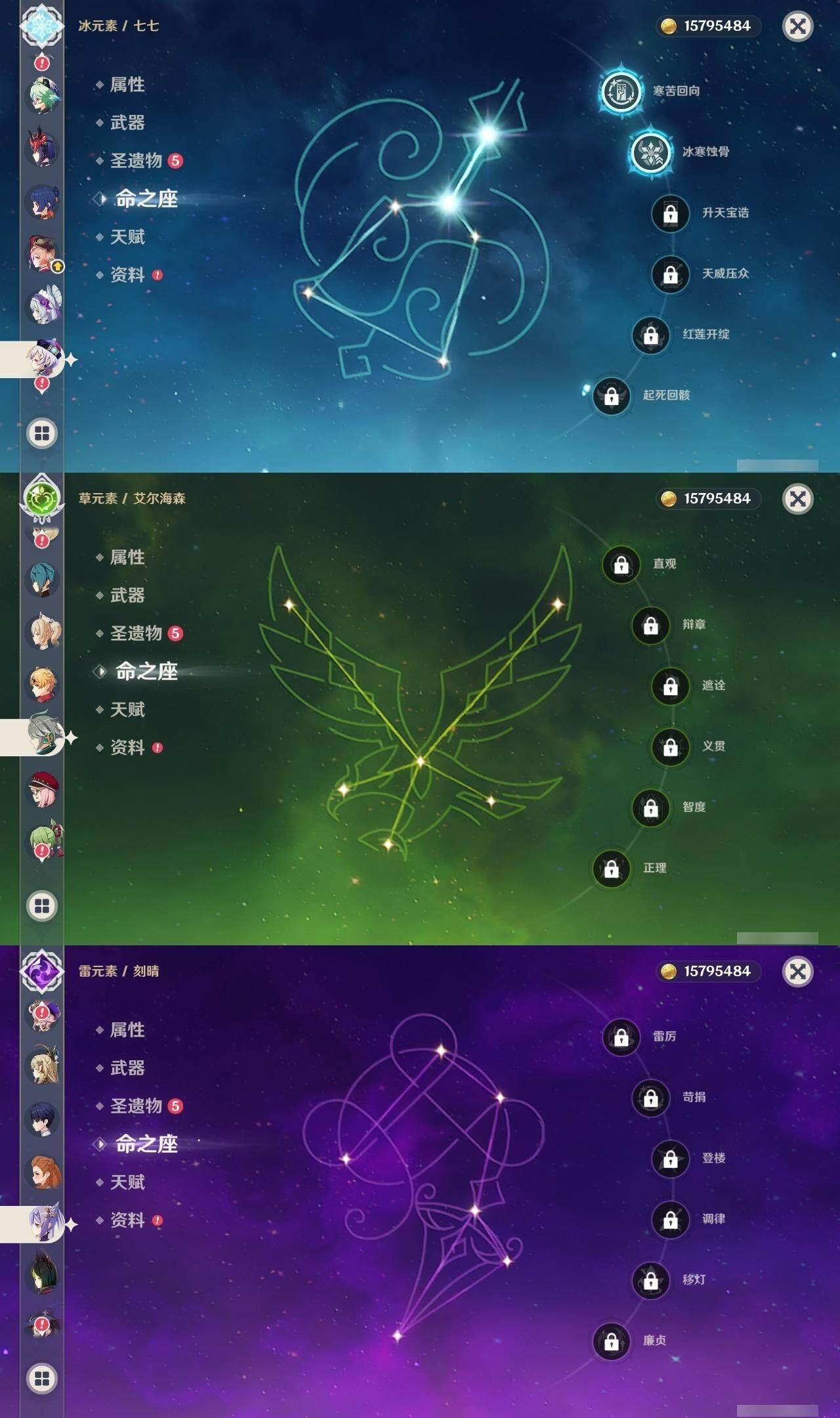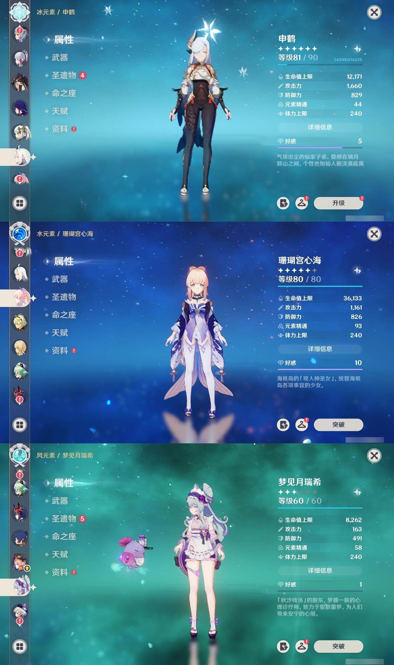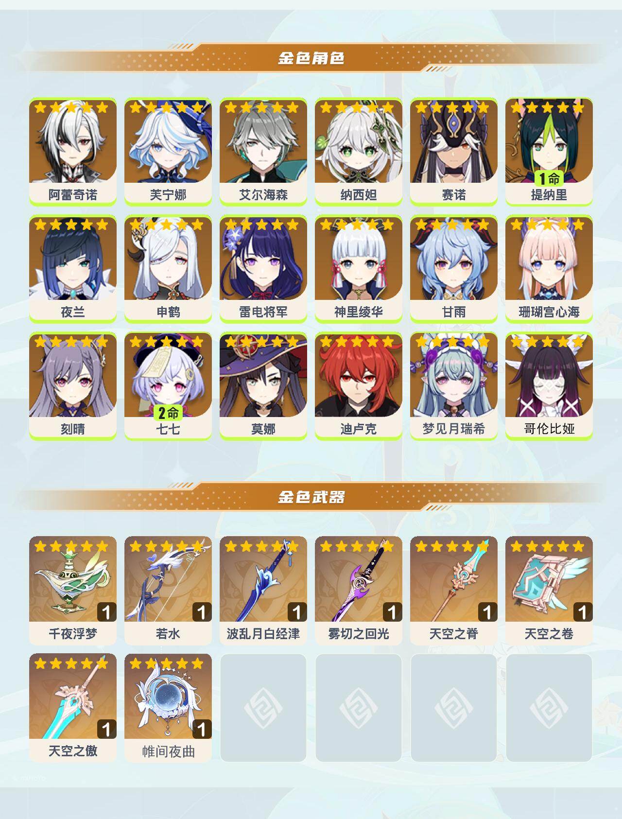 0命阿蕾奇诺,0命芙宁娜,0命艾尔海森,0命纳西妲,0命赛诺,1命提纳里,0命夜兰,0命申鹤,0命雷电将军,0命神里绫华,0命甘雨,0命珊瑚宫心海,0命刻晴,2命七七,0命莫娜,0命迪卢克,0命梦见月瑞希,0命哥伦比娅,精1千夜浮梦,精1若水,精1波乱月白经津,精1雾切之回光,精1天空之脊,精1天空之卷,精1天空之傲,精1帷间夜曲