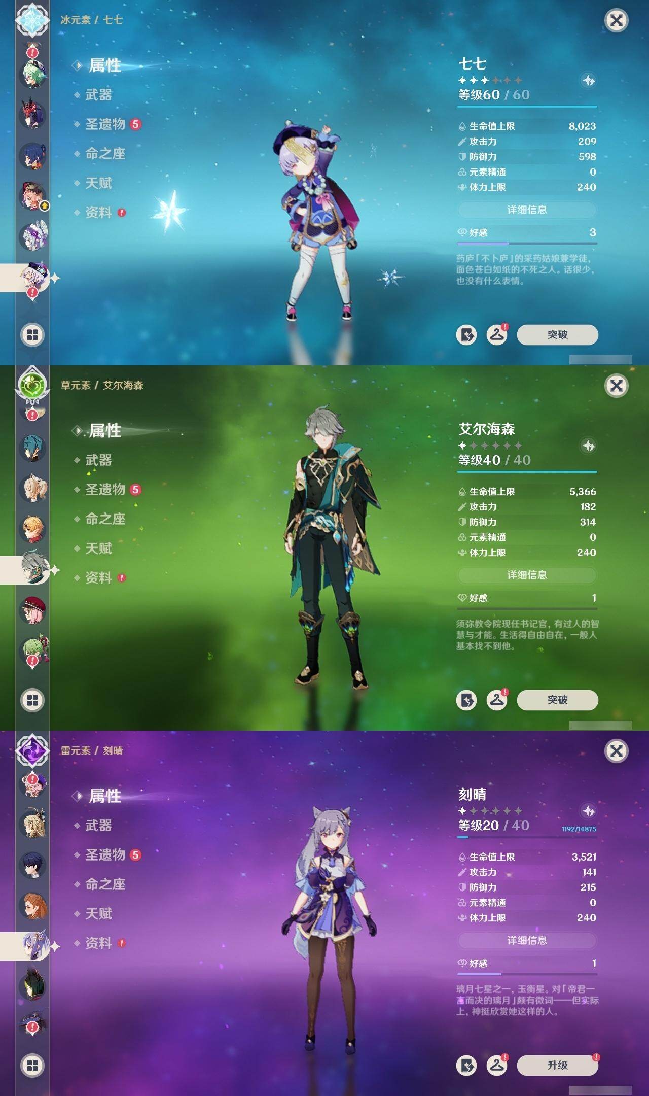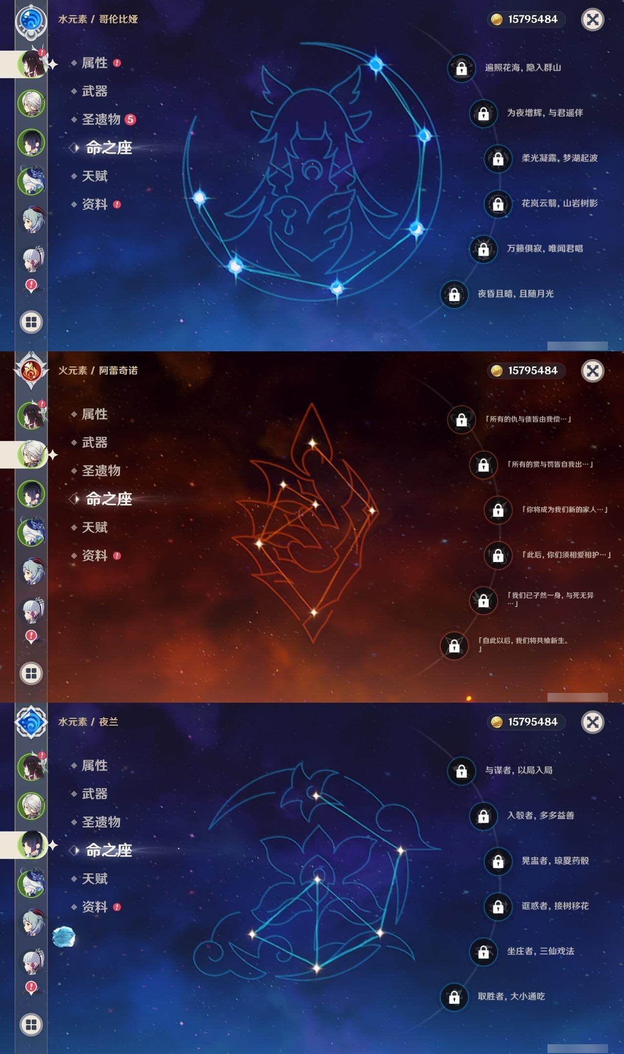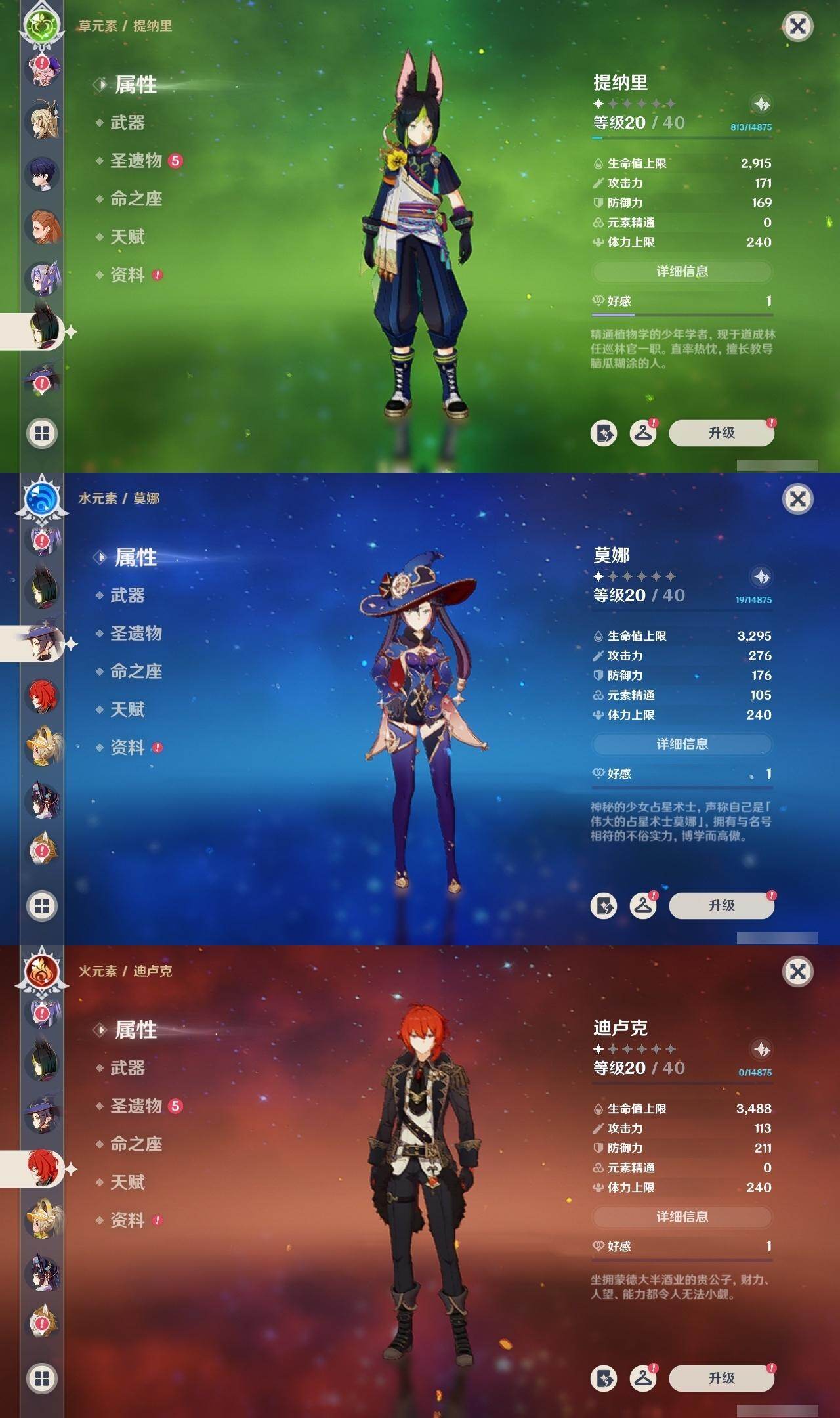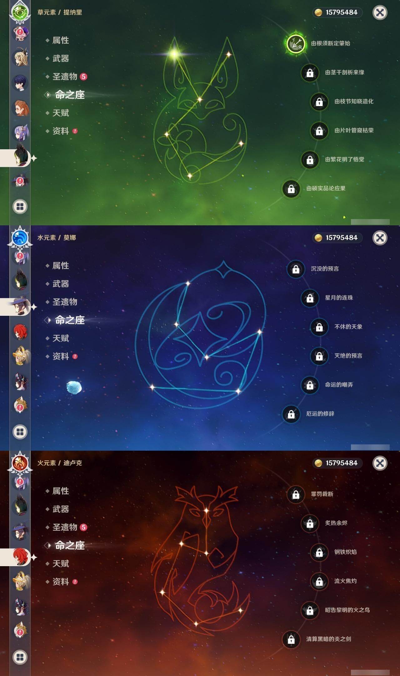 0命阿蕾奇诺,0命芙宁娜,0命艾尔海森,0命纳西妲,0命赛诺,1命提纳里,0命夜兰,0命申鹤,0命雷电将军,0命神里绫华,0命甘雨,0命珊瑚宫心海,0命刻晴,2命七七,0命莫娜,0命迪卢克,0命梦见月瑞希,0命哥伦比娅,精1千夜浮梦,精1若水,精1波乱月白经津,精1雾切之回光,精1天空之脊,精1天空之卷,精1天空之傲,精1帷间夜曲