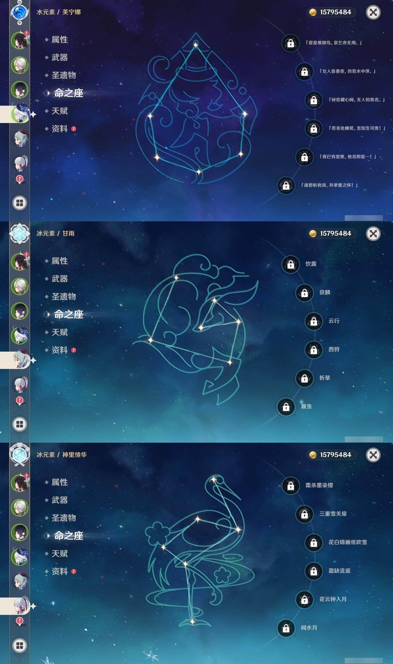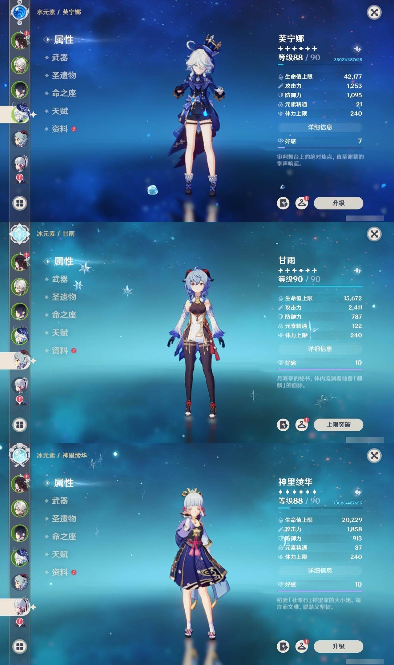甘雨,神里凌华,雷电将军,申鹤,珊瑚宫心海,七七,刻晴,莫娜,迪卢克