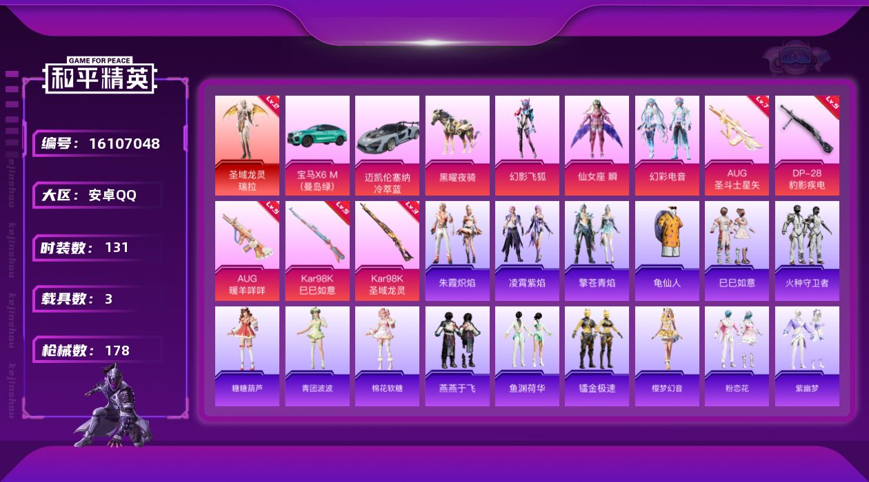 - [15233613]【店主推荐捡漏号!可直接换绑】/素材身法号 安卓 手Q-1神装-18粉装-14特效枪-8载具-7粉色飞行器-10.3w热力值-11王牌印记-174套装-269枪皮【红色神装等级】:魔童闹海-敖丙(三级)【热门品类】:粉装-梦幻火箭,套装-浪漫天命,套装-AG战队服,套装-龟仙人,套装-浪漫波比【粉色套装】:粉装-天使彩虹糖,粉装-蝶舞迷情,粉装-梦幻火箭,粉装-暗夜玫瑰,粉装-俏雪含霜,角色-星云暗核,粉装-莲影清波,角色-紫钛骑兵,角色-圣堂之誓,角色-小叽联名款,角色-严莉莉,角色-小蓝,角色-美琪,角色-天龙座 紫龙,粉装-星穹咏叹调,角色-星渊,角色-羊梦糖心,角色-异瞳寒姬【粉色枪皮等级】:AKM-甜心宝贝(五级),SCAR-L-青春物语(四级),SCAR-L-纯梦嫁纱(一级),M416-心之恋语(七级),蜜獾-异瞳寒姬(四级),P90-魔童闹海 敖丙(三级),Kar98K-巳巳如意(五级),AWM-天使羽翼(五级),Mk14-甜梦熊击(五级),DP-28-暗夜鎏金(一级),DP-28-圣堂之誓(四级),DP-28-豹影疾电(五级),MG3-洛神天依(五级),MG-36-沧焰双生(五级)【粉色载具】:路特斯ELETRE(冰川蓝),玛莎拉蒂Ghibli(粉),宝马i8(离子银),保时捷911 敞篷版(极速黄),保时捷Taycan 旅行版(冰莓粉),灵鼠银迹,僚机-冰龙团团,冰绡玉鳞【粉色飞行器】:齐天大圣飞行器,超新星飞行器,镜光幻境飞行翼,镜域双华-灵镜之阶,幻星舰长飞行器,灵珠游龙飞行器