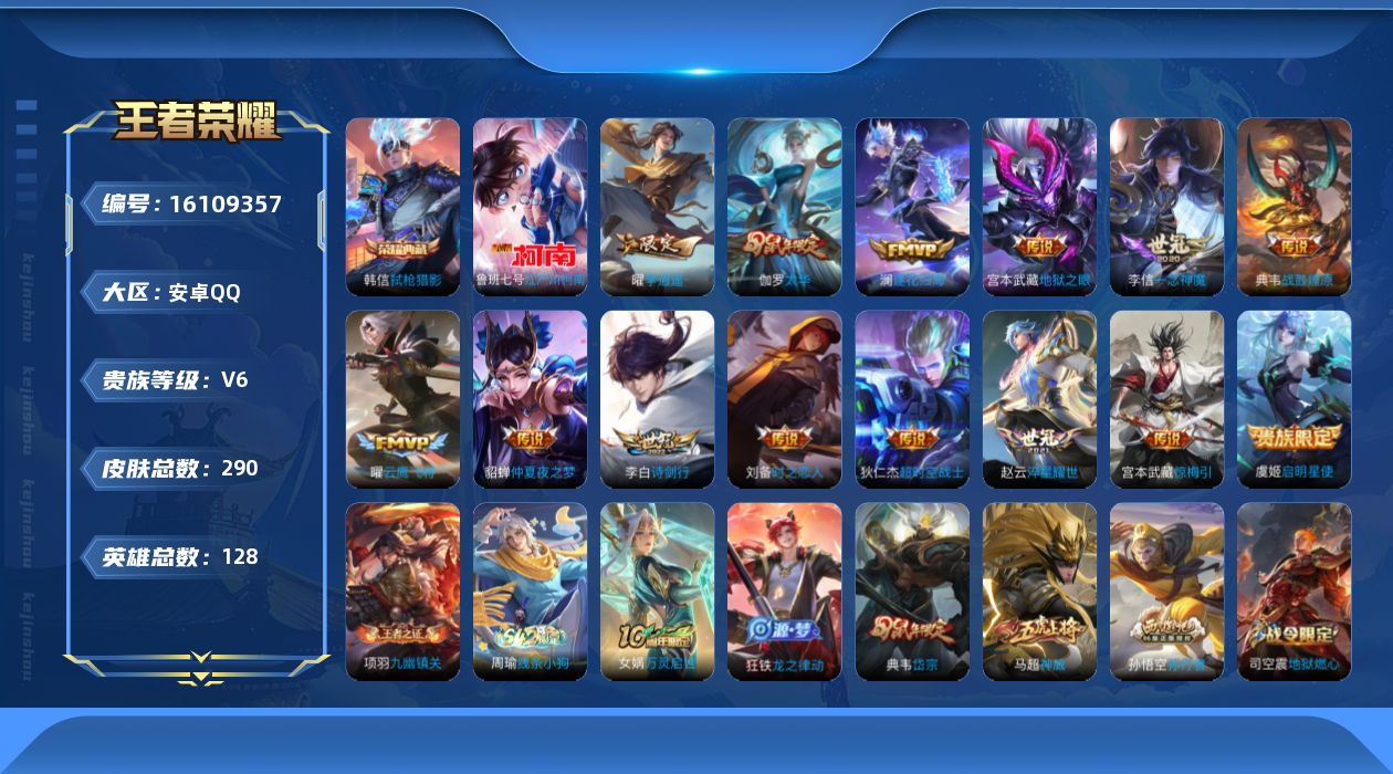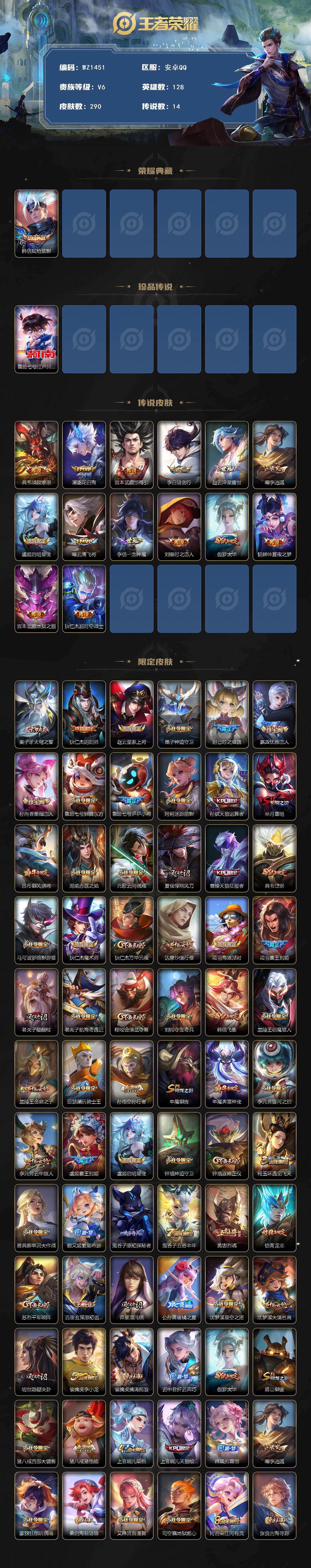 [16109357]5按键、2星传-安卓Q-V6-128英雄-290皮肤-1典藏皮肤-1珍品传说-14传说-80史诗