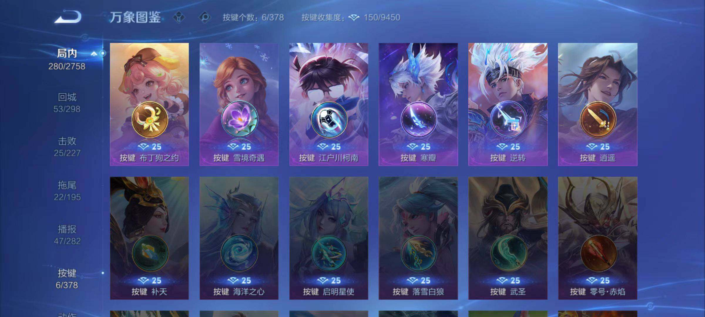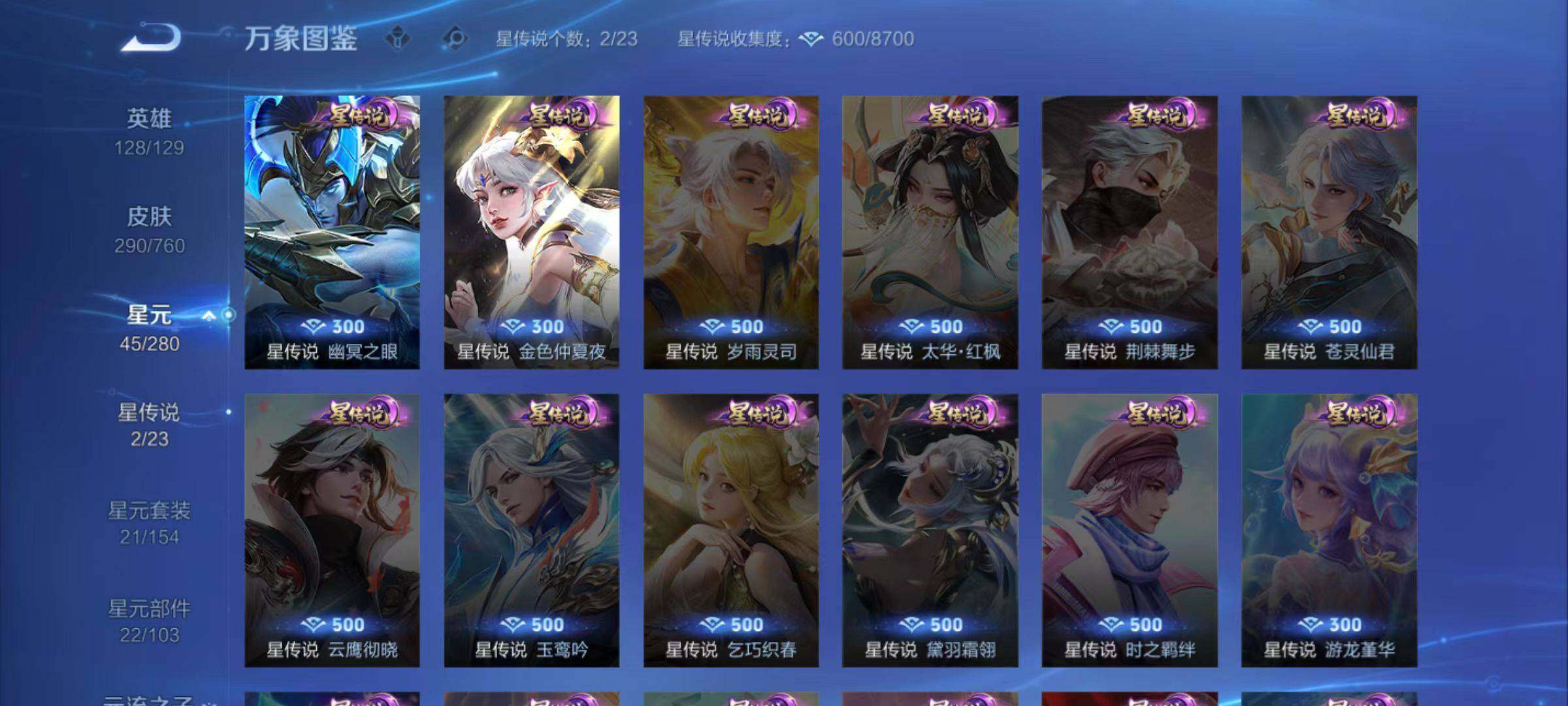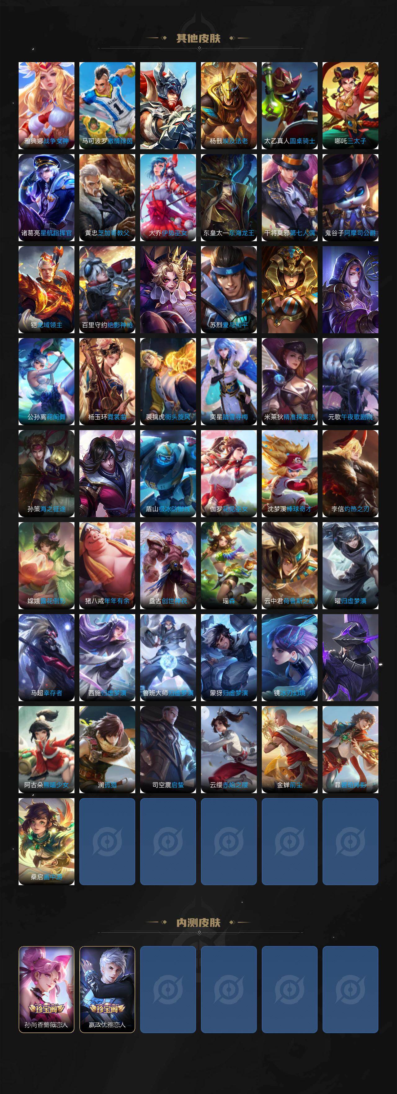 芈月重明,牛魔御旌,盾山御銮,夏侯惇朔风刀,明世隐疑决卦,老夫子醍醐杖,鬼谷子原初探秘者,狄仁杰万华元夜,程咬金演武夺筹,钟馗驱傩正仪,苏烈千军破阵,钟馗神迹守卫,鲁班七号狮舞东方,沈梦溪星空之诺,李元芳银河之约,刘邦夺宝奇兵,马可波罗暗影游猎,蒙犽狂想玩偶喵,元歌云间偶戏,弈星混沌棋,达摩沙漠行僧,兰陵王金庭之子,沈梦溪大漠名商,李元芳云中旅人,桑启海盐诗旅,裴擒虎擒涛扼浪,张良古海寻踪,项羽苍威无极,镜青焰无极