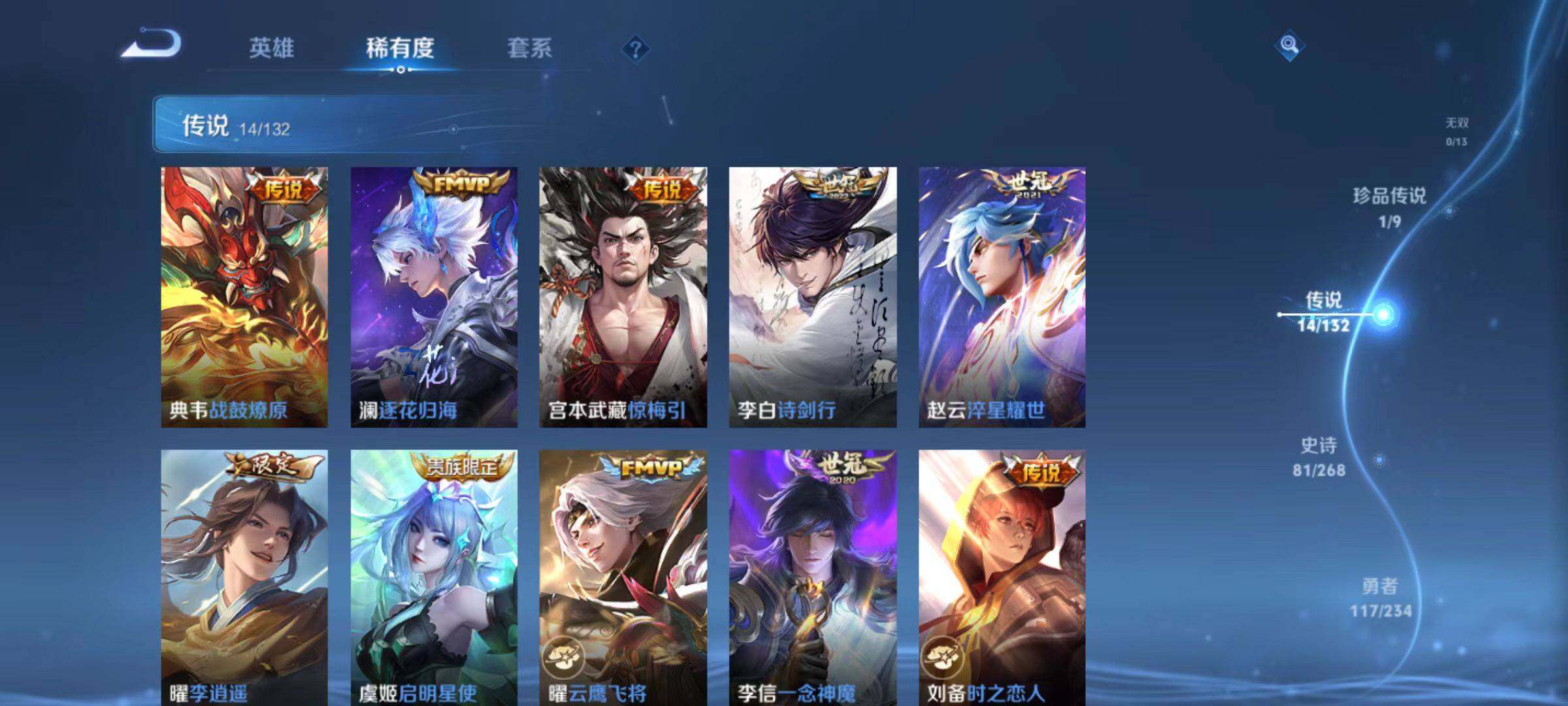 【传说皮肤】:典韦战鼓燎原,澜逐花归海,宫本武藏惊梅引,李白诗剑行,赵云淬星耀世,曜李逍遥 ,虞姬启明星使,曜云鹰飞将,李信一念神魔,刘备时之恋人,伽罗太华,貂蝉仲夏夜之梦,宫本武藏地狱之眼,狄仁杰超时空战士