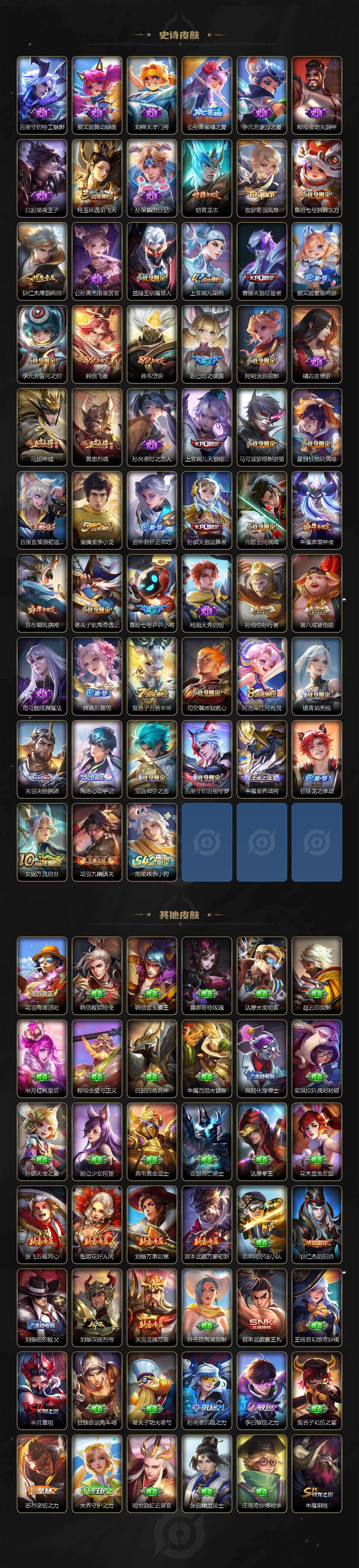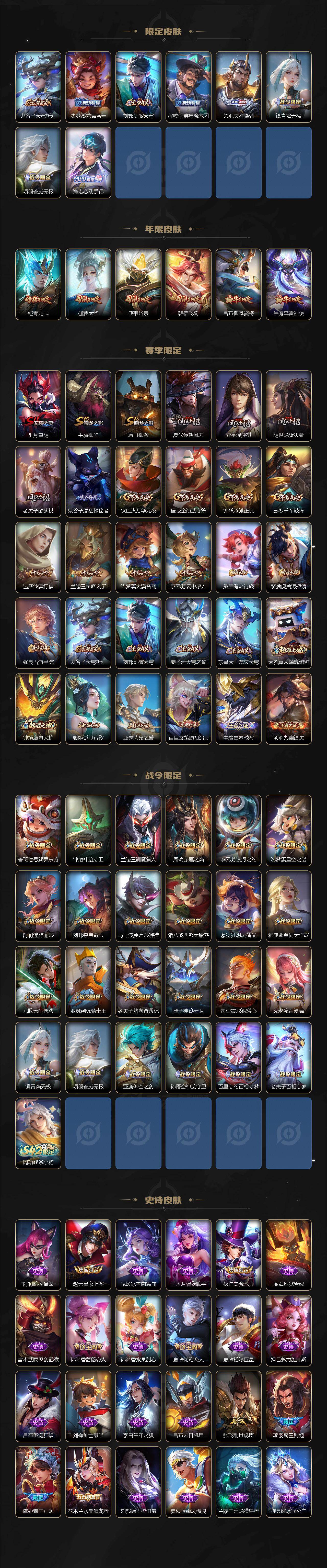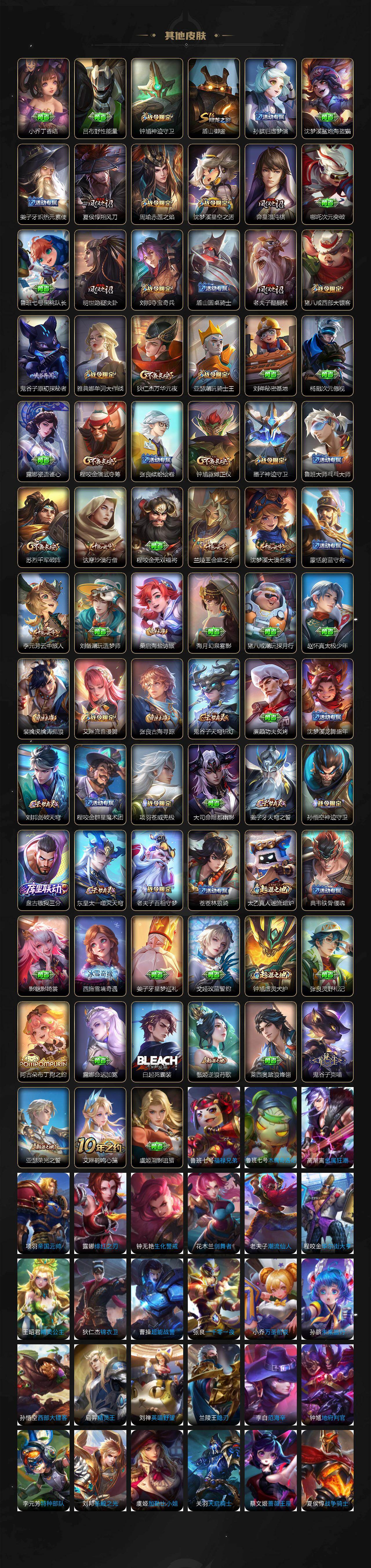 【限定皮肤】:姜子牙天穹之誓,狄仁杰阴阳师,赵云皇家上将,墨子神迹守卫,妲己时之彼端,嬴政优雅恋人,孙尚香蔷薇恋人,鲁班七号狮舞东方,鲁班七号乒乒小将,阿轲迷踪丽影,孙膑天狼运算者,芈月重明,吕布御风骁将,周瑜赤莲之焰,元歌云间偶戏,夏侯惇朔风刀,曹操天狼征服者,典韦岱宗,马可波罗暗影游猎,狄仁杰魔术师,狄仁杰万华元夜,达摩沙漠行僧,项羽海滩派对,项羽霸王别姬,老夫子醍醐杖,老夫子航海奇遇记,程咬金演武夺筹,刘邦夺宝奇兵,韩信飞衡,兰陵王驯魔猎人,兰陵王金庭之子,亚瑟潮玩骑士王,孙悟空孙行者,牛魔御旌,牛魔奔雷神使,李元芳银河之约,李元芳云中旅人,虞姬霸王别姬,虞姬启明星使,钟馗神迹守卫,钟馗驱傩正仪,杨玉环遇见飞天,雅典娜单词大作战,蔡文姬繁星吟游,鬼谷子原初探秘者,鬼谷子五谷丰年,黄忠烈魂,铠青龙志,苏烈千军破阵,百里玄策原初追逐者,弈星混沌棋,公孙离蜜橘之夏,沈梦溪星空之诺,沈梦溪大漠名商,明世隐疑决卦,裴擒虎李小龙,裴擒虎擒涛扼浪,云中君纤云弄巧,伽罗太华,盾山御銮,猪八戒西部大镖客,猪八戒猪悟能,上官婉儿梁祝,上官婉儿天狼绘梦者,嫦娥拒霜思,曜李逍遥 ,蒙犽狂想玩偶喵,桑启海盐诗旅,艾琳流音漫舞,司空震地狱燃心,阿古朵江河有灵,张良古海寻踪,鬼谷子天穹祈灯,沈梦溪龙舞盛年,刘邦剑破天穹,程咬金群星魔术团,关羽决胜骁骑,镜青焰无极,项羽苍威无极,海诺心动手记