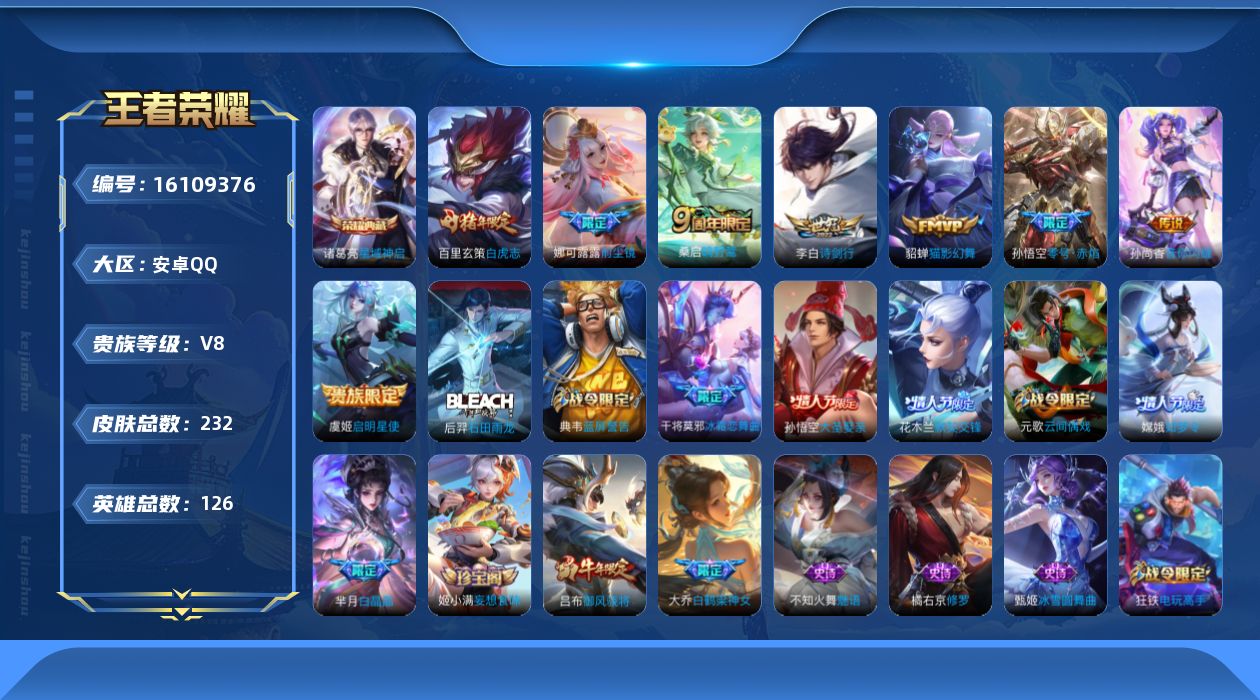 [16109376]7按键-安卓Q-V8-126英雄-232皮肤-1典藏皮肤-9传说-62史诗