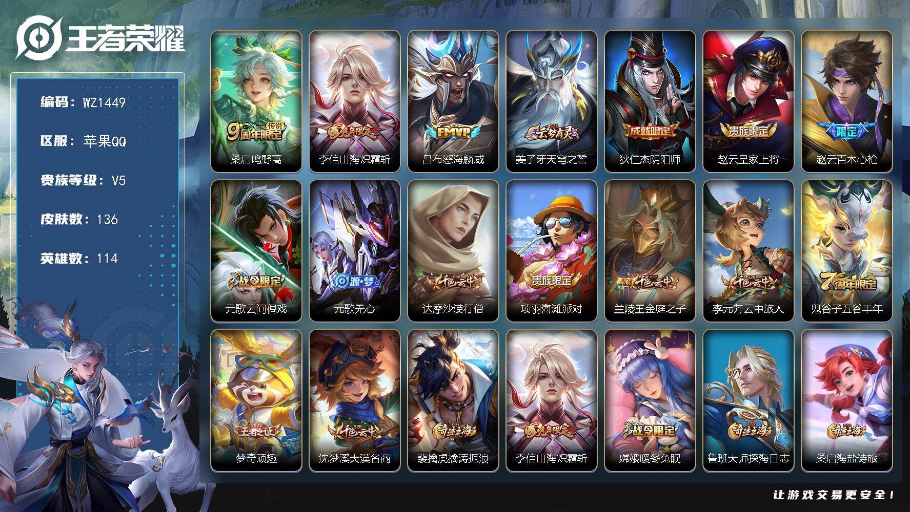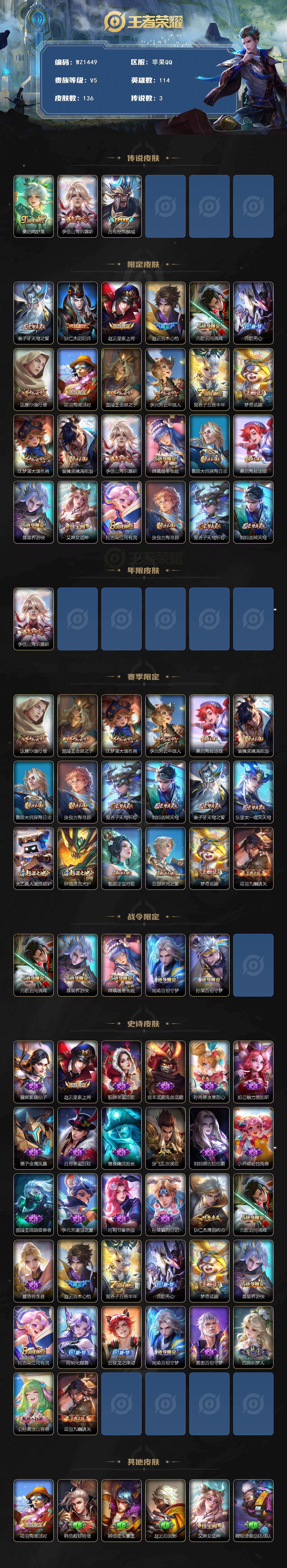[16109386]苹果Q-V5-永恒钻石III段位-114英雄-136皮肤-3传说-32史诗