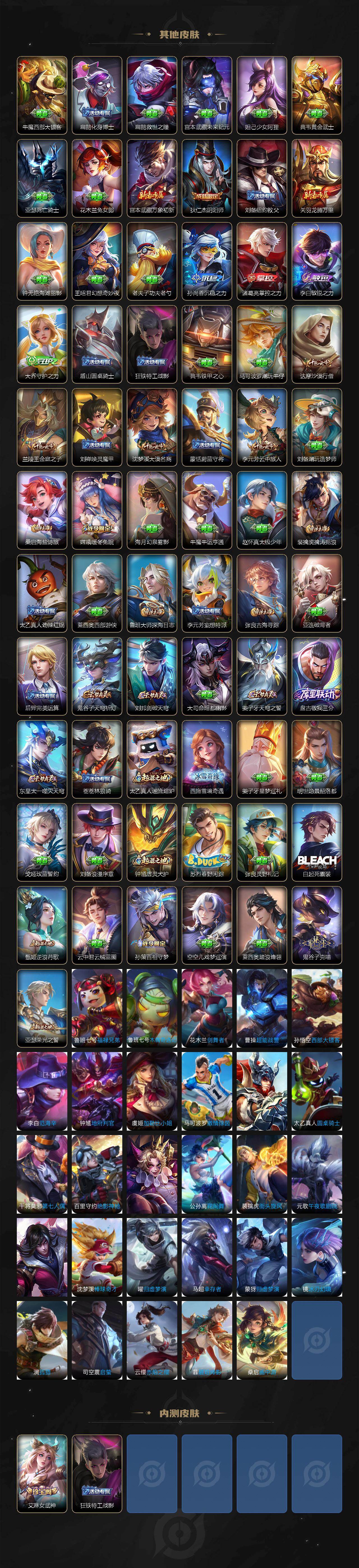 【赛季限定】:达摩沙漠行僧,兰陵王金庭之子,沈梦溪大漠名商,李元芳云中旅人,桑启海盐诗旅,裴擒虎擒涛扼浪,鲁班大师探海日志,张良古海寻踪,鬼谷子天穹祈灯,刘邦剑破天穹,姜子牙天穹之誓,东皇太一噬灭天穹,太乙真人谧流熔炉,钟馗虚灵犬护,甄姬逆浪荇歌,亚瑟荣光之誓,梦奇顽趣,项羽九幽镇关