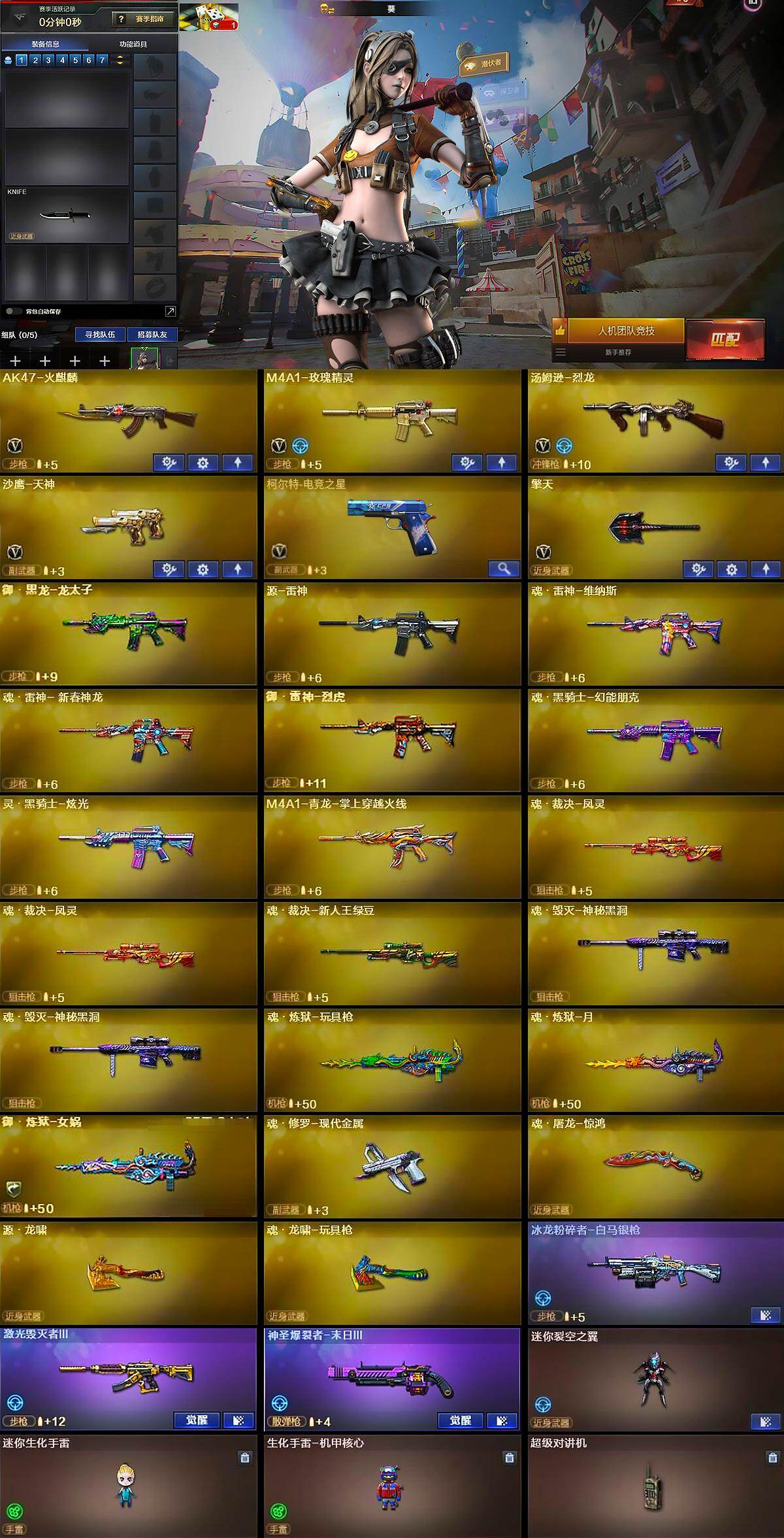 【英雄级武器】:AK47-火麒麟,M4A1-玫瑰精灵,汤姆逊-烈龙,沙鹰-天神,柯尔特-电竞之星,擎天