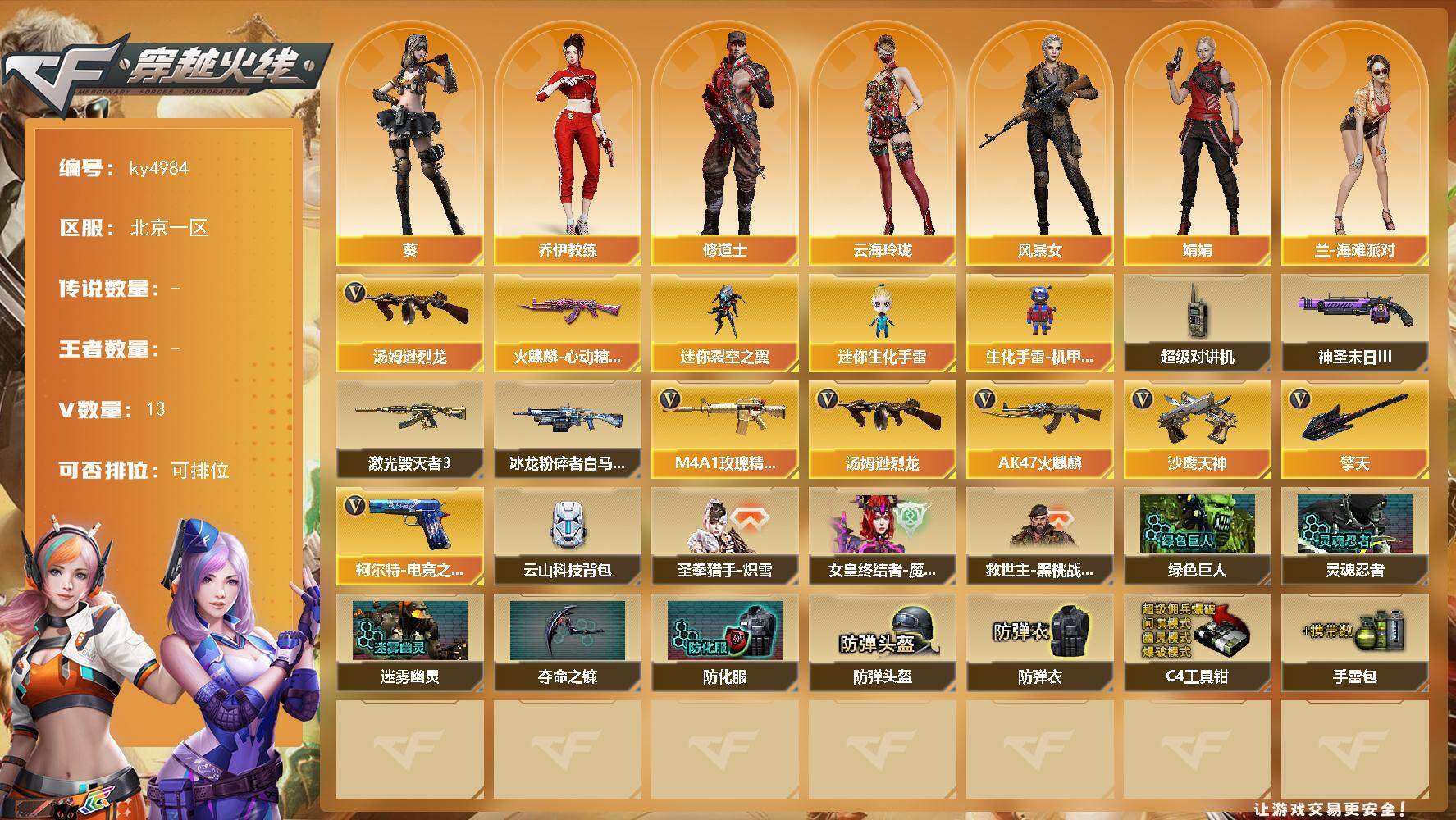 [16089497]北京一区-13V-0王者-0炫金 【热门武器】:汤姆逊-烈龙 【皮肤】:火麒麟-心动糖果 【角色】:葵,乔伊教练,修道士,云海玲珑,风暴女,娟娟,兰-海滩派对,兰妹妹,灵狐者-X,曼陀罗-X,潘多拉-X,潜龙队-X,蛇姬,斯沃特-X,夜玫瑰-幻能朋克 【人偶武器】:迷你裂空之翼,迷你生化手雷,生化手雷-机甲核心 【暴走生化】:超级对讲机 【挑战大师】:冰龙粉碎者-白马银枪,激光毁灭者III,神圣爆裂者-末日III 【英雄级武器】:AK47-火麒麟,M4A1-玫瑰精灵,汤姆逊-烈龙,沙鹰-天神,柯尔特-电竞之星,擎天 【道具】:云山科技背包,圣拳猎手-炽雪,女皇终结者-魔龙之吻,救世主-黑桃战神,绿色巨人,灵魂忍者,迷雾幽灵,夺命之镰,防化服*2,防弹头盔*3,防弹衣*4,C4工具钳*3,手雷包*3 【特殊枪械】:1烈龙