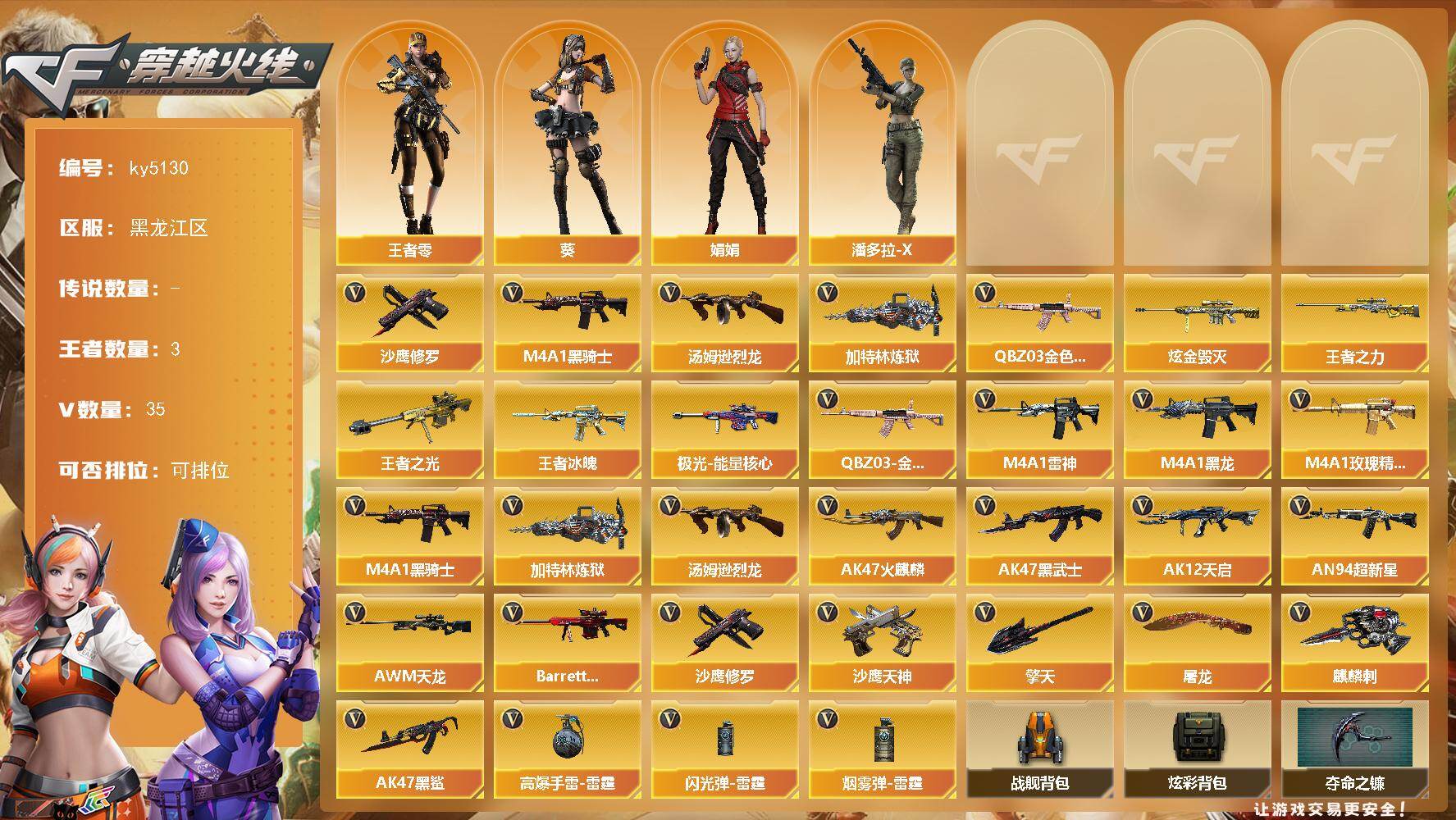 [16068081]黑龙江区-35V-3王者-1炫金 【热门武器】:QBZ03-金色蔷薇,M4A1-黑骑士*2,汤姆逊-烈龙,加特林-炼狱,沙鹰-修罗*2 【王者炫金武器】:王者冰魄,王者之光,王者之力,炫金毁灭 【皮肤】:极光-能量核心 【角色】:葵,王者-零,娟娟,潘多拉-X 【英雄级武器】:AK47-火麒麟,M4A1-黑龙,M4A1-雷神,M4A1-黑骑士*2,AK47-黑武士,AK12-天启,AN94-超新星,AK47-黑鲨,M4A1-玫瑰精灵*3,QBZ03-金色蔷薇,AWM-天龙*2,Barrett-极光*2,加特林-炼狱,汤姆逊-烈龙,沙鹰-修罗*2,沙鹰-天神,屠龙*5,擎天*2,麒麟刺,高爆手雷-雷霆,闪光弹-雷霆,烟雾弹-雷霆 【道具】:战舰背包,炫彩背包,夺命之镰,防化服,防弹头盔,防弹衣,C4工具钳,手雷包 【特殊枪械】:2黑骑士,1烈龙,1炼狱