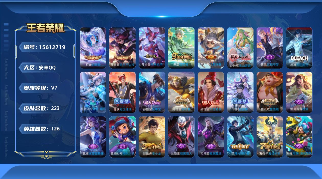[15612719]【店主推荐捡漏号!可直接换绑】安卓Q-V7-最强王者段位-126英雄-223皮肤-2典藏皮肤-3传说-59史诗-1星元