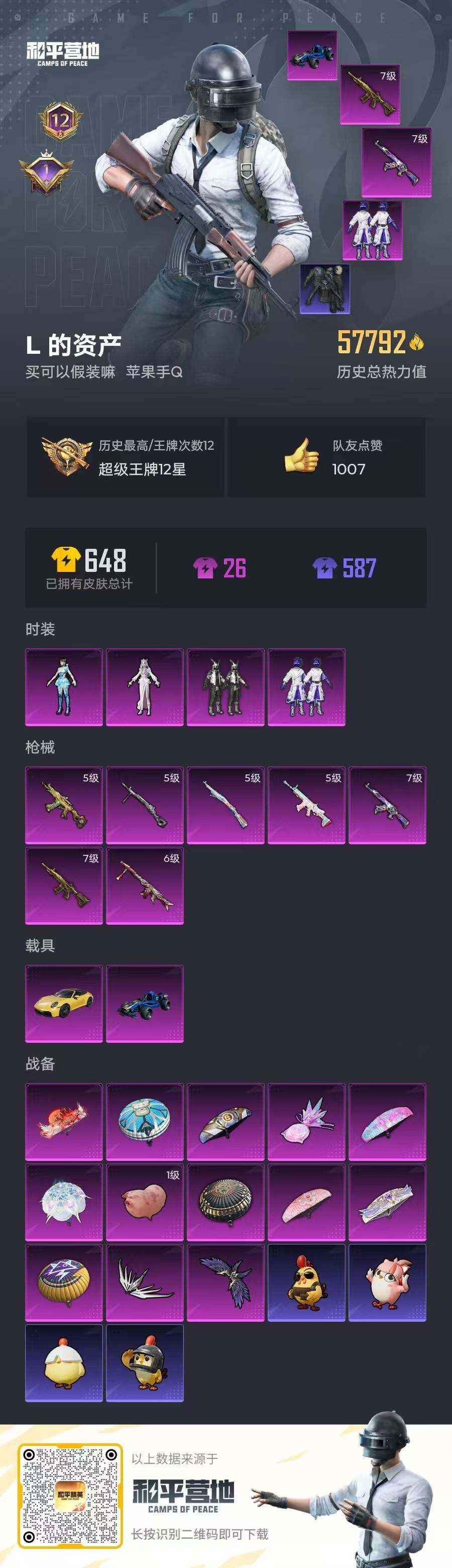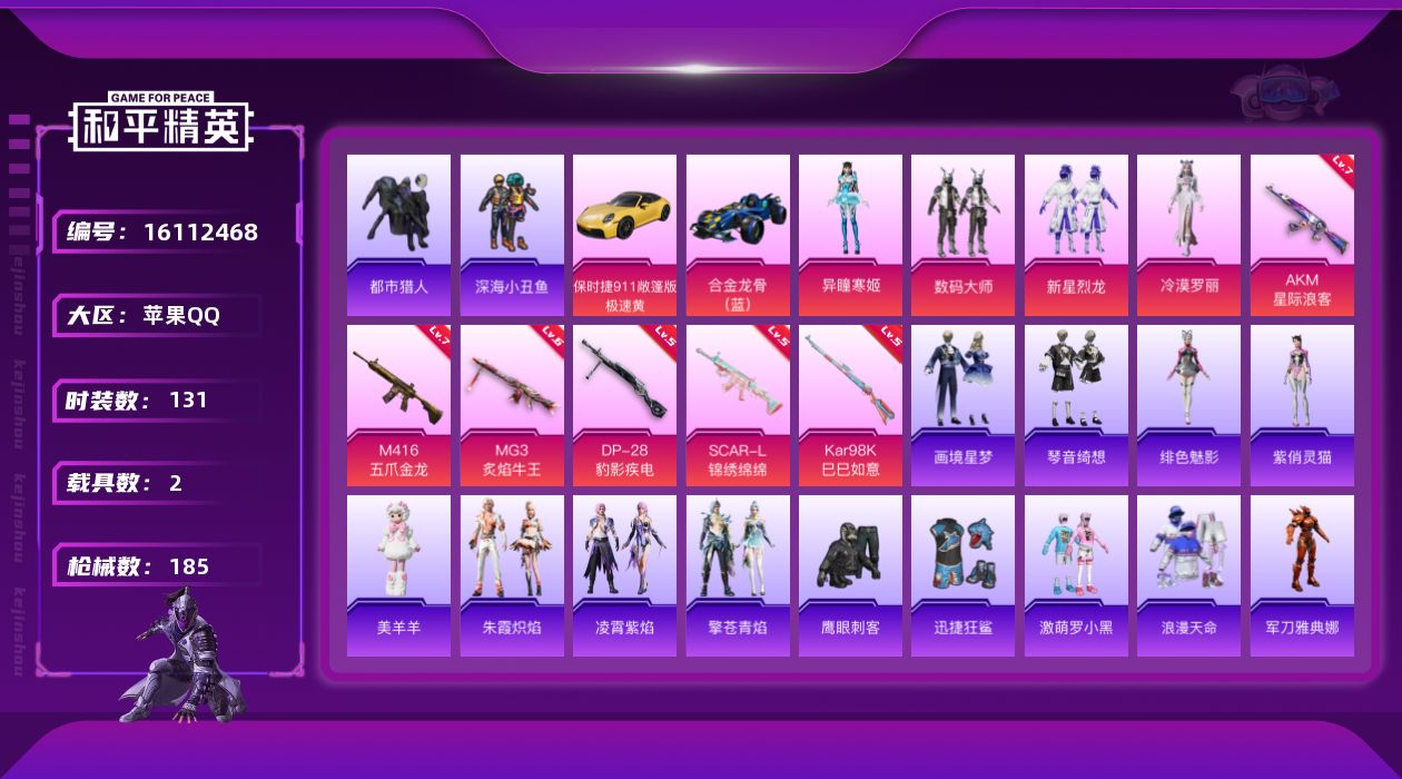 - [16562739]苹果 手Q-4神装-7粉装-17特效枪-3载具-15粉色飞行器-83472热力值-10王牌印记-129套装-236枪皮 【红色神装等级】:魔童闹海-哪吒(一级),金蛇镇世-烛九(一级),盛世惊鸿-云鸾(一级),沙丘之主-图卡盟(三级) 【红色角色神装】:魔童闹海-哪吒,金蛇镇世-烛九,盛世惊鸿-云鸾,沙丘之主-图卡盟 【热门品类】:套装-深海小丑鱼,套装-奇异狩猎者,套装-龟仙人 【粉色套装】:粉装-星之彼岸,角色-洛天依,粉装-恐龙拽拽,粉装-憨憨奶龙,角色-圣堂之誓,套装-创世·救赎,粉装-桃粉嫣然 【粉色枪皮等级】:AKM-炫紫旋律(四级),SCAR-L-锦绣绵绵(五级),SCAR-L-金蛇镇世(三级),M416-风花雪月(五级),M416-墨龙九天(三级),AUG-暖羊咩咩(五级),UMP45-恐龙拽拽(二级),Vector-最终圣卫者(三级),汤姆逊-星月云朵(四级),Kar98K-巳巳如意(五级),M24-镜域双华(三级),Mk14-盛世惊鸿(三级),MK12-雪月幻音(一级),M249-猪猪侠(五级),DP-28-豹影疾电(五级),MG3-洛神天依(五级),破片手榴弹-热量炸弹(五级) 【粉色载具】:拉轰奶龙龙,盛世惊鸿摩托车,僚机-圣域龙宝,护世瑞兽 【粉色枪皮】:AKM-炫紫旋律,SCAR-L-锦绣绵绵,SCAR-L-金蛇镇世,M416-风花雪月,M416-墨龙九天,AUG-暖羊咩咩,UMP45-恐龙拽拽,Vector-最终圣卫者,汤姆逊-星月云朵,Kar98K-巳巳如意,M24-镜域双华,Mk14-盛世惊鸿,MK12-雪月幻音,M249-猪猪侠,DP-28-豹影疾电,MG3-洛神天依,破片手榴弹-热量炸弹 【粉色飞行器】:夜幕颂歌飞行器,沙丘之主天马,祥瑞锦鲤飞行器,花傲天飞行器,镜域双华-灵镜之阶,龙翔九天飞行器,凤舞九天飞行器,万象金身飞行器,圣域金龙飞行器,终晖之翼飞行器,飞天猪飞行器,灵珠游龙飞行器,暮色之舞飞行器 【粉色降落伞】:洛神天依降落伞,恐龙拽拽降落伞,第五大道降落伞,仲夏莫吉托降落伞,未来歌姬降落伞,圣堂之誓降落伞,沙丘之主降落伞,猪猪侠降落伞,蜜语绒猫降落伞,镜域双华降落伞,精灵梦叶罗丽降落伞,盛世惊鸿降落伞,金蛇镇世降落伞,星月云朵降落伞,圣域龙灵降落伞,绯穹魔姬降落伞,魔童闹海 哪吒降落伞,魔童闹海 敖丙降落伞,异瞳寒