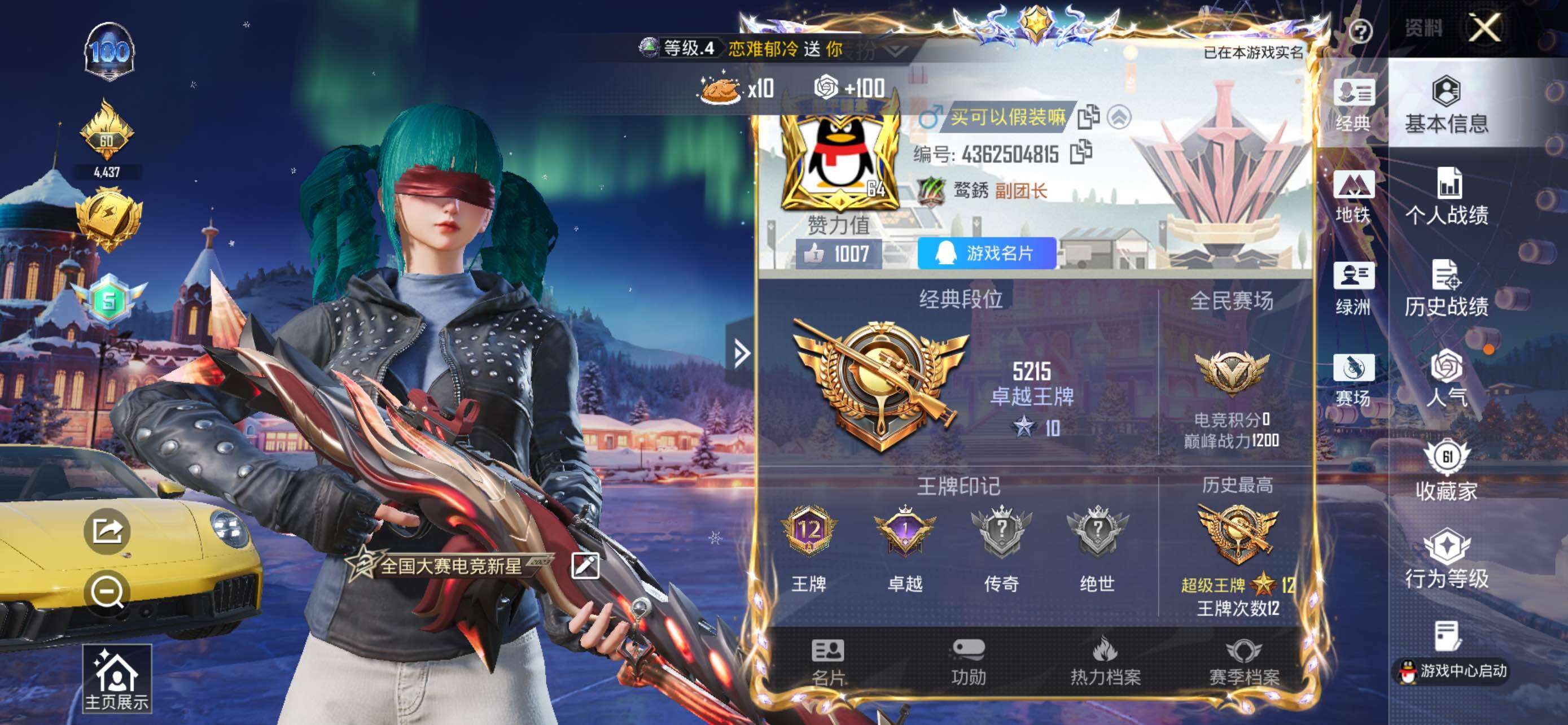- PX_2102731-实名: 可修改 贵族等级: V6 英雄数: 123 皮肤数: 117 星传说: 幽冥火 传说皮: 地狱火 限定皮: 李小龙,飞衡,白虎志,青龙志,鸣野蒿,逐霄战戟