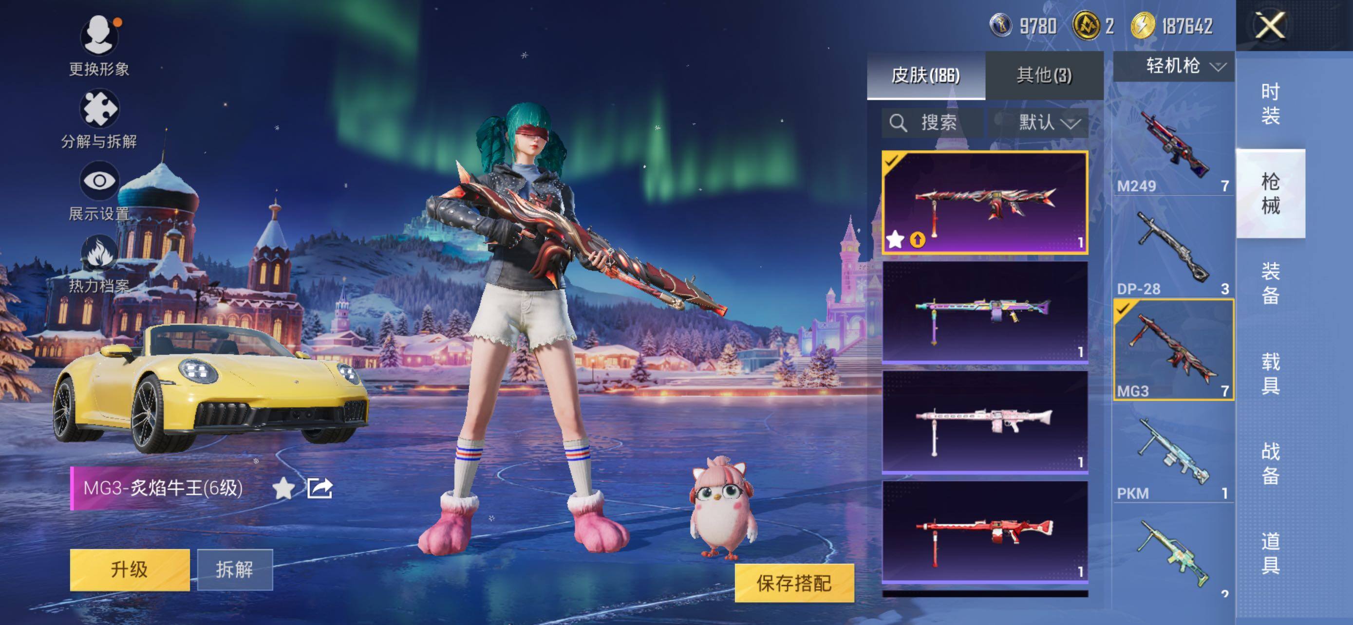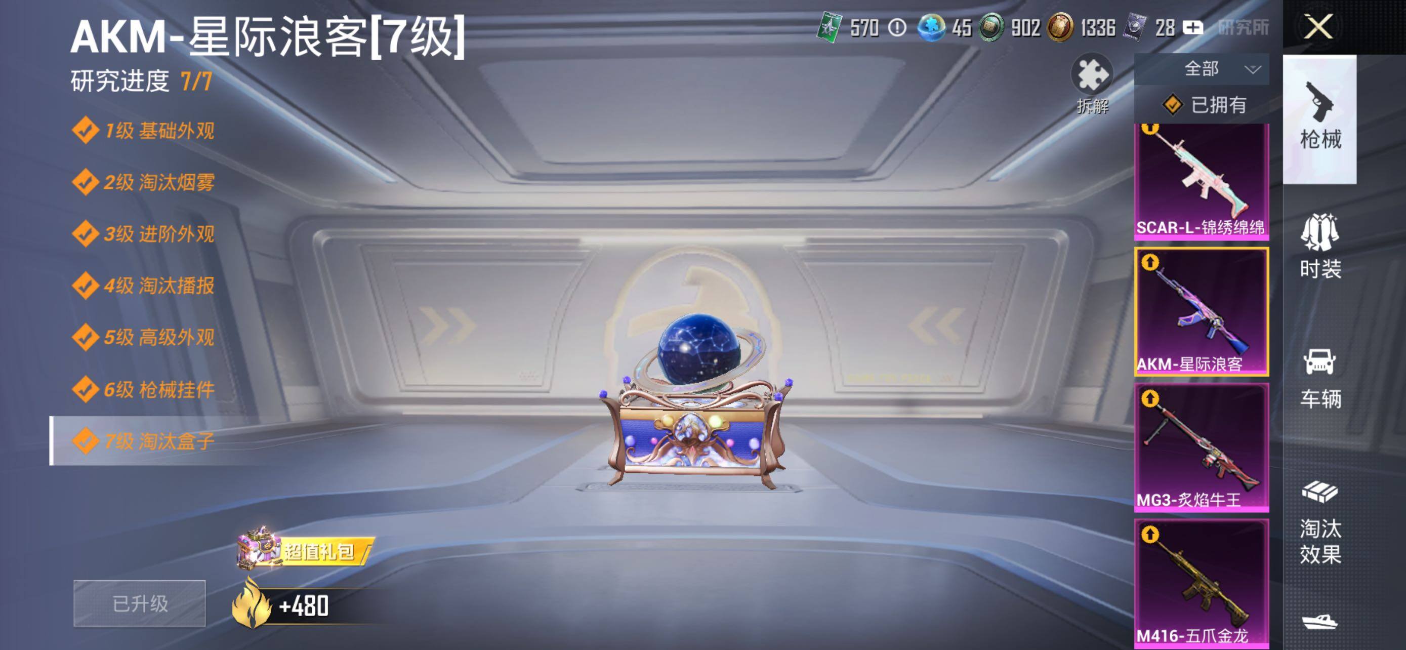 AKM-星际浪客,SCAR-L-锦绣绵绵,M416-五爪金龙,Kar98K-巳巳如意,MG3-炙焰牛王