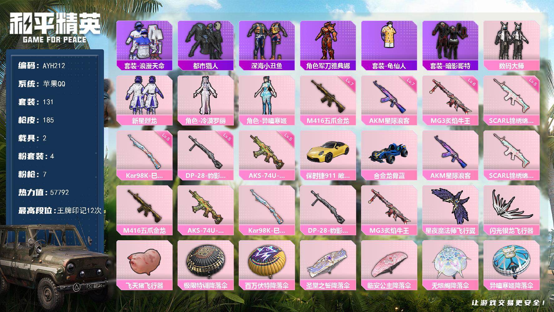 - [16441740]【店主推荐捡漏号!可直接换绑】苹果 手Q-4粉装-12特效枪-1载具-5粉色飞行器-67103热力值-17王牌印记-144套装-224枪皮【热门品类】:套装-浪漫天命,套装-都市猎人,套装-深海小丑鱼,套装-小丑鱼,套装-龟仙人,套装-暗影哥特,角色-Mark.06【粉色套装】:粉装-星之彼岸,粉装-未来歌姬,角色-萨利娅,角色-绯穹魔姬【粉色枪皮等级】:AKM-绿萝繁花(五级),AKM-暮色玫影(三级),M16A4-垂柳戏鸭(一级),SCAR-L-锦绣绵绵(五级),M416-心之恋语(七级),GROZA-镜光银凌(五级),AUG-暖羊咩咩(五级),UMP45-量子极限(一级),Kar98K-巳巳如意(五级),Mk14-甜梦熊击(五级),DP-28-豹影疾电(五级),MG-36-沧焰双生(五级)【粉色载具】:暮色幽蹄【粉色枪皮】:AKM-绿萝繁花,AKM-暮色玫影,M16A4-垂柳戏鸭,SCAR-L-锦绣绵绵,M416-心之恋语,GROZA-镜光银凌,AUG-暖羊咩咩,UMP45-量子极限,Kar98K-巳巳如意,Mk14-甜梦熊击,DP-28-豹影疾电,MG-36-沧焰双生【粉色飞行器】:星之彼岸飞行器,飞天猪飞行器,暮色之舞飞行器