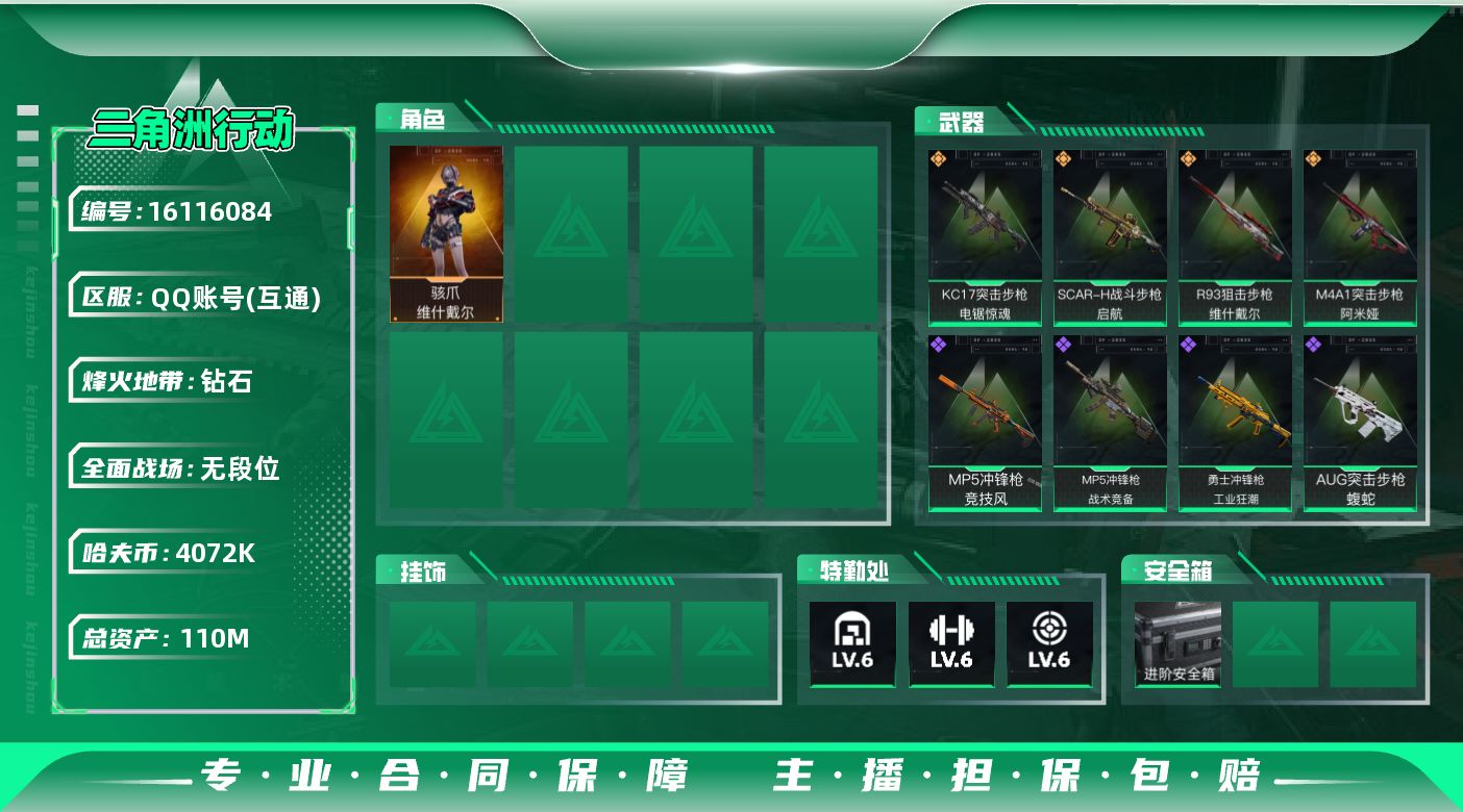 [16116084]【店主推荐捡漏号!可直接换绑】 110m总资产-4072k哈伏币-58烽火等级-钻石-1战场等级-无军衔 【干员外观】:骇爪-维什戴尔 【近战皮肤】:近战-黑鹰 【传说外观】:M4A1突击步枪-阿米娅,SCAR-H战斗步枪-启航,KC17突击步枪-电锯惊魂,R93狙击步枪-维什戴尔 【史诗外观】:AUG突击步枪-蝮蛇,MP5冲锋枪-战术竞备,MP5冲锋枪-竞技风,勇士冲锋枪-工业狂潮 【稀有外观】:AKM突击步枪-肃杀,QBZ95-1突击步枪-公平竞技,M7战斗步枪-捣蛋鬼,K437突击步枪-生存指令,MK47突击步枪-精英联盟,MP5冲锋枪-哈夫克卫队,P90冲锋枪-捣蛋鬼,UZI冲锋枪-亚特兰蒂斯,SMG-45-行动开启,勇士冲锋枪-冰天雪地,QJB201轻机枪-哈夫克卫队,SKS射手步枪-弄臣,SR-25射手步枪-开拓 【普通外观】:M4A1突击步枪-粉色涂装,M4A1突击步枪-海色,QBZ95-1突击步枪-海浪,QBZ95-1突击步枪-三角洲力量,QBZ95-1突击步枪-海色,M16A4突击步枪-高雅黑,AUG突击步枪-浅蓝涂装,SCAR-H战斗步枪-数码迷彩,PTR-32突击步枪-黄蜂,MP5冲锋枪-黄蜂,Vector冲锋枪-几何迷彩,UZI冲锋枪-海色,野牛冲锋枪-高雅黑,M250通用机枪-条纹,SVD狙击步枪-高雅黑,SV-98狙击步枪-红色涂装,沙漠之鹰-高雅黑 【载具外观】:轮式突击炮-荣耀 【军牌】:军牌-永恒,军牌-信誉优秀 【挂饰】:挂饰-窃风密探,挂饰-维什戴尔,挂饰-阿萨拉狙击兵*2,挂饰-阿萨拉霰弹兵*2,挂饰-诡影狙击兵*2,挂饰-诡影喷火兵*2,挂饰-崩岩重炮,挂饰-启程,挂饰-阿萨拉徽章