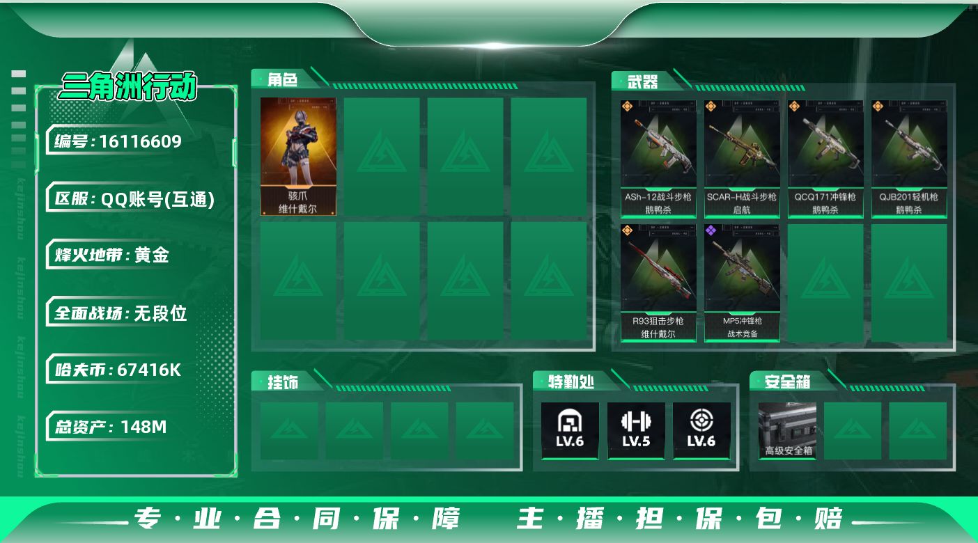 [16116609]【店主推荐捡漏号!可直接换绑】 67416k哈伏币-136m流动资产-53烽火等级-黄金-1战场等级-无军衔 资产148m【干员外观】:骇爪-维什戴尔 【近战皮肤】:近战-黑鹰 【传说外观】:ASh-12战斗步枪-鹅鸭杀,SCAR-H战斗步枪-启航,QCQ171冲锋枪-鹅鸭杀,QJB201轻机枪-鹅鸭杀,R93狙击步枪-维什戴尔 【史诗外观】:MP5冲锋枪-战术竞备 【稀有外观】:QBZ95-1突击步枪-公平竞技,M7战斗步枪-捣蛋鬼,P90冲锋枪-黄昏 【普通外观】:SG552突击步枪-浅蓝涂装,M250通用机枪-条纹,QSZ92G-条纹 【载具外观】:轮式突击炮-荣耀 【挂饰】:挂饰-维什戴尔,挂饰-诡影喷火兵,挂饰-暗行哨兵,挂饰-启程