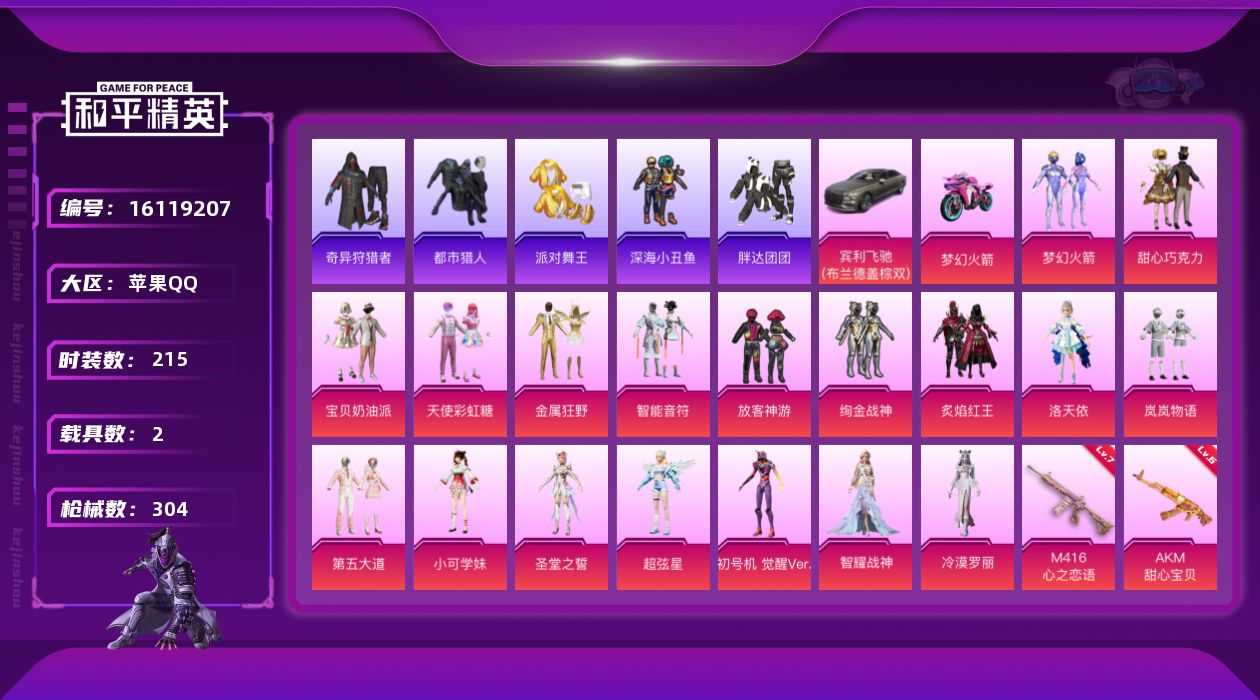 [16119207]【特价出售/店主推荐】苹果 手Q-无敌战神框-18粉装-12特效枪-2载具-6粉色飞行器-106740热力值-17王牌印记-215套装-304枪皮 【热门品类】:粉装-梦幻火箭,套装-浪漫天命,套装-都市猎人,套装-派对舞王,套装-深海小丑鱼,套装-小丑鱼,套装-奇异狩猎者,套装-胖达团团,套装-龟仙人,套装-暗影哥特,角色-8号机,角色-Mark.06 【粉色套装】:粉装-甜心巧克力,粉装-宝贝奶油派,粉装-天使彩虹糖,粉装-梦幻火箭,粉装-金属狂野,粉装-智能音符,粉装-放客神游,粉装-绚金战神,粉装-炙焰红王,角色-洛天依,粉装-岚岚物语,粉装-第五大道,角色-小可学妹,角色-圣堂之誓,角色-超弦星,角色-初号机 觉醒Ver.,角色-智耀战神,角色-冷漠罗丽 【粉色枪皮等级】:AKM-甜心宝贝(六级),AKM-绿萝繁花(五级),SCAR-L-锦绣绵绵(五级),M416-心之恋语(七级),AUG-圣斗士星矢(五级),野牛-青空秋雨(五级),AKS-74U-信仰神谕(五级),Kar98K-巳巳如意(五级),AMR-智耀战神(五级),DP-28-豹影疾电(五级),MG3-洛神天依(五级) 【粉色载具】:宾利飞驰(布罗德盖棕双色),双人摩托-梦幻火箭 【粉色枪皮】:AKM-甜心宝贝,AKM-绿萝繁花,SCAR-L-锦绣绵绵,M416-心之恋语,AUG-圣斗士星矢,野牛-青空秋雨,AKS-74U-信仰神谕,Kar98K-巳巳如意,AMR-智耀战神,DP-28-豹影疾电,MG3-洛神天依,破片手榴弹-粉粉猫爪 【粉色飞行器】:梦幻火箭飞行器,齐天大圣飞行器,天之羽翼飞行器,冠军兔兔飞行器 【粉色降落伞】:幻影战神降落伞,未来战士降落伞,甜心宝贝降落伞,甜蜜誓约降落伞,童趣迷兔降落伞,星之彼岸降落伞,洛神天依降落伞,垂柳戏鸭降落伞,旋转彩虹降落伞,海螺星光降落伞,第五大道降落伞,天星战神降落伞,未来歌姬降落伞,莲影清波降落伞,祥瑞锦鲤降落伞,江南烟雨降落伞,精灵梦叶罗丽降落伞,创世·救赎降落伞,幻影飞狐降落伞,戏水时光降落伞,圣辉之星降落伞,智耀战神降落伞,星穹咏叹调降落伞,冷漠罗丽降落伞,异瞳寒姬降落伞,炫彩糖果降落伞 【稀有套装】:套装-龟仙人,套装-巳巳如意,套装-雪国风尚,套装-炫彩糖果,套装-雏菊兔兔,套装-萝兰蝴蝶,套装-小熊娃娃,角色-拉斐尔,套装-糖糖葫芦