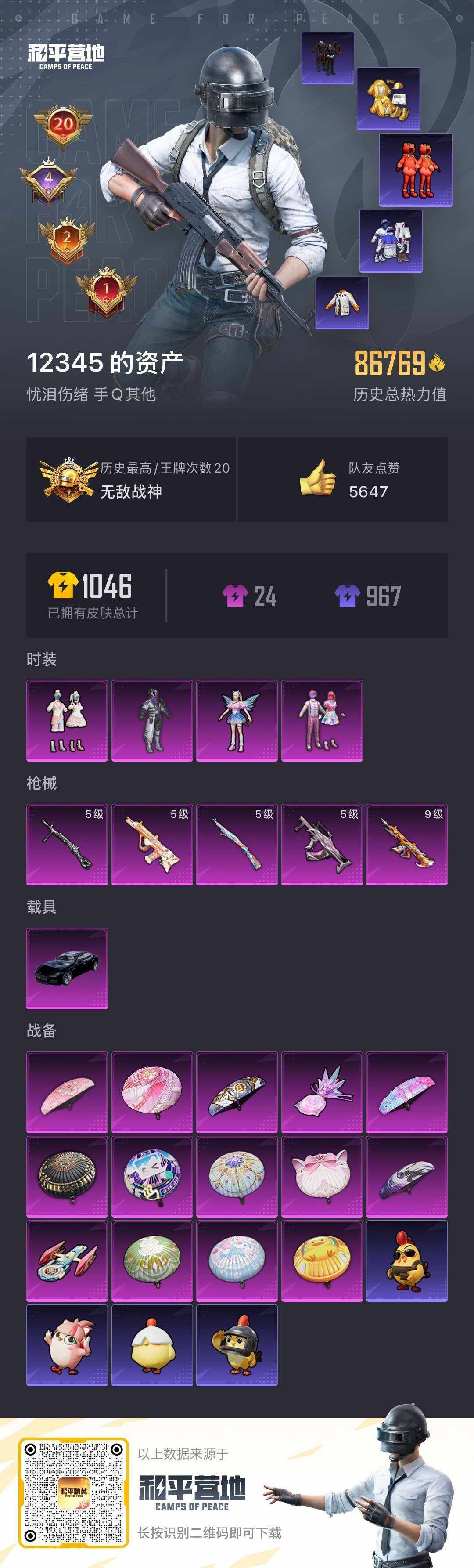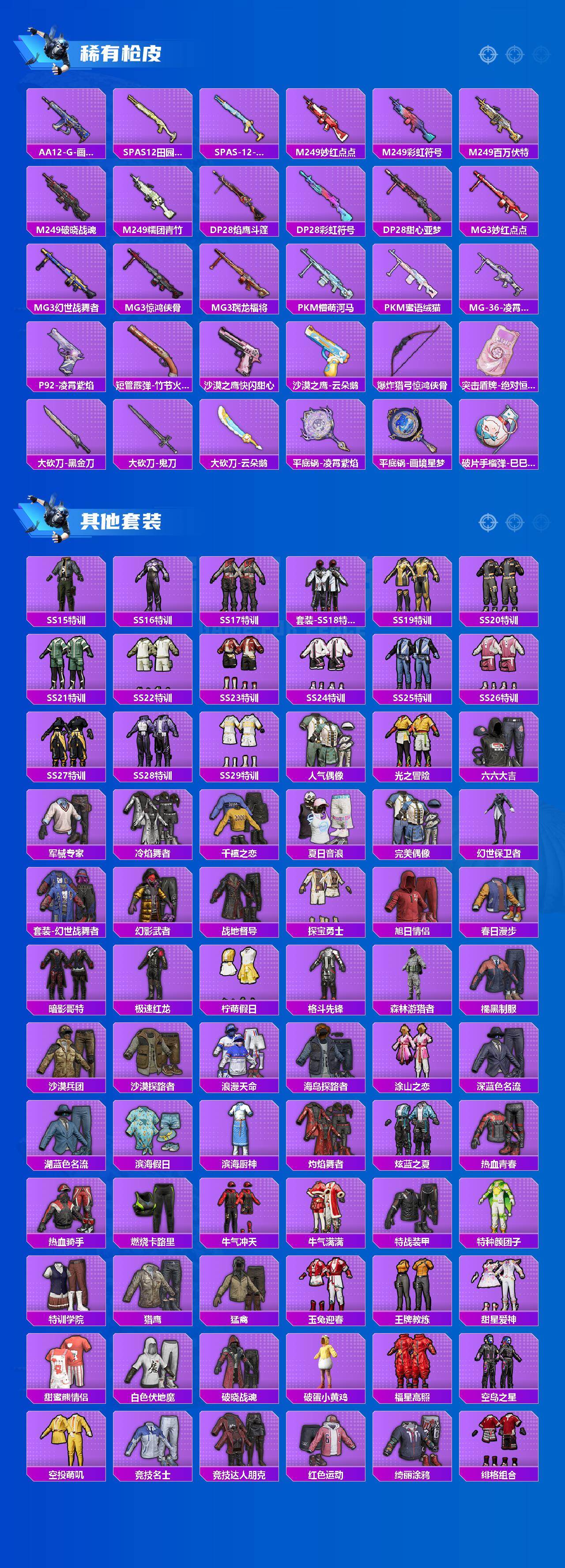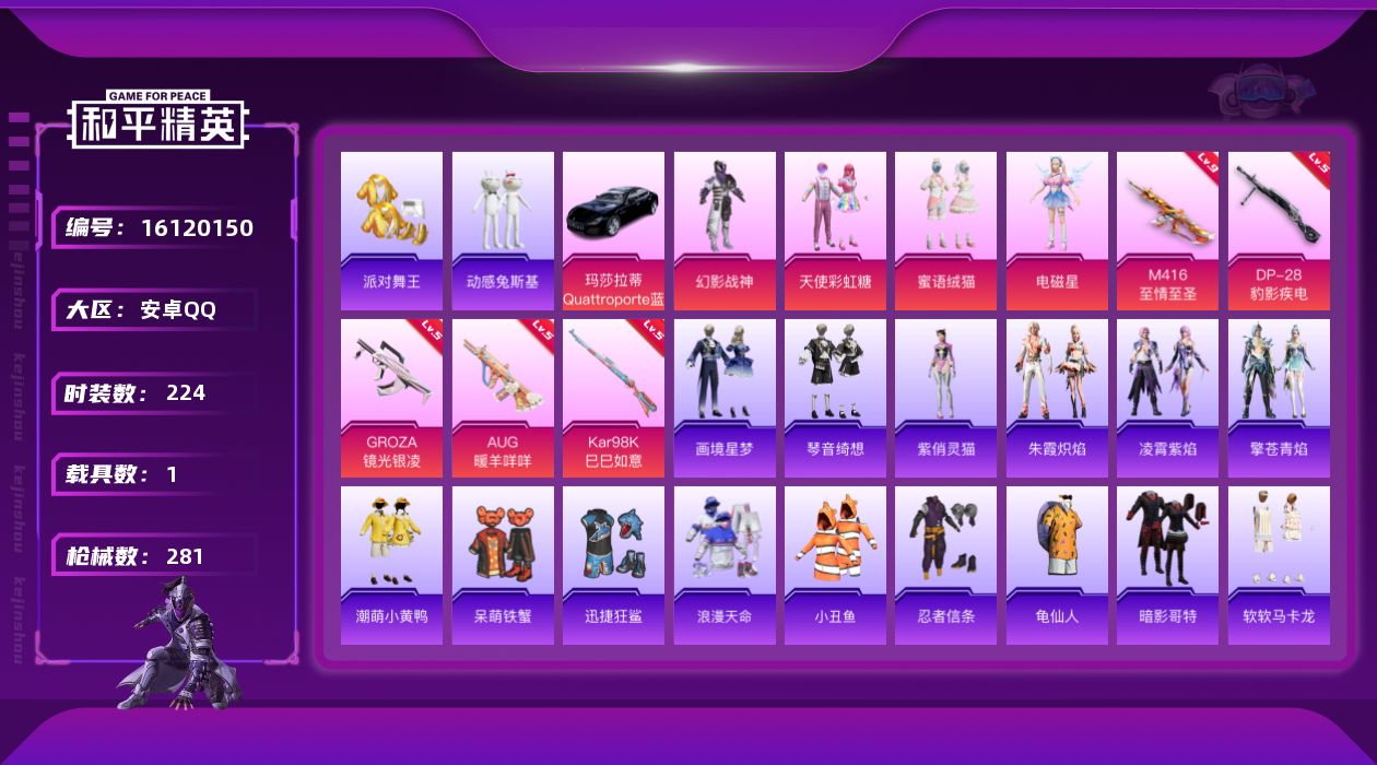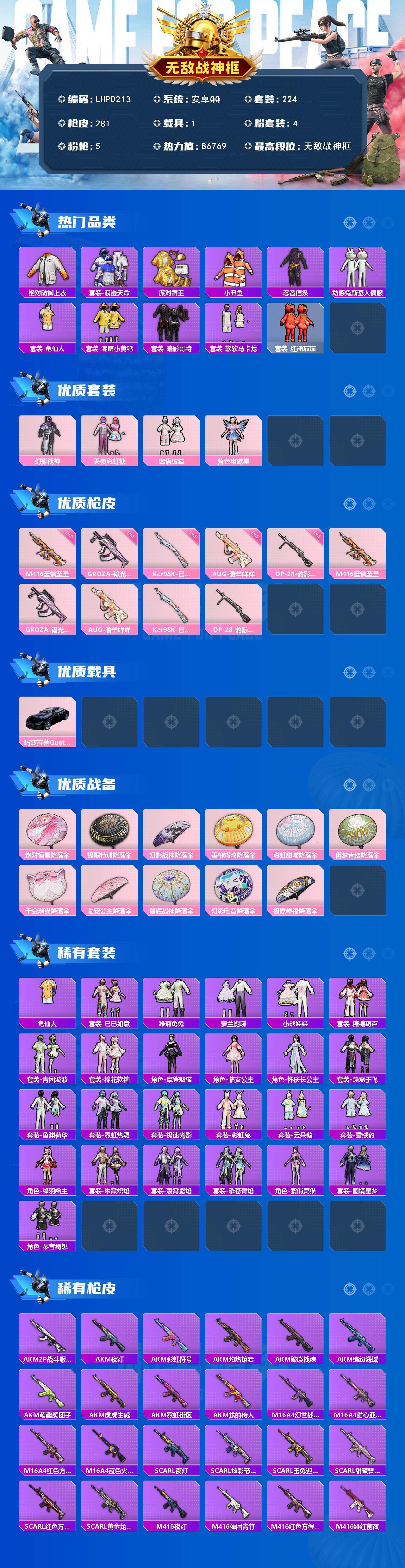 - [16994070]安卓 手Q-5粉装-5特效枪-3载具-4粉色飞行器-66652热力值-4王牌印记-156套装-226枪皮 【热门品类】:套装-深海小丑鱼,套装-龟仙人 【粉色套装】:粉装-蝶舞迷情,粉装-暗星紫秘,角色-复仇流浪者,粉装-星穹咏叹调,角色-异瞳寒姬 【粉色枪皮等级】:GROZA-镜光银凌(五级),Kar98K-巳巳如意(五级),M24-暗星紫秘(七级),DP-28-千金淑猫(四级),DP-28-豹影疾电(五级) 【粉色载具】:兰博基尼Aventador SVJ(翡翠绿),玛莎拉蒂Ghibli(粉),海龙奔腾 【粉色枪皮】:GROZA-镜光银凌,Kar98K-巳巳如意,M24-暗星紫秘,DP-28-千金淑猫,DP-28-豹影疾电 【粉色飞行器】:春暖花开飞行器,天之羽翼飞行器,极意拳锋飞行器 【粉色降落伞】:春暖花开降落伞,梦幻火箭降落伞,银刃赛罗降落伞,暗星紫秘降落伞,碧影闪光降落伞,恐龙拽拽降落伞,垂柳戏鸭降落伞,精灵梦叶罗丽降落伞,拳皇·狂花道降落伞,千金淑猫降落伞,星穹咏叹调降落伞,幻彩电音降落伞,异瞳寒姬降落伞,炫彩糖果降落伞 【稀有套装】:套装-龟仙人,套装-绒宝小鹅,套装-巳巳如意,套装-雪国风尚,套装-炫彩糖果,套装-雏菊兔兔,套装-萝兰蝴蝶,套装-小熊娃娃,套装-糖糖葫芦,套装-青团波波,套装-棉花软糖,角色-都市丽猫,角色-摩登魅猫,套装-燕燕于飞,套装-鱼渊荷华,套装-紫幽梦,套装-蓝冰羽,套装-星影赞美诗,套装-霓虹热舞,套装-极速光影,角色-月烬之祷 【稀有枪皮】:AUG-冰晶雪宝,AKM-夜灯,AKM-奇异狩猎者,AKM-彩虹符号,AKM-影袭,AKM-春暖花开,AKM-破晓战魂,AKM-虎虎生威,AKM-霓虹街区,AKM-龙的传人,M16A4-幻世战舞者,M16A4-红色方程式,M16A4-蓝色火焰,M16A4-千金淑猫,SCAR-L-夜灯,SCAR-L-炫彩节奏,SCAR-L-玉兔迎春,SCAR-L-碧影闪光,SCAR-L-红色方程式,M416-暗星紫秘,M416-糯团青竹,M416-红色方程式,M416-蓝色火焰,GROZA-异彩先驱,GROZA-影袭,GROZA-春暖花开,GROZA-治愈之星,AUG-天降萌叽,AUG-耀粉歌者,QBZ-飞驰魅影,M762-天降萌叽,M762-瑞龙福将,Mk47-洛神天依,G36C-星穹咏叹调,A