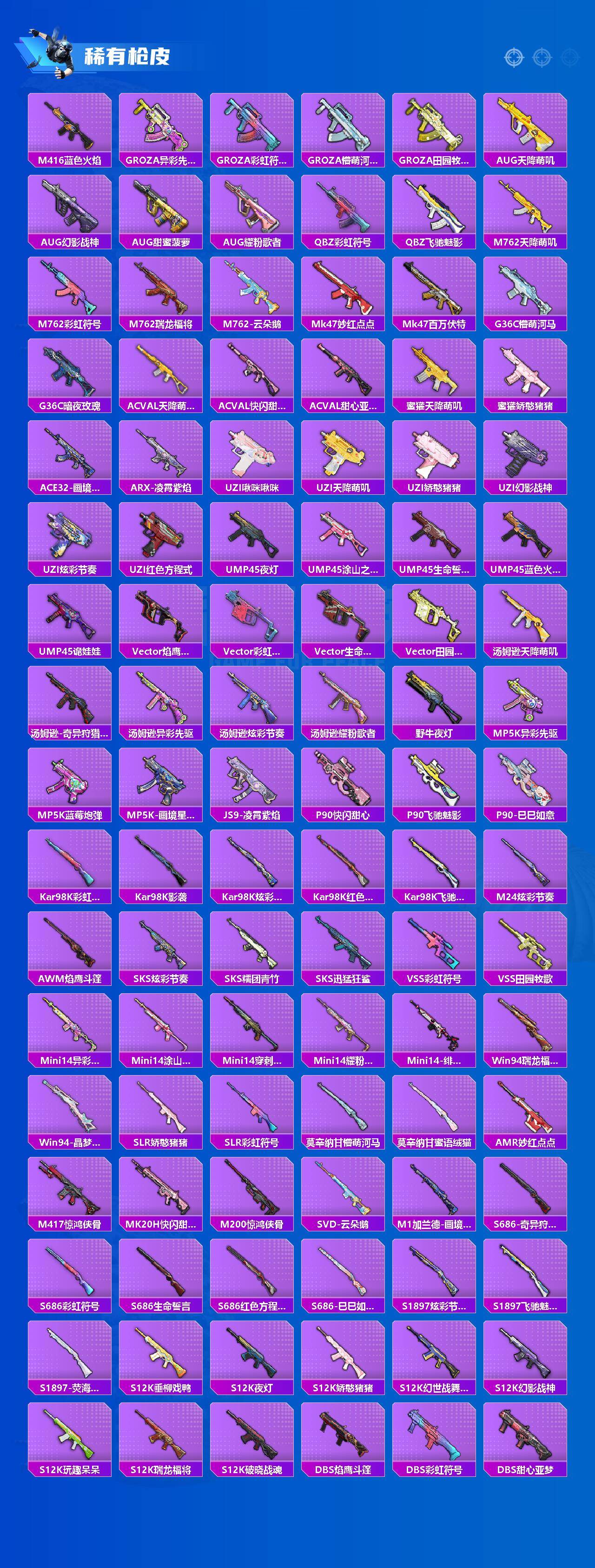 M416-至情至圣,GROZA-镜光银凌,AUG-暖羊咩咩,Kar98K-巳巳如意