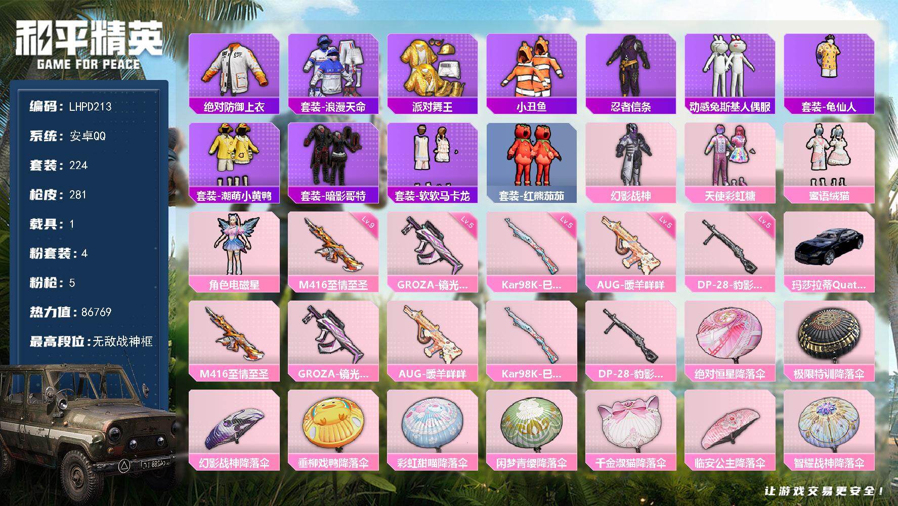 [16120150]【特价出售/店主推荐】安卓 手Q-无敌战神框-4粉装-5特效枪-1载具-2粉色飞行器-86769热力值-20王牌印记-224套装-281枪皮【热门品类】:绝对防御上衣,套装-浪漫天命,套装-派对舞王,套装-小丑鱼,套装-忍者信条,套装-动感兔斯基人偶服,套装-龟仙人,套装-潮萌小黄鸭,套装-暗影哥特,套装-软软马卡龙,套装-红熊茄茄【粉色套装】:粉装-幻影战神,粉装-天使彩虹糖,粉装-蜜语绒猫,角色-电磁星【粉色枪皮等级】:M416-至情至圣(九级),GROZA-镜光银凌(五级),AUG-暖羊咩咩(五级),Kar98K-巳巳如意(五级),DP-28-豹影疾电(五级)【粉色载具】:玛莎拉蒂Quattroporte(夜幕蓝)【粉色枪皮】:M416-至情至圣,GROZA-镜光银凌,AUG-暖羊咩咩,Kar98K-巳巳如意,DP-28-豹影疾电