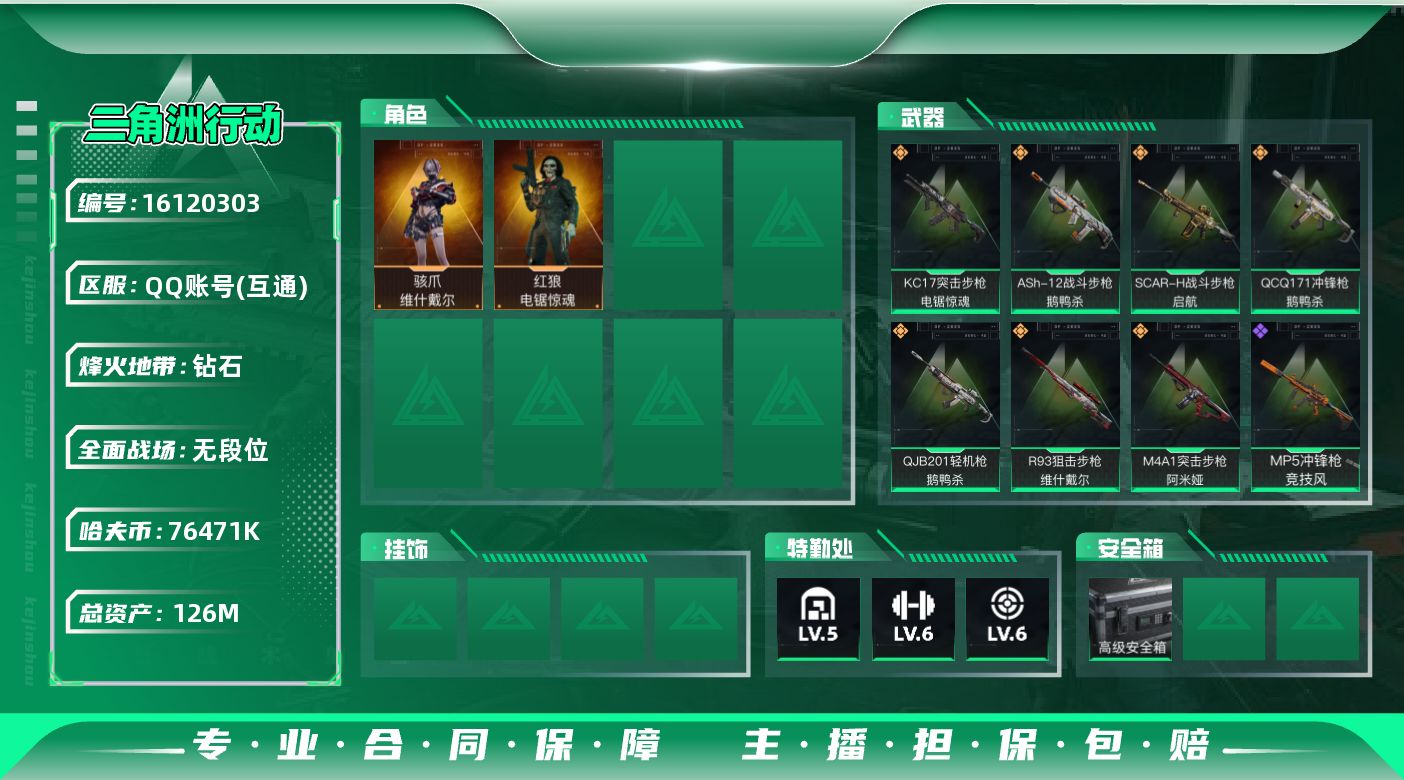 [16120303]【店主推荐捡漏号!可直接换绑】76471k哈伏币-115m流动资产-60烽火等级-钻石-1战场等级-无军衔 【干员外观】:骇爪-维什戴尔,红狼-电锯惊魂 【近战皮肤】:近战-黑鹰 【传说外观】:M4A1突击步枪-阿米娅,ASh-12战斗步枪-鹅鸭杀,SCAR-H战斗步枪-启航,KC17突击步枪-电锯惊魂,QCQ171冲锋枪-鹅鸭杀,QJB201轻机枪-鹅鸭杀,R93狙击步枪-维什戴尔 【史诗外观】:QBZ95-1突击步枪-曙光,腾龙突击步枪-猎鳄行动,MP5冲锋枪-战术竞备,MP5冲锋枪-竞技风,勇士冲锋枪-工业狂潮,SVD狙击步枪-阿萨拉工艺,SV-98狙击步枪-猎鳄行动 【稀有外观】:AKM突击步枪-肃杀,QBZ95-1突击步枪-公平竞技,M7战斗步枪-捣蛋鬼,SCAR-H战斗步枪-荣耀列队,腾龙突击步枪-冰天雪地,MP5冲锋枪-哈夫克卫队,P90冲锋枪-黄昏,P90冲锋枪-捣蛋鬼,UZI冲锋枪-亚特兰蒂斯,SMG-45-行动开启,勇士冲锋枪-冰天雪地,QJB201轻机枪-哈夫克卫队,Mini-14射手步枪-荣耀列队,G18-星链科技,G18-哈夫克航天 【普通外观】:M4A1突击步枪-粉色涂装,M4A1突击步枪-高雅黑,QBZ95-1突击步枪-三角洲力量,QBZ95-1突击步枪-海色,QBZ191突击步枪-三角洲力量,K416突击步枪-几何迷彩,M16A4突击步枪-高雅黑,M7战斗步枪-红色涂装,SG552突击步枪-三角洲力量,SG552突击步枪-浅蓝涂装,SG552突击步枪-海浪,SCAR-H战斗步枪-数码迷彩,PTR-32突击步枪-黄蜂,MP5冲锋枪-黄蜂,野牛冲锋枪-高雅黑,M1014霰弹枪-高雅黑,M249轻机枪-黄蜂,M250通用机枪-条纹,SVD狙击步枪-高雅黑,SR-25射手步枪-黄蜂,QSZ92G-条纹,沙漠之鹰-高雅黑 【载具外观】:轮式突击炮-荣耀 【军牌】:军牌-静谧时光,军牌-永恒,军牌-信誉优秀 【挂饰】:挂饰-维什戴尔,挂饰-阿萨拉狙击兵*2,挂饰-阿萨拉霰弹兵*2,挂饰-诡影狙击兵*3,挂饰-诡影喷火兵,挂饰-崩岩重炮*2,挂饰-暗行哨兵*3,挂饰-启程,挂饰-阿萨拉徽章*6