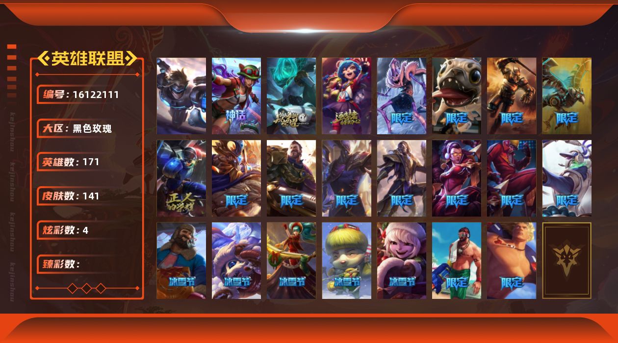 [16122111]【店主推荐捡漏号】未定级段位-171英雄-141皮肤-4炫彩-1终极-3神话-20限定-21传说-49史诗