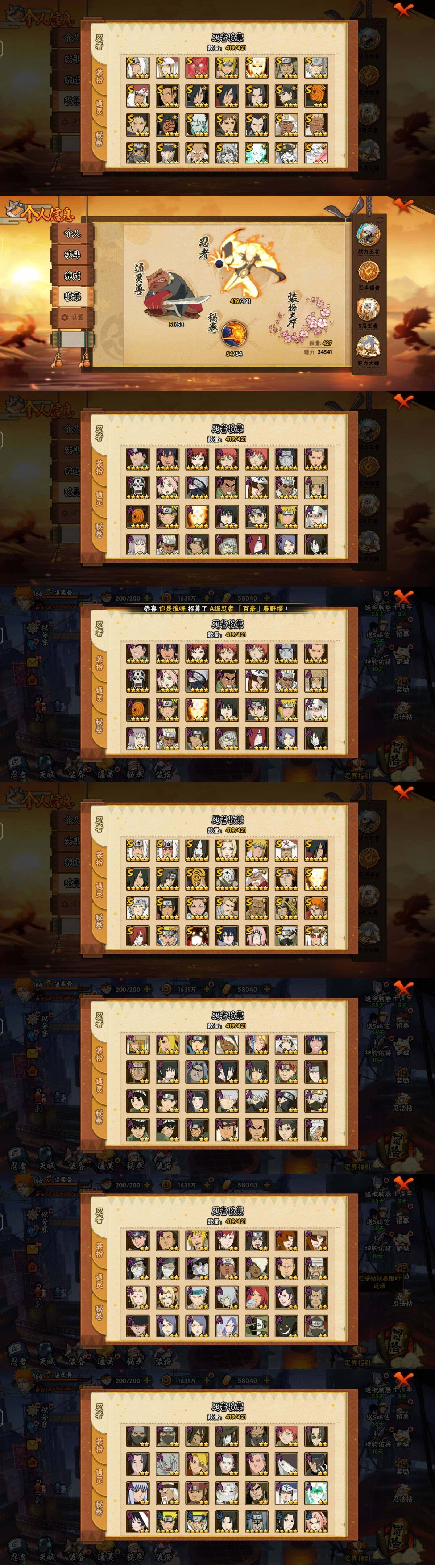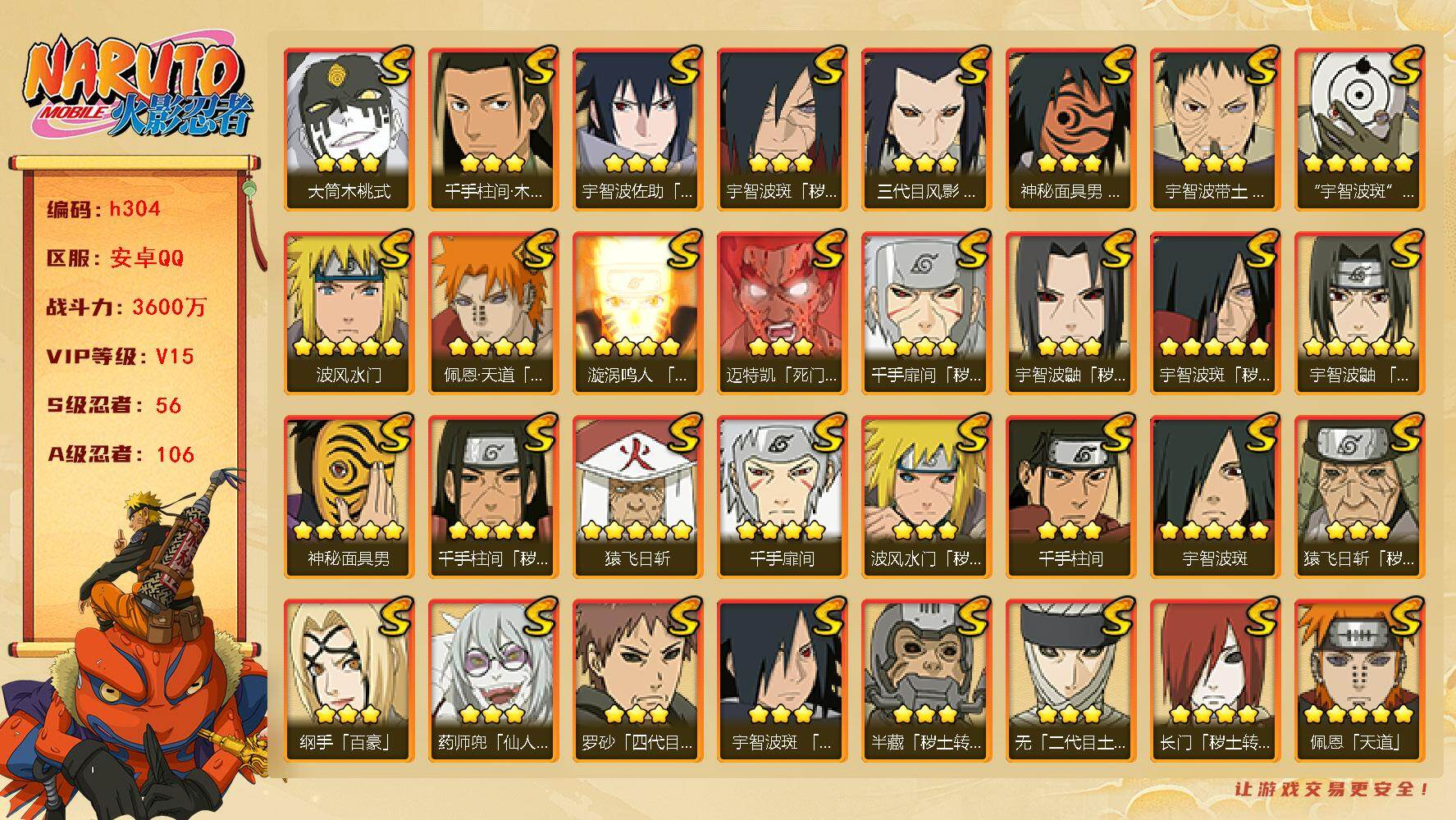 【S级忍者】:长门「秽土转生」(4星),三代目风影「秽土转生」(3星),半藏「秽土转生」(3星),金角·银角「秽土转生」(4星),猿飞日斩「秽土转生」(3星),波风水门「秽土转生」(3星),千手扉间「秽土转生」(3星),千手柱间「秽土转生」(4星),宇智波鼬「秽土转生」(3星),宇智波斑「秽土转生」(5星),宇智波斑「秽土转生·解」(3星),大野木「忍界大战」(3星),春野樱「忍界大战」(3星),宇智波带土「忍界大战」(3星),艾「忍界大战」(3星),宇智波鼬「须佐能乎」(5星),宇智波止水「须佐能乎」(3星),旗木卡卡西「须佐能乎」(3星),宇智波斑「木叶创立」(3星),千手柱间「木叶创立」(3星),无「二代目土影」(3星),艾「四代目雷影」(3星),罗砂「四代目风影」(3星),鬼灯幻月「二代目水影」(4星),大野木「三代目土影」(5星),艾「三代目雷影」(4星),烈斗「初代目风影」(4星),自来也(5星),自来也「仙人模式」(5星),自来也「舞之豪杰」(4星),大蛇丸(5星),自来也「传说中的三忍」(3星),纲手(5星),纲手「百豪」(3星),千手柱间(3星),千手扉间(4星),猿飞日斩(5星),宇智波斑(5星),波风水门(5星),药师兜「仙人模式」(3星),神秘面具男(5星),神秘面具男「红夜之刃」(3星),漩涡鸣人「九喇嘛连结」(4星),迈特凯「死门」(3星),佩恩「天道」(5星),佩恩·天道「超」(4星),宇智波佐助「永恒万花筒」(3星),宇智波斑 「白面具」(5星宇智波斑「白面具」),大筒木金式(3星),大筒木桃式(3星),大筒木舍人「最终章」(3星),漩涡鸣人「暴怒·第六尾」(3星),波风水门「九喇嘛连结」(3星),宇智波斑「五影会谈」(3星),漩涡鸣人·宇智波佐助(3星),宇智波带土「十尾人柱力」(3星)