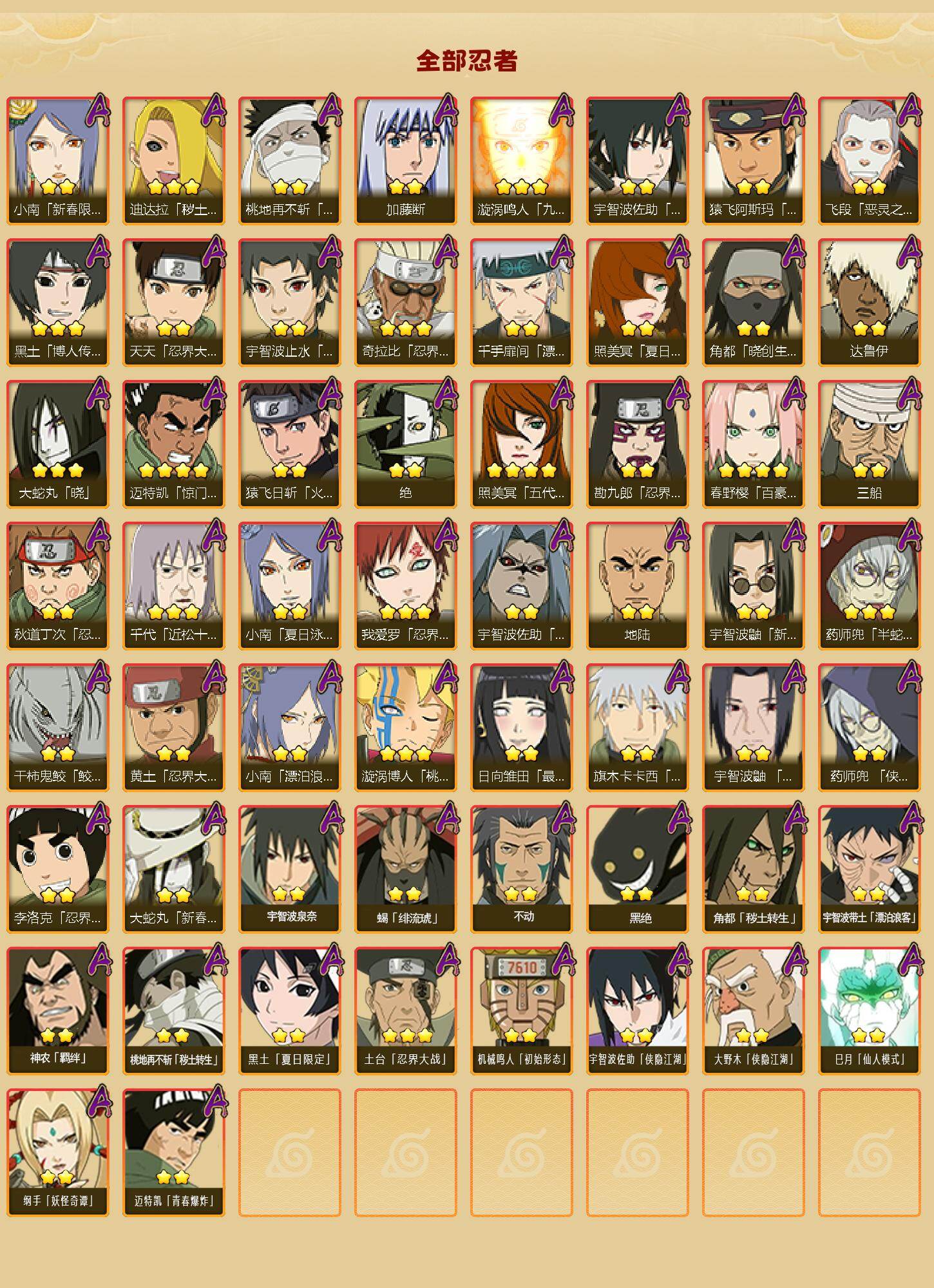 【A级忍者】:艾「青年」(2星),三船「青年」(2星),三船(2星),长门「青年」(3星),波风水门「青年」(3星),波风水门「新春限定」(2星),达鲁伊「博人传」(3星),达鲁伊(2星),迪达拉(3星),迪达拉「新春限定」(2星),迪达拉「秽土转生」(3星),大蛇丸「晓」(3星),大蛇丸「新春限定」(2星),奇拉比(4星),奇拉比「忍界大战」(3星),飞段(5星),飞段「死司凭血」(5星),飞段「晓创生」(2星