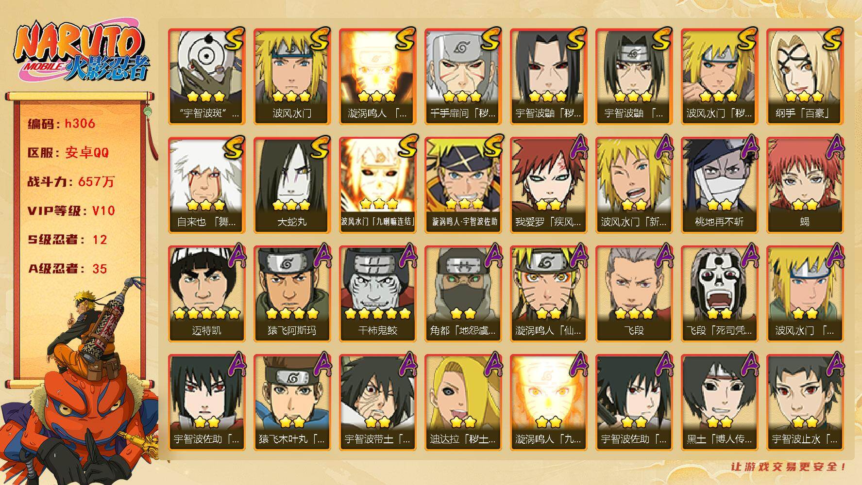 【S级忍者】:波风水门「秽土转生」(3星),千手扉间「秽土转生」(3星),宇智波鼬「秽土转生」(3星),宇智波鼬「须佐能乎」(3星),自来也「舞之豪杰」(3星),大蛇丸(3星),纲手「百豪」(3星),波风水门(3星),漩涡鸣人「九喇嘛连结」(3星),宇智波斑 「白面具」(3星宇智波斑「白面具」),波风水门「九喇嘛连结」(3星),漩涡鸣人·宇智波佐助(3星)