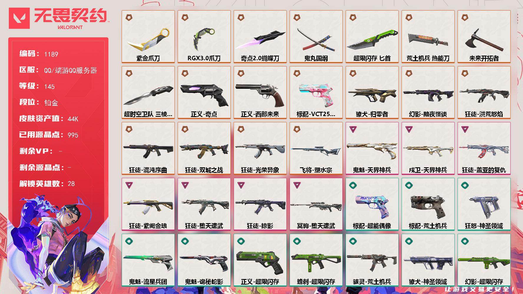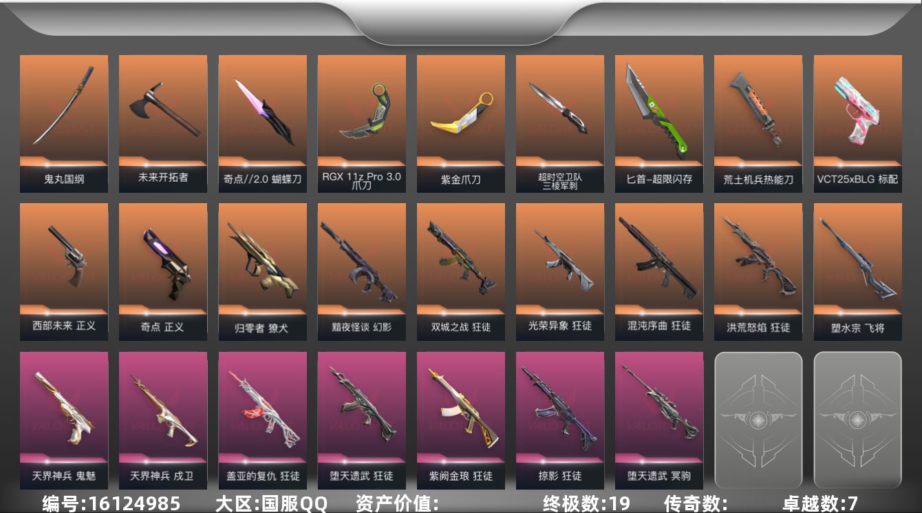 [16124985]【英雄】:幻棱,炼狱,维斯,暮蝶,钛狐,壹决,铁臂,捷风,雷兹,幽影,不死鸟,贤者,猎枭,蝰蛇,零,芮娜,奇乐,尚勃勒,霓虹,斯凯,夜露,星礈,K/O,海神,盖可,黑梦,钢锁 【近战武器】:近战武器-超时空卫队 三棱军刺,近战武器-奇点//2.0 蝴蝶刀,近战武器-紫金爪刀,近战武器-RGX 11z Pro//3.0 爪刀,近战武器-鬼丸国纲,近战武器-未来开拓者,近战武器-超限闪存 匕首,近战武器-荒土机兵 热能刀 【狂徒】:狂徒-洪荒怒焰,狂徒-混沌序曲,狂徒-双城之战,狂徒-光荣异象,狂徒-堕天遗武,狂徒-掠影,狂徒-盖亚的复仇,狂徒-紫阙金琅,狂徒-荒土机兵 【幻影】:幻影-黯夜怪谈,幻影-超限闪存,幻影-神圣领域,幻影-纳米打击 【戍卫】:戍卫-天界神兵,戍卫-浮光跃金,戍卫-逆冲蛮牛,戍卫-月球哨兵 【獠犬】:獠犬-归零者,獠犬-神圣领域,獠犬-模拟赫兹,獠犬-逆冲蛮牛 【冥驹】:冥驹-堕天遗武,冥驹-荒土机兵,冥驹-模拟赫兹 【飞将】:飞将-塑水宗 【莽侠】:莽侠-超限闪存,莽侠-月球哨兵 【战神】:战神-神圣领域,战神-浮光跃金 【奥丁】:奥丁-纳米打击 【判官】:判官-纳米打击x 【雄鹿】:雄鹿-模拟赫兹,雄鹿-逆冲蛮牛,雄鹿-月球哨兵 【骇灵】:骇灵-荒土机兵,骇灵-浮光跃金,骇灵-星云暗涌 【蜂刺】:蜂刺-超限闪存,蜂刺-星云暗涌 【标配】:标配-超能偶像,标配-荒土机兵,标配-浮光跃金 【VCT手枪】:标配-VCT25 x BLG 【正义】:正义-奇点,正义-西部未来,正义-超限闪存,正义-纳米打击,正义-月球哨兵 【鬼魅】:鬼魅-天界神兵,鬼魅-流星兵团,鬼魅-诡秘蛇影,鬼魅-模拟赫兹 【狂怒】:狂怒-神圣领域,狂怒-逆冲蛮牛 【卡面】:终章:激斗汉堡 卡面,进入射程 卡面,分崩离析 卡面,纳米打击 卡面,抑制技术 卡面,激斗汉堡 卡面,瓦娃脸雪糕 P2 卡面,从黄昏到黎明 卡面,荒土机兵 卡面,银弹猎手 卡面,逆冲蛮牛 卡面,《双城之战》拥抱 卡面,精灵大战 卡面,欢迎来到底城 卡面,南瓜盛典 卡面,VCT CN首冠 卡面,唱片的故事 卡面,钢弓与箭弦 卡面,排除故障 卡面,战术桌游 卡面,悠享食光 卡面,修车达人 卡面,热舞环节 卡面,模拟赫兹 卡面,浮光跃金 卡面,超限闪存 卡面,维斯工牌 卡面,正义的化身 卡面,终章:生意人麦宝