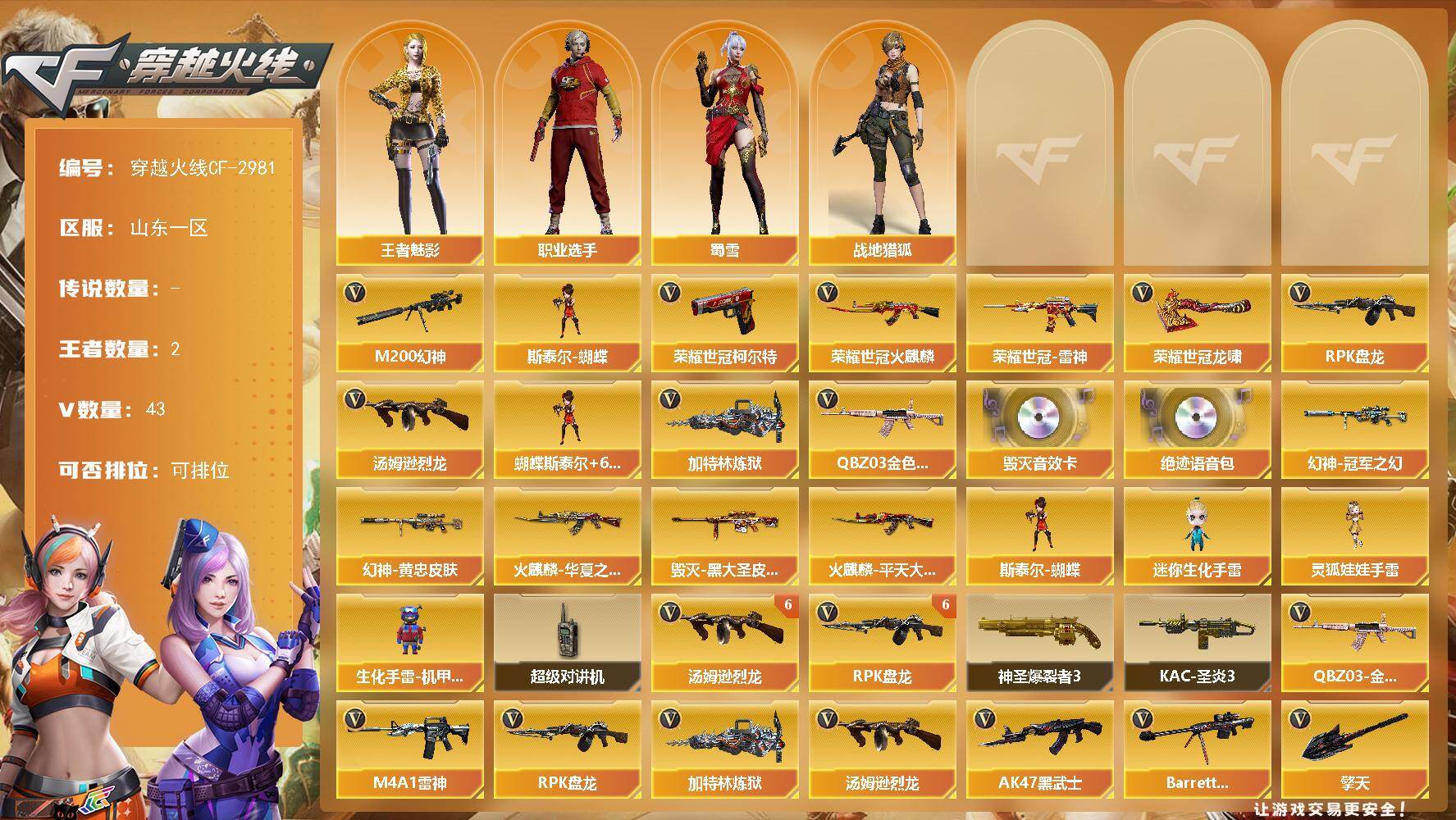 [16125485]山东一区-43V-2王者-0炫金 【热门武器】:QBZ03-金色蔷薇,M200-幻神,荣耀世冠-火麒麟,荣耀世冠-雷神,荣耀世冠-柯尔特,汤姆逊-烈龙*6,RPK-盘龙*6,加特林-炼狱*2,斯泰尔-蝴蝶,荣耀世冠-龙啸 【音效卡】:Barrett-毁灭音效卡,绝迹语音包 【稀有皮肤】:M200-幻神-黄忠皮肤,幻神-冠军之幻,火麒麟-华夏之心,火麒麟-平天大圣,毁灭-黑大圣皮肤 【角色】:王者-魅影,战地猎狐,蜀雪,职业选手 【人偶武器】:斯泰尔-蝴蝶,迷你生化手雷,灵狐娃娃手雷,生化手雷-机甲核心 【暴走生化】:斯泰尔-蝴蝶,超级对讲机 【挑战大师】:神圣爆裂者III,KAC-圣炎切割者III 【英雄级武器】:斩神刀-雷暴,荣耀世冠-火麒麟,荣耀世冠-雷神,荣耀世冠-柯尔特,荣耀世冠-龙啸,QBZ03-金色蔷薇,M4A1-雷神,RPK-盘龙*6,加特林-炼狱*2,汤姆逊-烈龙*6,AK47-黑武士,Barrett-毁灭,M200-幻神,黑骑士-海王,M4A1-赤狱骑士,擎天*4,龙啸 【特殊枪械】:蝴蝶斯泰尔+6烈龙,6烈龙,6盘龙,2炼狱,1蝴蝶斯泰尔