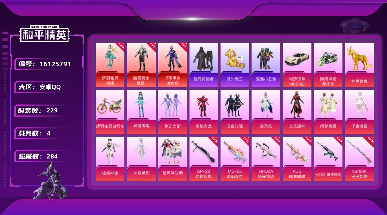 [16125791]【店主推荐捡漏号!可直接换绑】安卓 手Q-3神装-11粉装-13特效枪-4载具-12粉色飞行器-109906热力值-14王牌印记-229套装-284枪皮【红色神装等级】:辉羽雀灵-初翊(四级),幽焰骑士-维塔(一级),宇宙意志-塞卢姆(一级)【红色角色神装】:辉羽雀灵-初翊,幽焰骑士-维塔,宇宙意志-塞卢姆【热门品类】:粉装-梦幻火箭,套装-派对舞王,套装-深海小丑鱼,套装-奇异狩猎者,套装-龟仙人,套装-暗影哥特,角色-Mark.06,小恶魔头饰【粉色载具】:玛莎拉蒂MC20(星石白),幽焰风驰摩托车,护世瑞兽,辉羽雀灵自行车【粉色套装】:粉装-梦幻火箭,粉装-炙焰赤龙,粉装-暗夜玫瑰,角色-洛天依,粉装-炎氏战神,粉装-闲梦青缨,角色-千金淑猫,角色-信仰神谕,角色-女娲灵识,粉装-星穹咏叹调,角色-异瞳寒姬【粉色枪皮等级】:AKM-幽焰骑士(三级),M416-墨龙九天(三级),GROZA-镜光银凌(五级),AUG-暖羊咩咩(五级),M762-青锋波束(五级),UMP45-宇宙意志(三级),Vector-最终圣卫者(三级),Kar98K-巳巳如意(五级),Mk14-盛世惊鸿(三级),AMR-智耀战神(四级),DP-28-豹影疾电(五级),MG3-辉羽雀灵(三级),MG-36-沧焰双生(五级)【粉色枪皮】:AKM-幽焰骑士,M416-墨龙九天,GROZA-镜光银凌,AUG-暖羊咩咩,M762-青锋波束,UMP45-宇宙意志,Vector-最终圣卫者,Kar98K-巳巳如意,Mk14-盛世惊鸿,AMR-智耀战神,DP-28-豹影疾电,MG3-辉羽雀灵,MG-36-沧焰双生【粉色飞行器】:酣梦熊熊飞行器,繁龙极客飞行器,镜域双华-灵镜之阶,龙翔九天飞行器,深渊漩涡飞行器,幽焰列车飞行器,动力核心飞行器,凤舞九天飞行器,万象金身飞行器,雀灵庇佑飞行器,终晖之翼飞行器