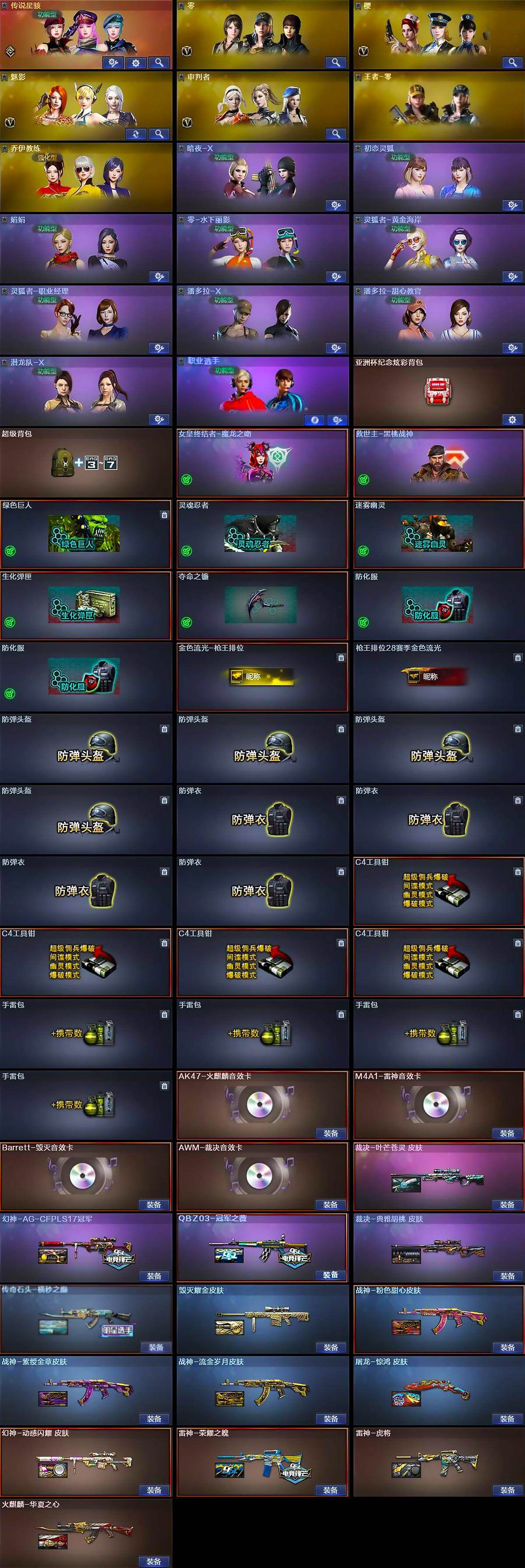 【道具】:亚洲杯纪念炫彩背包,超级背包,女皇终结者-魔龙之吻,救世主-黑桃战神,绿色巨人,灵魂忍者,迷雾幽灵,生化弹匣,夺命之镰,防化服*2,金色流光-枪王排位,枪王排位28赛季金色流光,防弹头盔*4,防弹衣*4,C4工具钳*4,手雷包*4