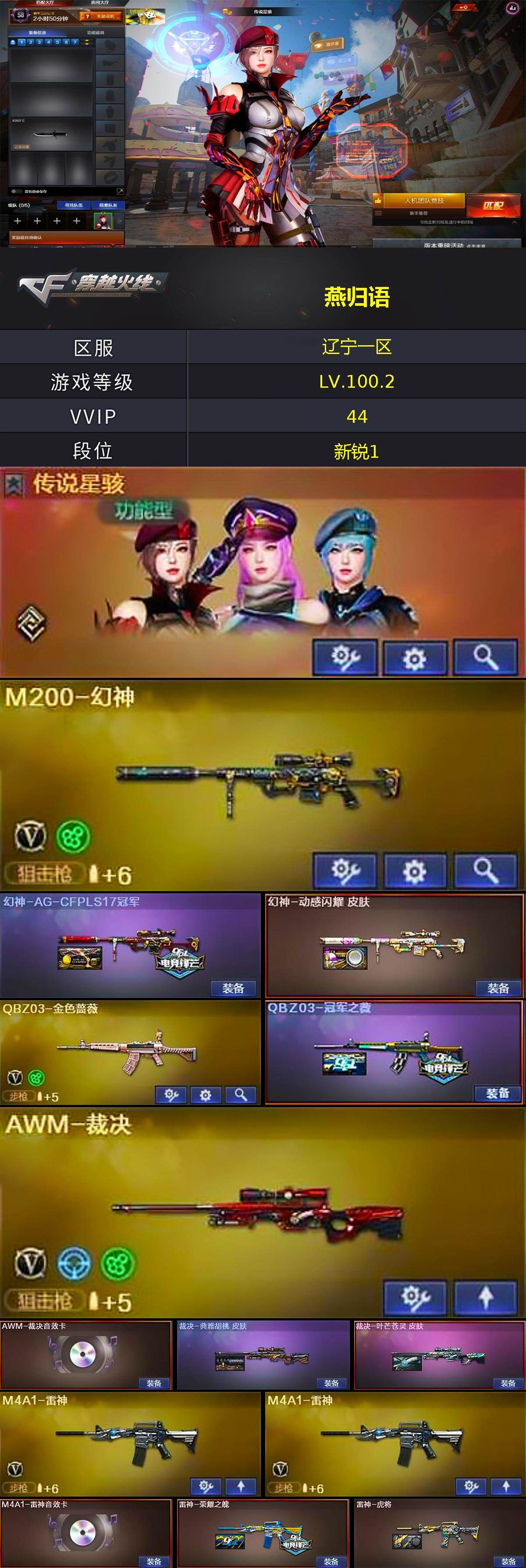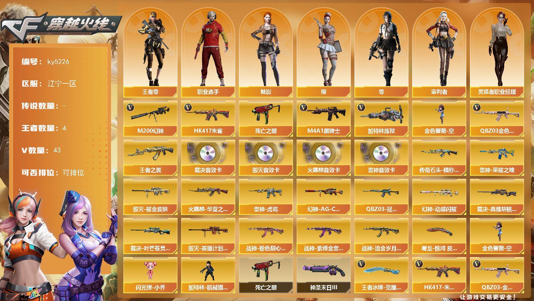 [16126422]辽宁一区-43V-4王者-0炫金 【传说角色】:传说星骇 【热门武器】:QBZ03-金色蔷薇,HK417-朱雀,M200-幻神,死亡之眼,M4A1-黑骑士,加特林-炼狱*2,金色蔷薇-空 【王者炫金武器】:王者之翼 【音效卡】:AK47-火麒麟音效卡,M4A1-雷神音效卡,Barrett-毁灭音效卡,AWM-裁决音效卡 【皮肤】:幻神-AG-CFPLS17冠军,幻神-动感闪耀 皮肤,QBZ03-冠军之薇,裁决-典雅胡桃 皮肤,裁决-叶芒苍灵 皮肤,雷神-荣耀之魄,雷神-虎将,火麒麟-华夏之心,传奇石头-横秒之巅,毁灭耀金皮肤,毁灭-英雄计划 皮肤,战神-粉色甜心皮肤,战神-紫绶金章皮肤,战神-流金岁月皮肤,屠龙-惊鸿 皮肤 【角色】:零,樱,魅影,审判者,王者-零,乔伊教练,暗夜-X,初恋灵狐,娟娟,0号玩家,零-水下丽影,灵狐者-黄金海岸,灵狐者-职业经理,潘多拉-X,潘多拉-甜心教官,潜龙队-X,职业选手,智影 【人偶武器】:金色蔷薇-空,加特林-机械猎手,闪光弹-小乔 【暴走生化】:死亡之眼 【挑战大师】:神圣爆裂者-末日III 【英雄级武器】:AK47-火麒麟,M4A1-黑龙*2,M4A1-雷神*2,M4A1-黑骑士,AK47-黑鲨,HK417-朱雀,无影-神兵利器,M4A1-玫瑰精灵*2,QBZ03-金色蔷薇,AK-47-猩红传说,AK47-B-战神,Barrett-毁灭,AWM-裁决,M200-幻神,王者之怒-觉醒版,王者之光-觉醒版,加特林-炼狱*2,沙鹰-天神*3,屠龙*3,龙啸,麒麟刺-堕天神*2,麒麟刺,幻灵之锋,王者冰锋-觉醒版,高爆手雷-堕天神,高爆手雷-幻灵,手雷-动感闪耀,闪光弹-雷暴,闪光弹-堕天神,闪光弹-幻灵,烟雾弹-堕天神,烟雾弹-幻灵,M4A1-赤狱骑士 【道具】:亚洲杯纪念炫彩背包,超级背包,女皇终结者-魔龙之吻,救世主-黑桃战神,绿色巨人,灵魂忍者,迷雾幽灵,生化弹匣,夺命之镰,防化服*2,金色流光-枪王排位,枪王排位28赛季金色流光,防弹头盔*4,防弹衣*4,C4工具钳*4,手雷包*4 【特殊枪械】:1黑骑士,2炼狱