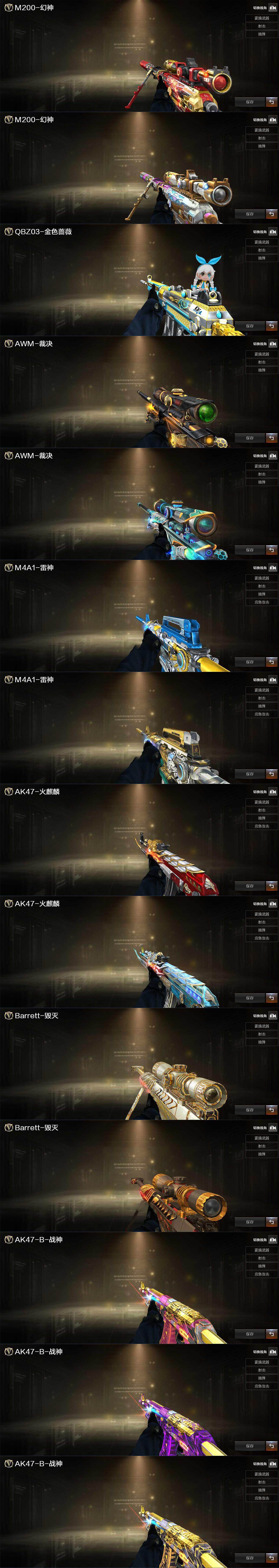 【皮肤】:幻神-AG-CFPLS17冠军,幻神-动感闪耀 皮肤,QBZ03-冠军之薇,裁决-典雅胡桃 皮肤,裁决-叶芒苍灵 皮肤,雷神-荣耀之魄,雷神-虎将,火麒麟-华夏之心,传奇石头-横秒之巅,毁灭耀金皮肤,毁灭-英雄计划 皮肤,战神-粉色甜心皮肤,战神-紫绶金章皮肤,战神-流金岁月皮肤,屠龙-惊鸿 皮肤
