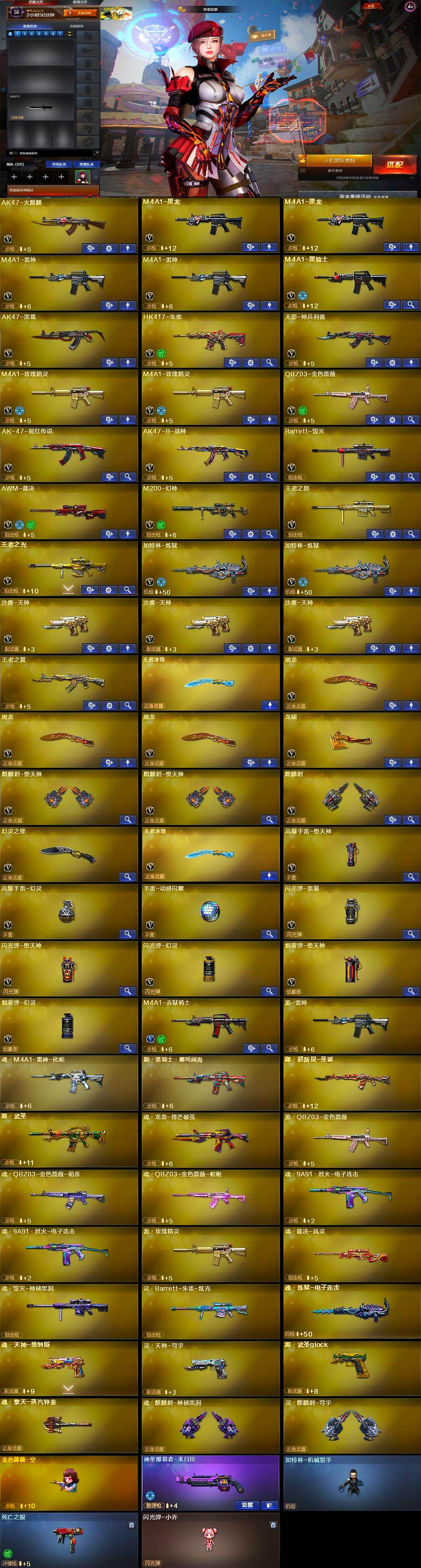 【英雄级武器】:AK47-火麒麟,M4A1-黑龙*2,M4A1-雷神*2,M4A1-黑骑士,AK47-黑鲨,HK417-朱雀,无影-神兵利器,M4A1-玫瑰精灵*2,QBZ03-金色蔷薇,AK-47-猩红传说,AK47-B-战神,Barrett-毁灭,AWM-裁决,M200-幻神,王者之怒-觉醒版,王者之光-觉醒版,加特林-炼狱*2,沙鹰-天神*3,屠龙*3,龙啸,麒麟刺-堕天神*2,麒麟刺,幻灵之锋,王者冰锋-觉醒版,高爆手雷-堕天神,高爆手雷-幻灵,手雷-动感闪耀,闪光弹-雷暴,闪光弹-堕天神,闪光弹-幻灵,烟雾弹-堕天神,烟雾弹-幻灵,M4A1-赤狱骑士