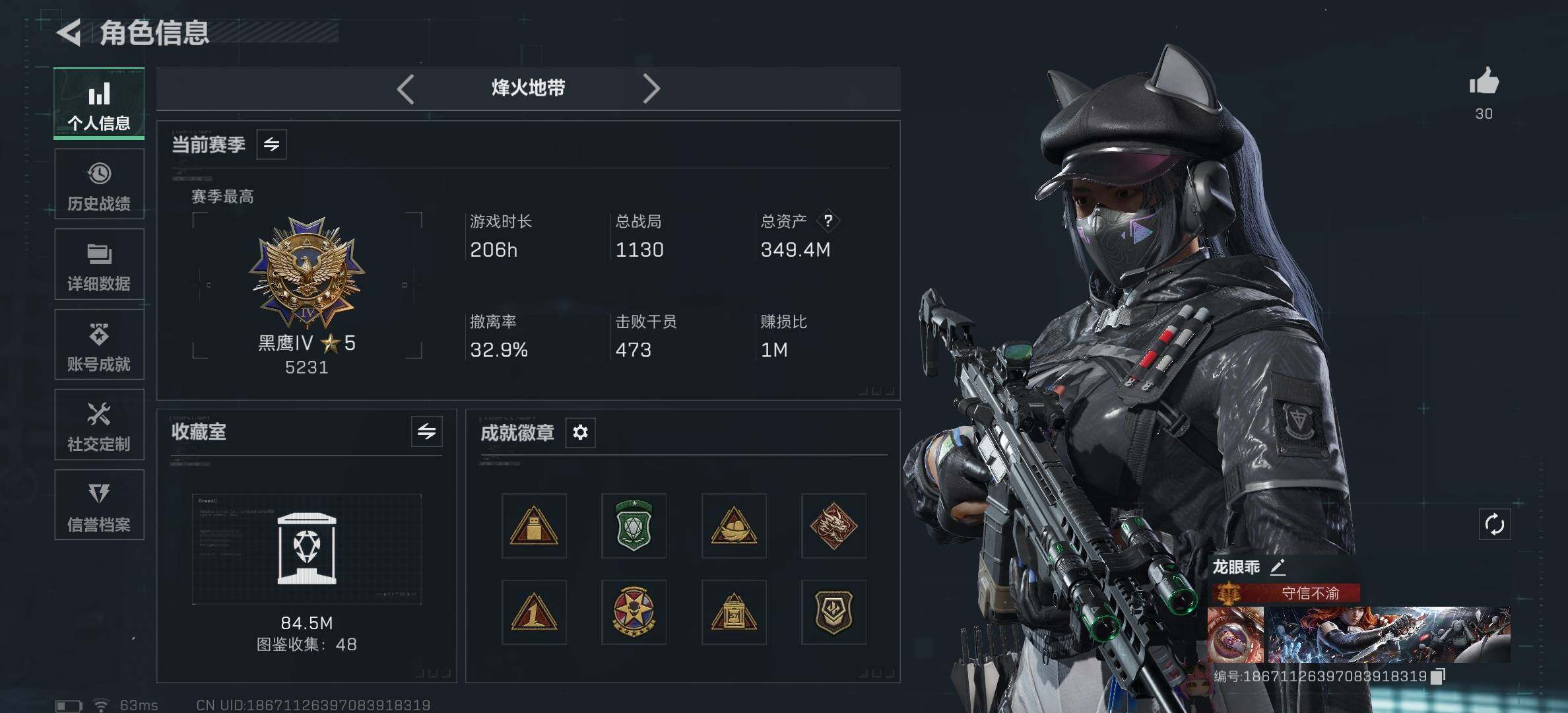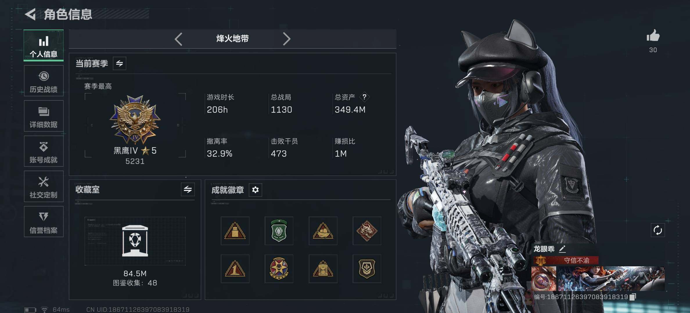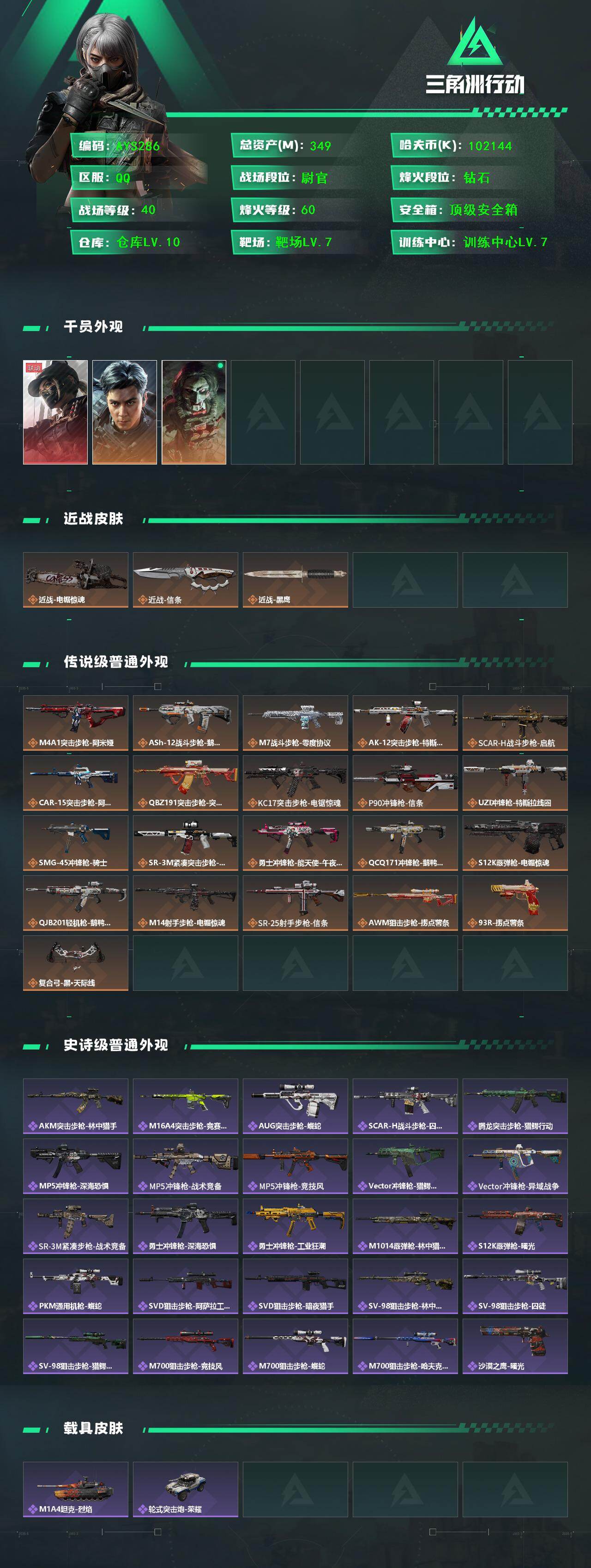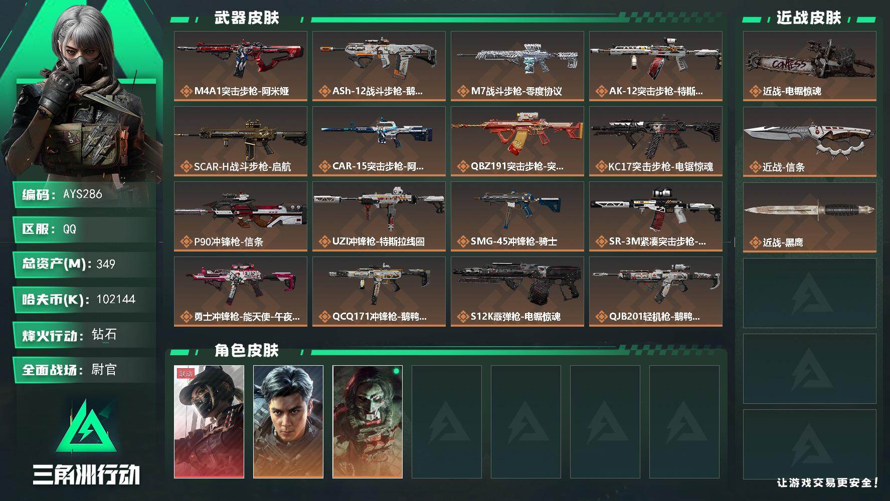 [16126991]【特价出售/店主推荐】349m总资产-102144k哈伏币-60烽火等级-钻石-40战场等级-尉官 【干员外观】:露娜-黑·天际线,威龙-飞虎,红狼-电锯惊魂 【近战皮肤】:近战-电锯惊魂,近战-信条,近战-黑鹰 【传说外观】:M4A1突击步枪-阿米娅,ASh-12战斗步枪-鹅鸭杀,M7战斗步枪-零度协议,AK-12突击步枪-特斯拉线圈,SCAR-H战斗步枪-启航,CAR-15突击步枪-阿米娅,腾龙突击步枪-捞点薯条,KC17突击步枪-电锯惊魂,P90冲锋枪-信条,UZI冲锋枪-特斯拉线圈,SMG-45冲锋枪-骑士,SR-3M紧凑突击步枪-特斯拉线圈,勇士冲锋枪-能天使-午夜邮差,QCQ171冲锋枪-鹅鸭杀,S12K霰弹枪-电锯惊魂,QJB201轻机枪-鹅鸭杀,M14射手步枪-电锯惊魂,SR-25射手步枪-信条,AWM狙击步枪-捞点薯条,93R-捞点薯条,复合弓-黑·天际线 【史诗外观】:AKM突击步枪-林中猎手,M16A4突击步枪-竞赛选手,AUG突击步枪-蝮蛇,SCAR-H战斗步枪-囚徒,腾龙突击步枪-猎鳄行动,MP5冲锋枪-深海恐惧,MP5冲锋枪-战术竞备,MP5冲锋枪-竞技风,Vector冲锋枪-猎鳄行动,Vector冲锋枪-异域战争,SR-3M紧凑突击步枪-战术竞备,勇士冲锋枪-深海恐惧,勇士冲锋枪-工业狂潮,M1014霰弹枪-林中猎手,S12K霰弹枪-曙光,PKM通用机枪-蝮蛇,SVD狙击步枪-阿萨拉工艺,SVD狙击步枪-暗夜猎手,SV-98狙击步枪-林中猎手,SV-98狙击步枪-囚徒,SV-98狙击步枪-猎鳄行动,M700狙击步枪-竞技风,M700狙击步枪-蝮蛇,M700狙击步枪-哈夫克警备,沙漠之鹰-曙光 【稀有外观】:AKM突击步枪-青纹,QBZ95-1突击步枪-花岗岩,M1014霰弹枪-花岗岩,PKM通用机枪-黑潮,SG552突击步枪-天际线,AK-12突击步枪-极地勘察队,M700狙击步枪-旧梦,AKM突击步枪-浅鲨小队,AKM突击步枪-肃杀,QBZ95-1突击步枪-公平竞技,AKS-74U突击步枪-前沿科技,ASh-12战斗步枪-星链科技,ASh-12战斗步枪-哈夫克航天,M16A4突击步枪-街头涂鸦,AUG突击步枪-指挥官,AUG突击步枪-全金属外壳,M7战斗步枪-捣蛋鬼,SCAR-H战斗步枪-童趣,SCAR-H战斗步枪-荣耀列队,PTR